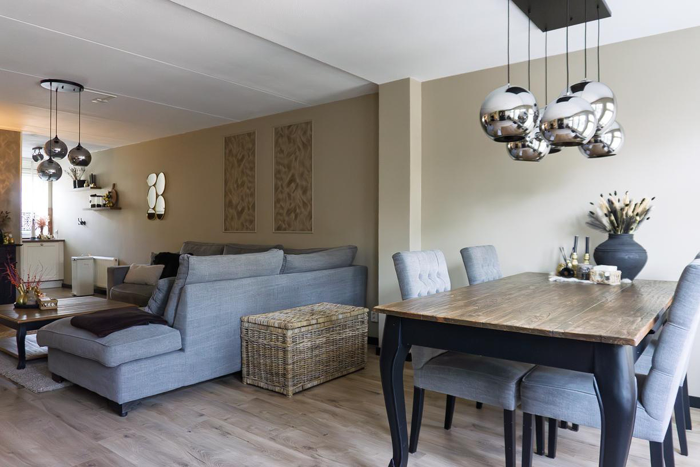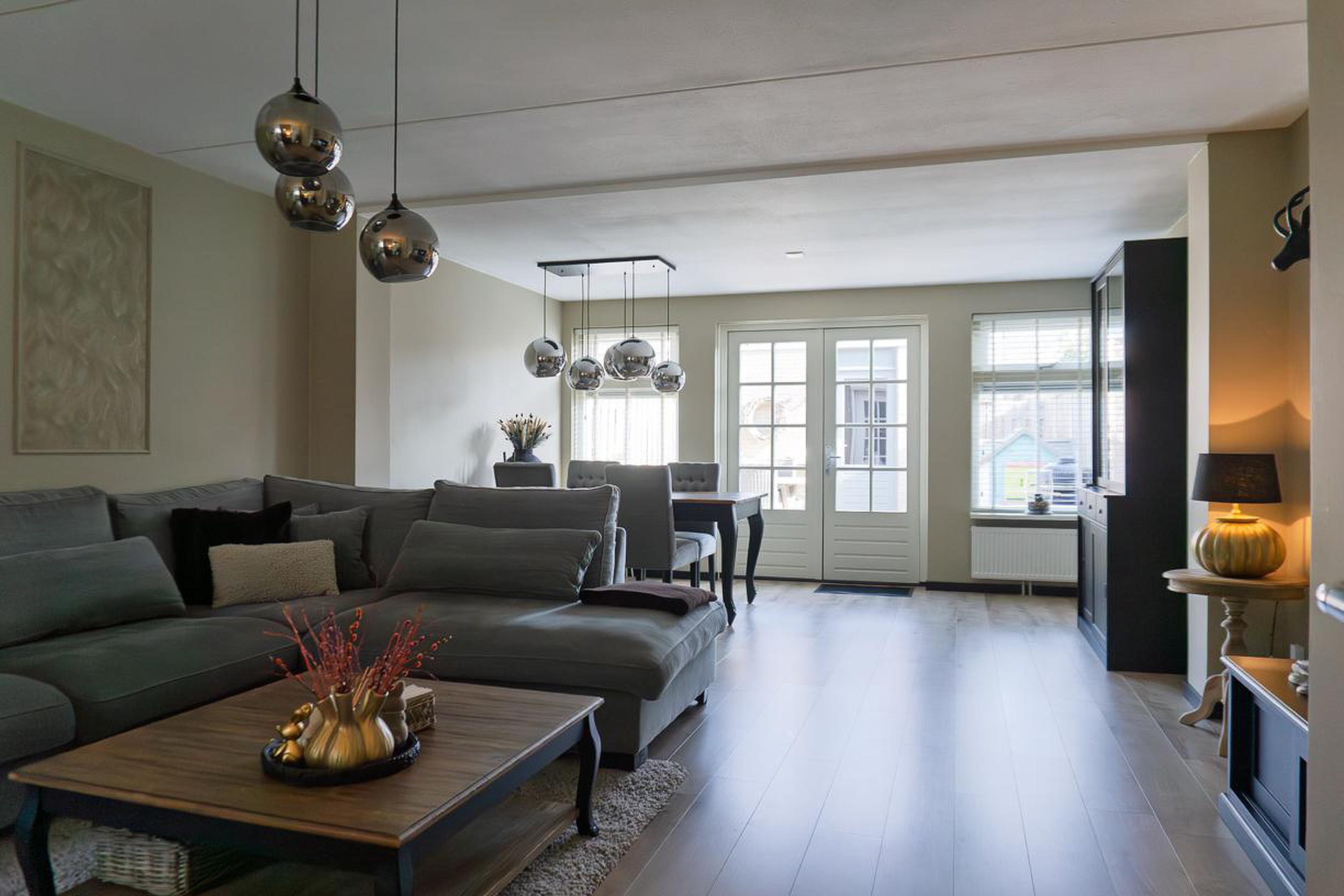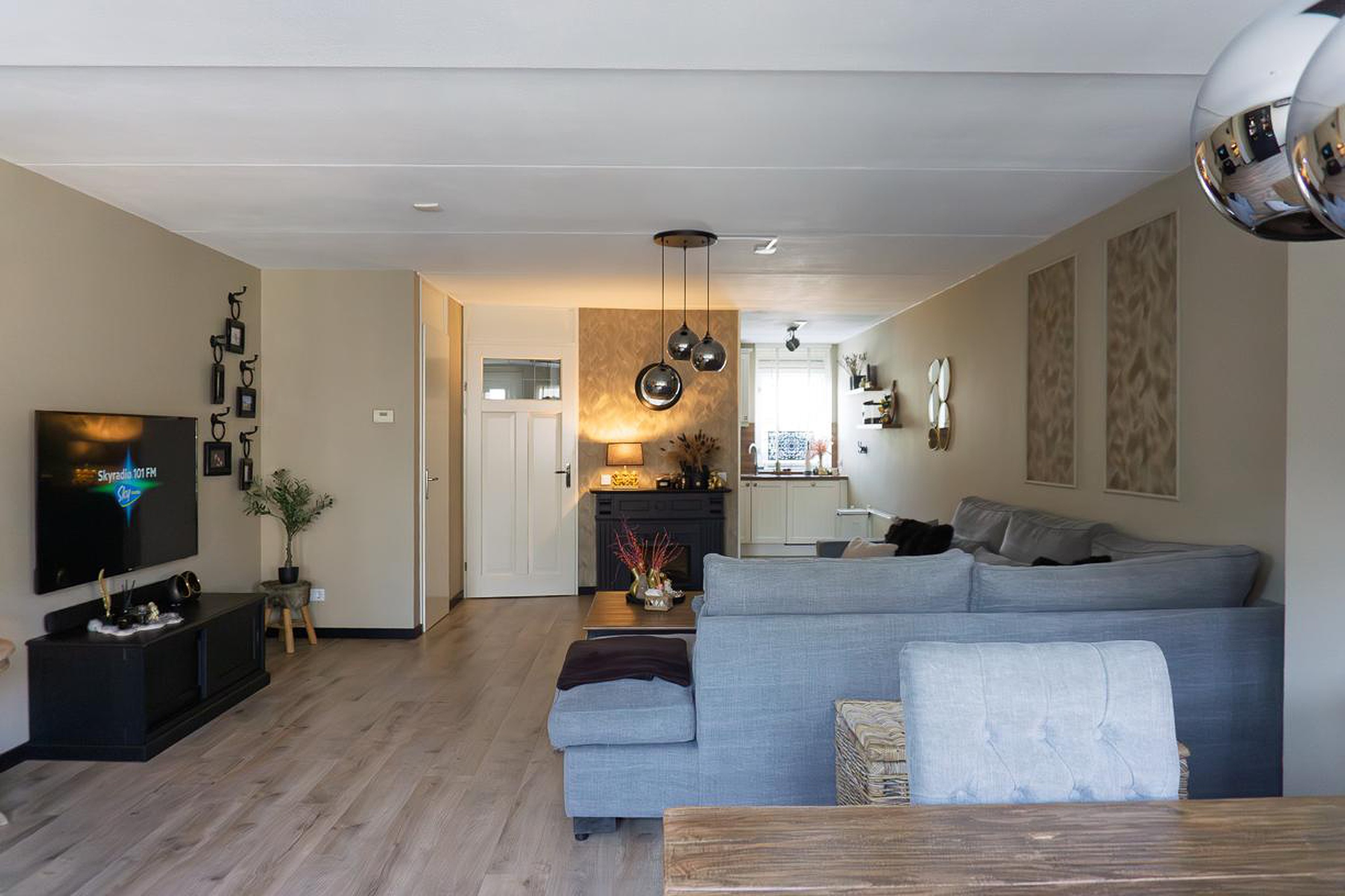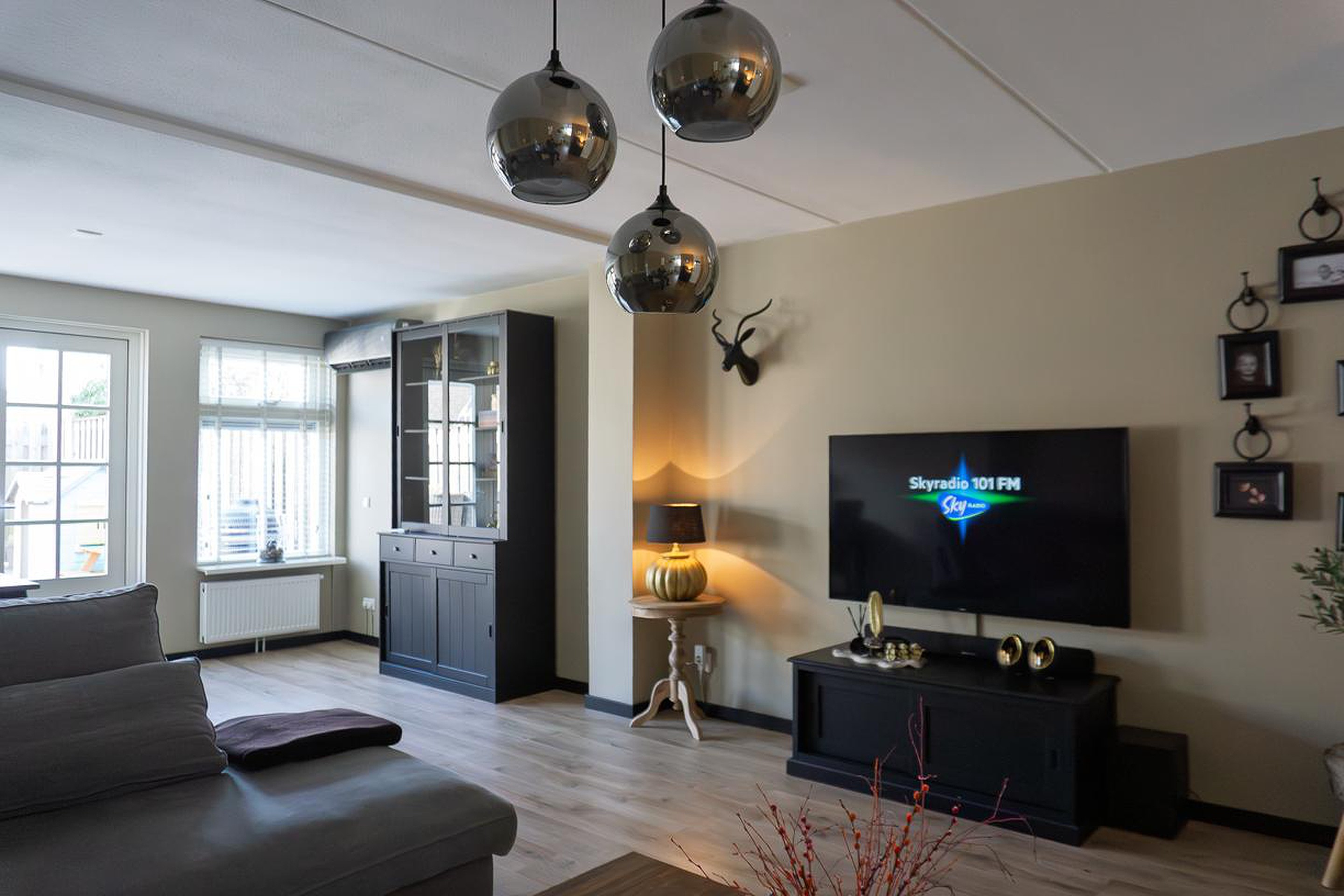 De woonkamer is door de uitbouw riant te noemen en met moderne kleuren afgewerkt. Aan de achterzijde van de woonkamer zijn tuindeuren aanwezig die de verbinding maken met de achtertuin. In de woonkamer bevindt zich een vaste kast (onder de trap). De woonkamer staat in open verbinding met de keuken die aan de voorzijde van de woning is gelegen. De afwerking van de woonkamer bestaat uit strak gestucte wanden, een gespoten plafond en laminaat op de vloer. In de woonkamer is een airco aanwezig die zowel kan koelen als verwarmen.