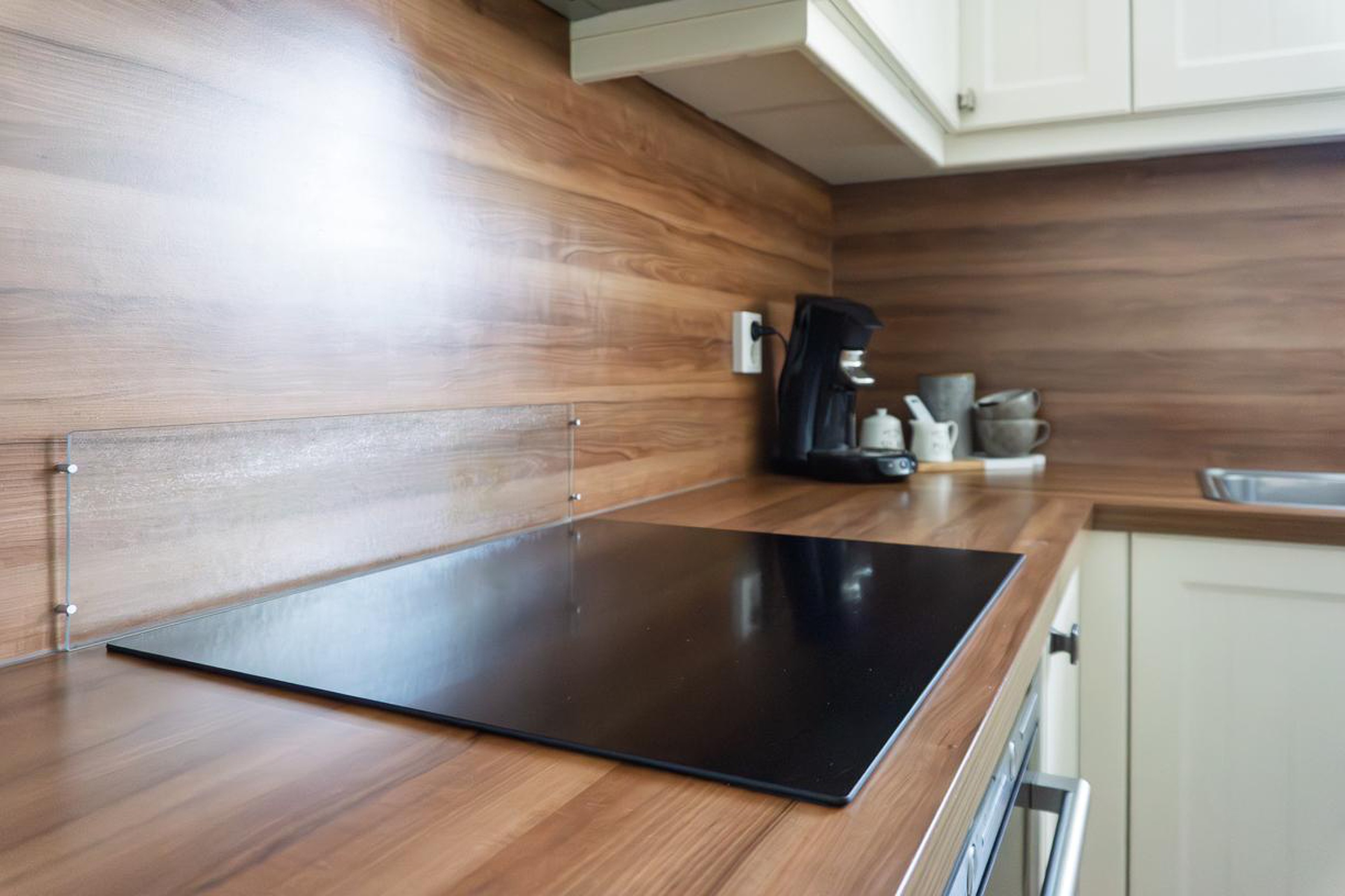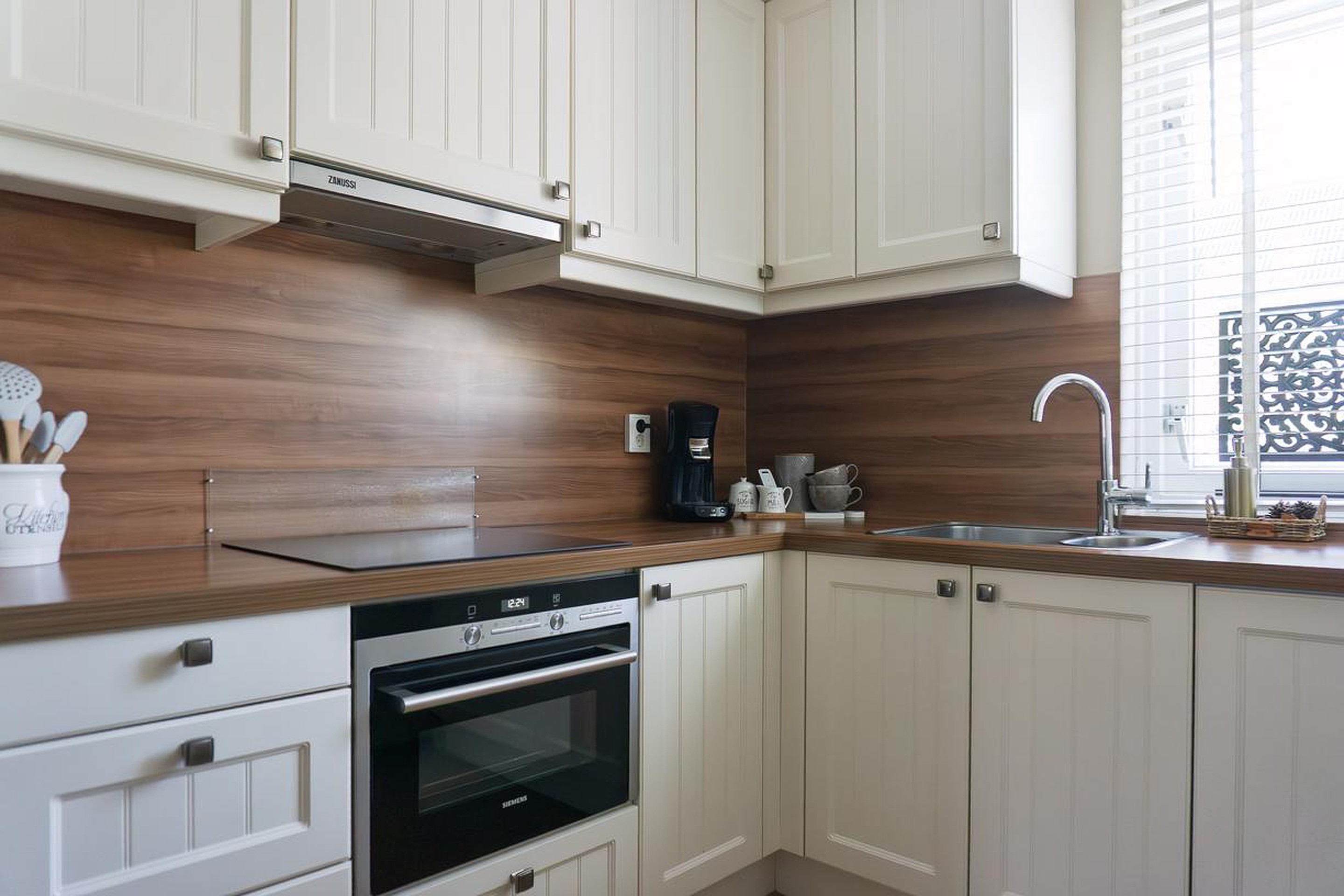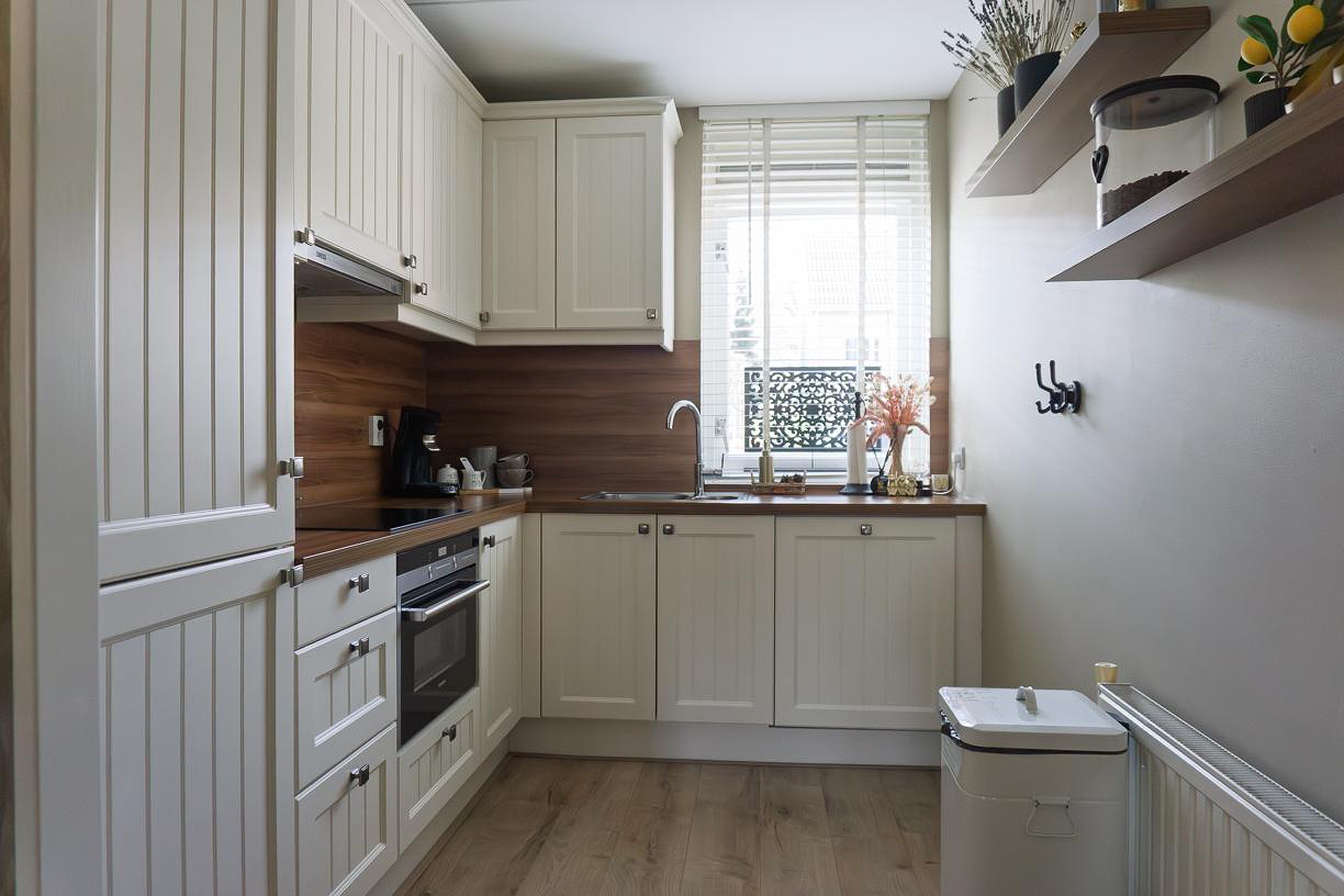 De aan de voorzijde van de woning gelegen keuken beschikt over een hoek opgesteld keukenblok met onder- en bovenkasten, kunststof werkblad, spoelbak en mengkraan. Ingebouwd zijn een 4-pits inductiekookplaat met hierboven de afzuigkap, een vaatwasser, een koel-/vriescombinatie en een combi-oven/grill/magnetron. De achterwand tussen bovenkasten en werkblad is afgewerkt met hetzelfde materiaal als van het werkblad. Verder is de keuken afgewerkt met strak gestucte wanden, een gespoten plafond en laminaat op de vloer.