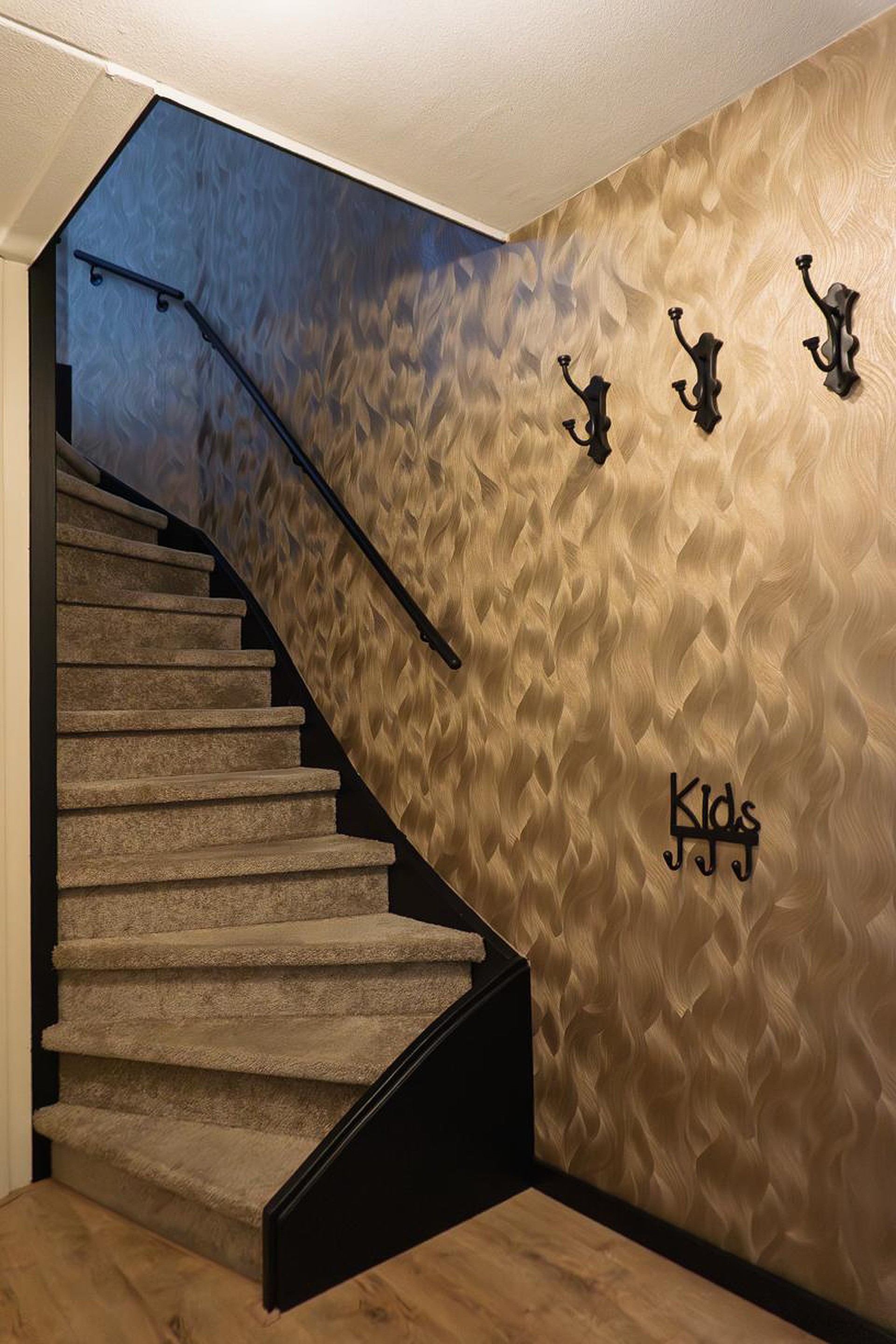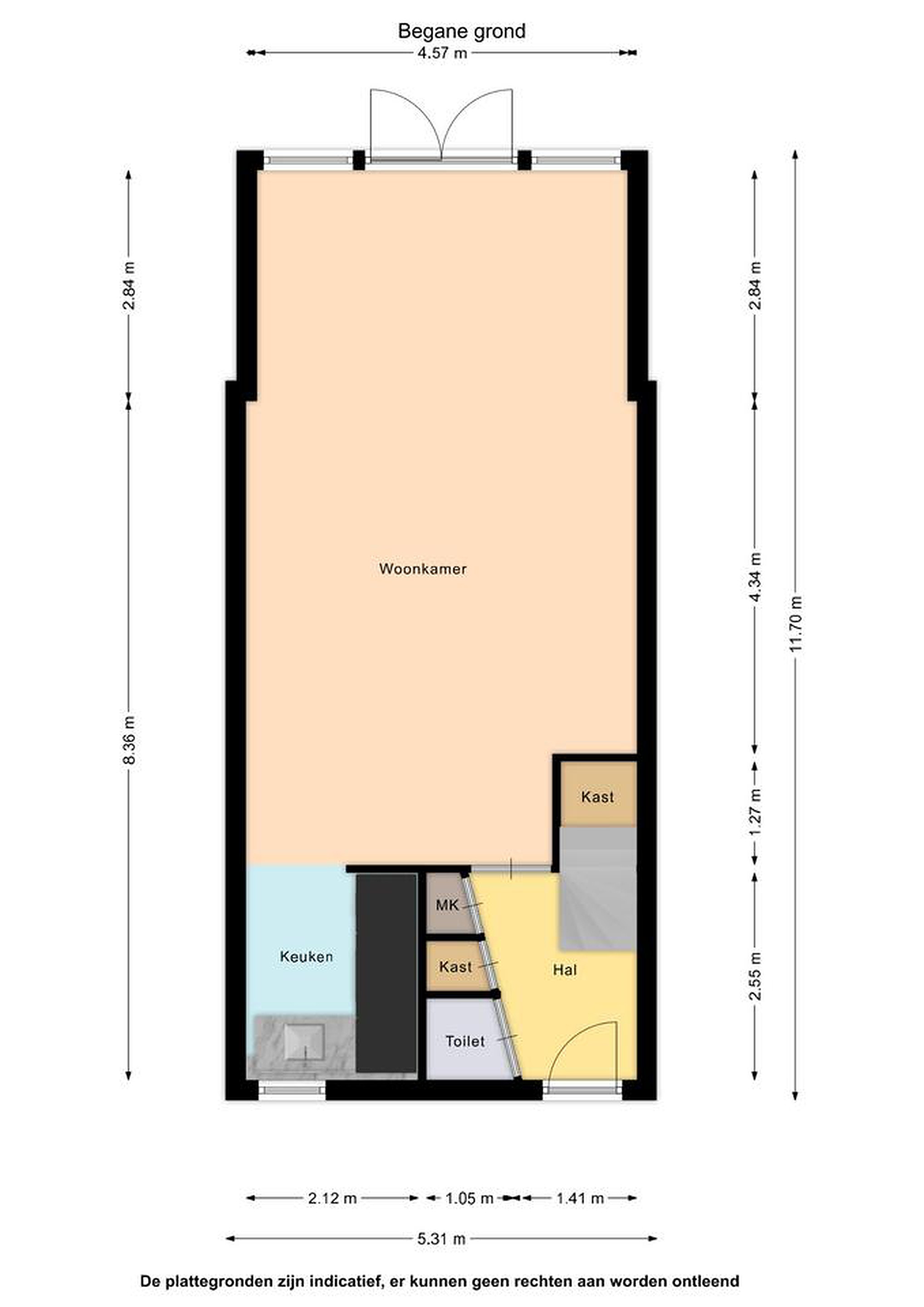 De woning wordt betreden in de hal waar zich het toilet, de trapopgang naar de 1e verdieping, een bergkast en de meterkast bevinden. De meterkast beschikt over 6 elektragroepen, 2 aardlekschakelaars en een PVB-groep. De hal is mooi afgewerkt met behang op de wanden, een gespoten plafond en laminaat op de vloer.