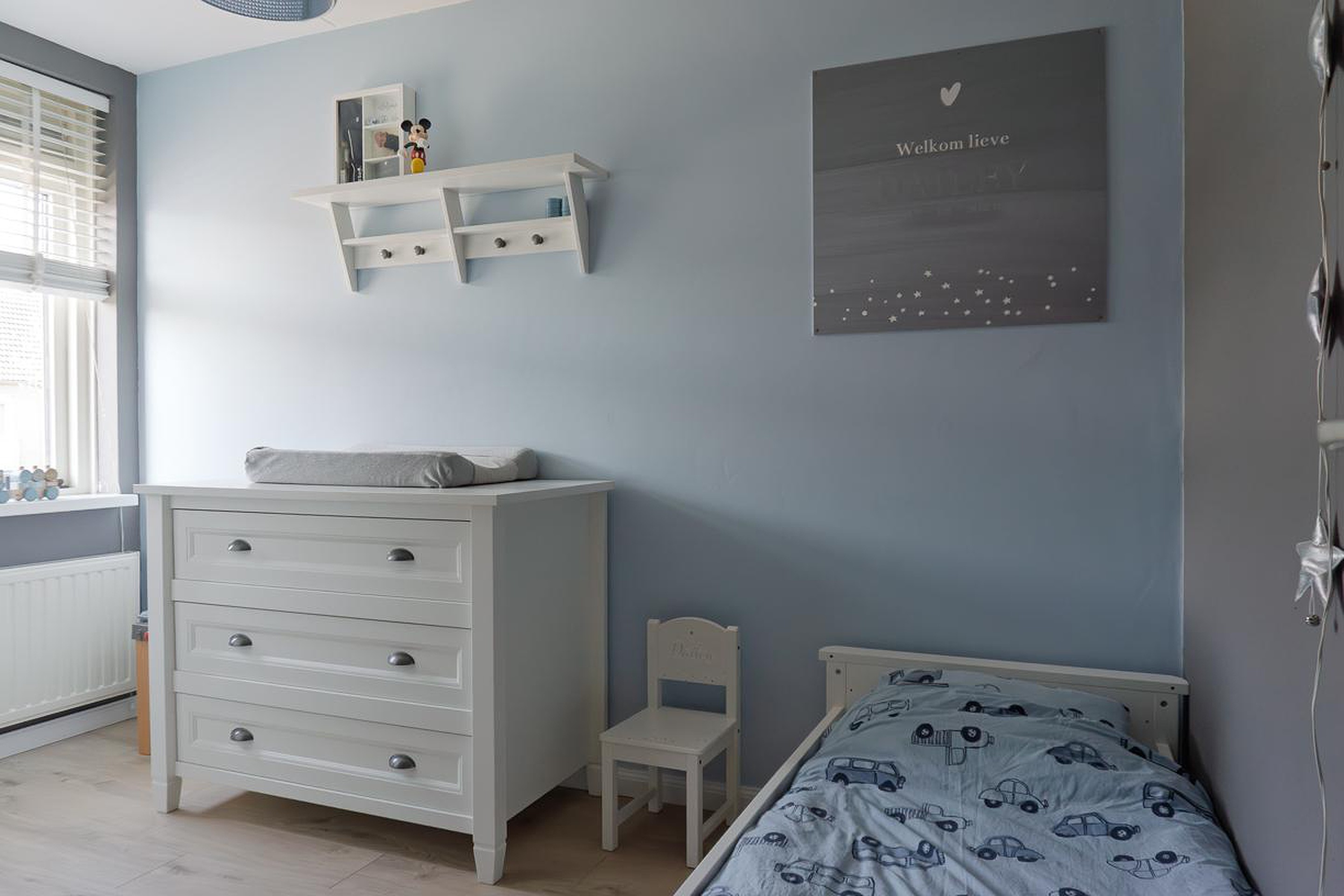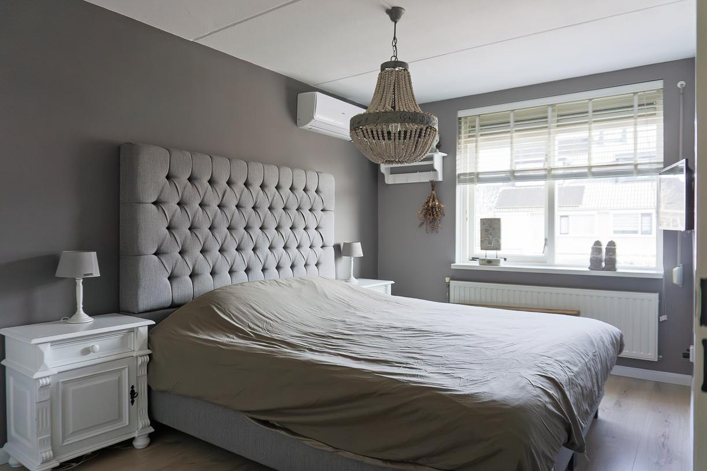 Deze slaapkamer is aan de achterzijde van de woning gelegen en afgewerkt met strak gestucte wanden, een gespoten plafond en laminaat op de vloer. In deze slaapkamer is een airco aanwezig die kan koelen en verwarmen.