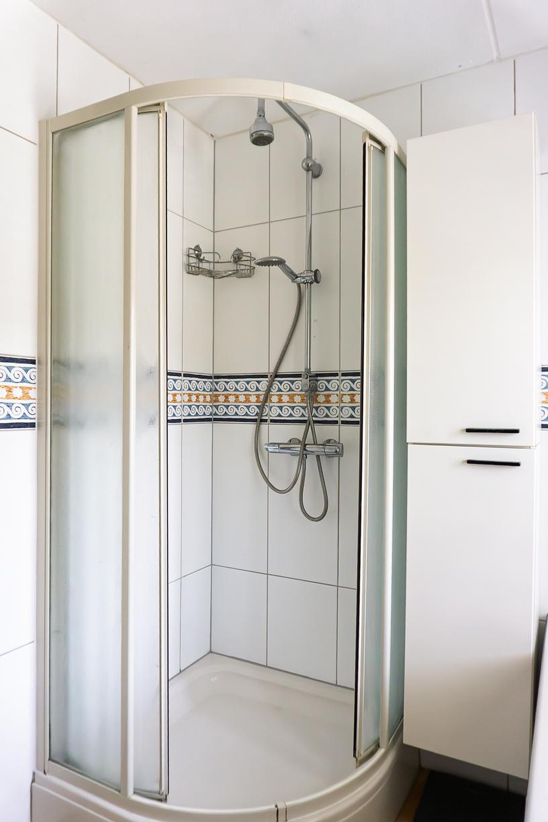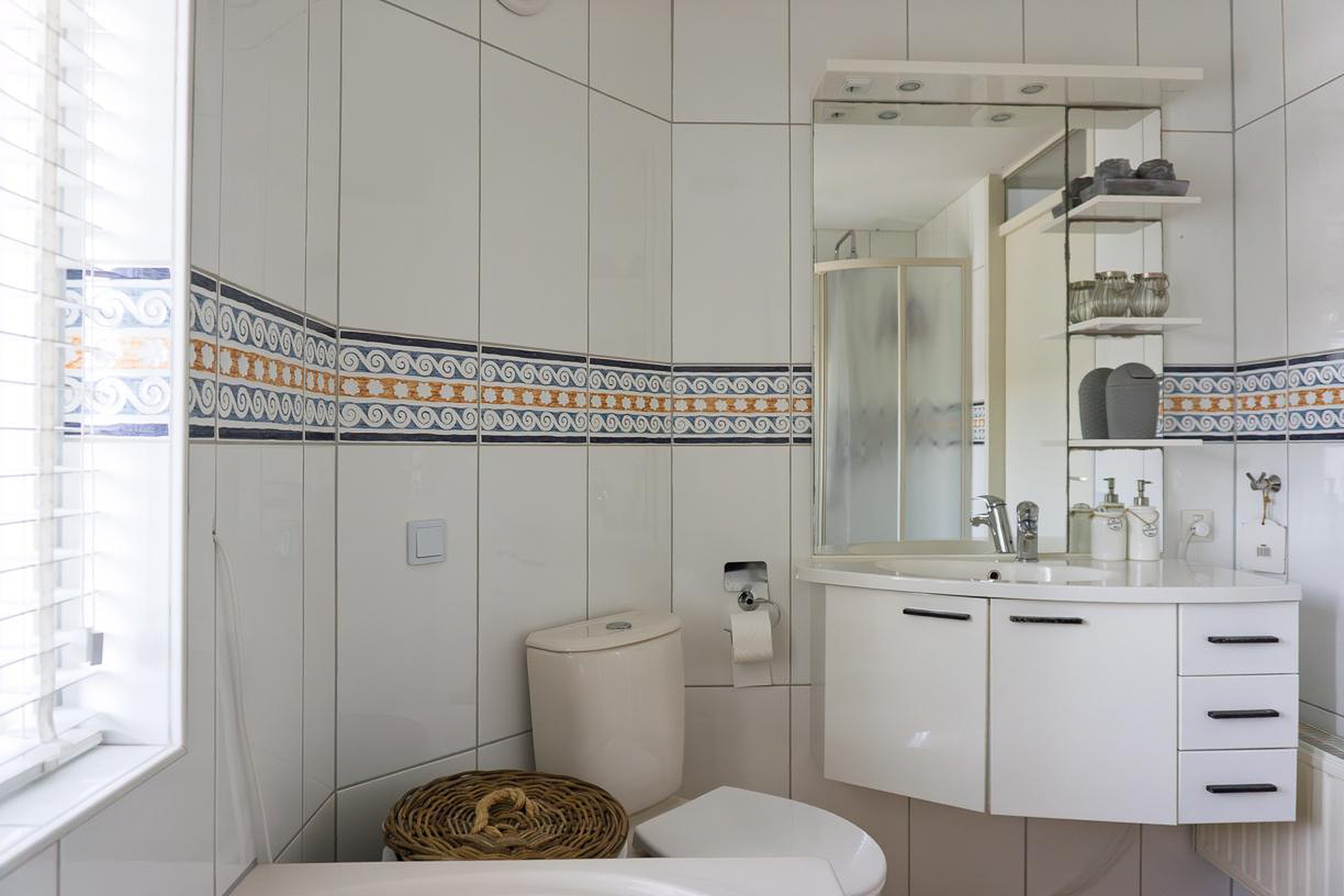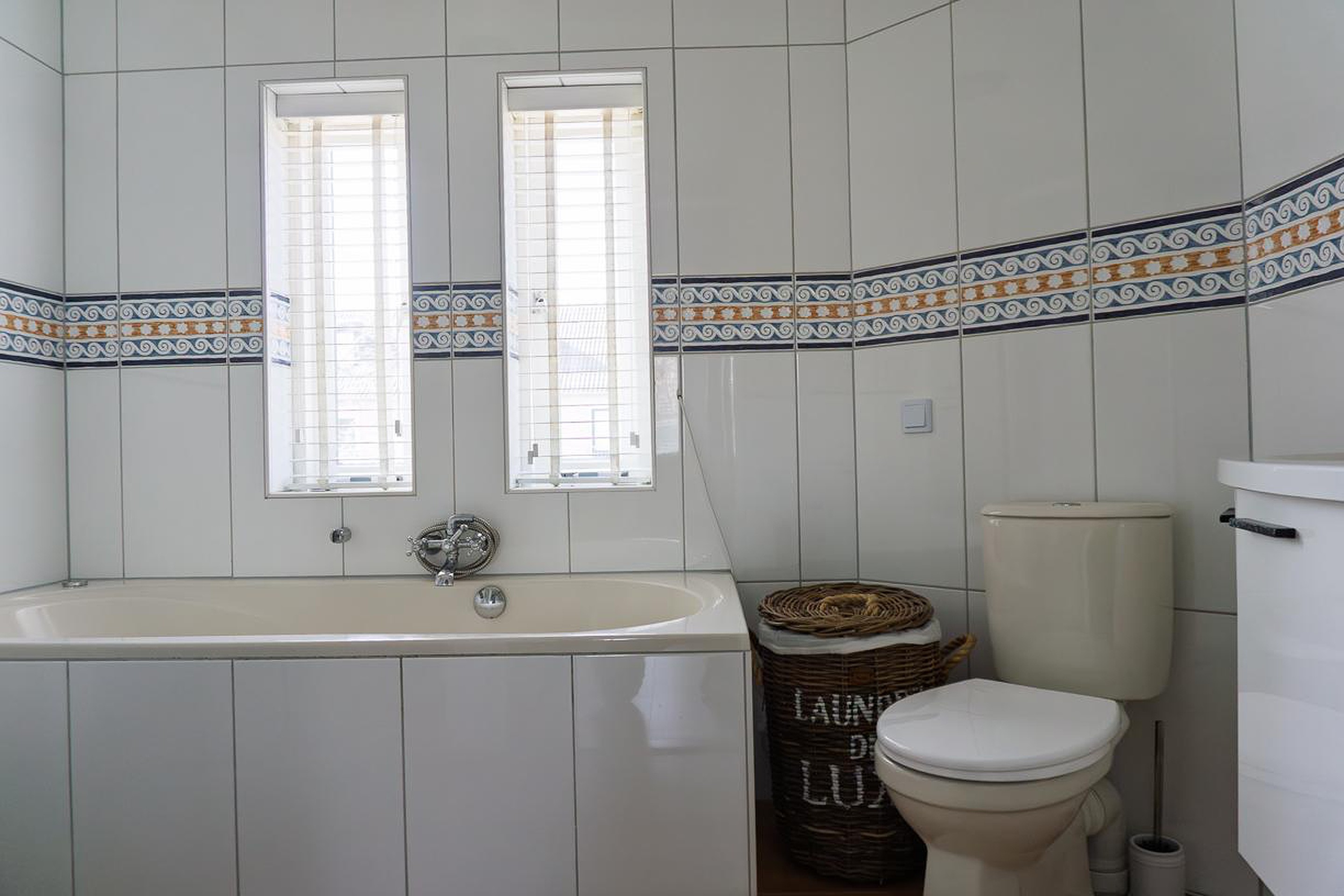 De badkamer ligt naast slaapkamer 3 aan de voorzijde van de woning. De badkamer beschikt over een ligbad, een instapdouche, toilet en wastafel ingebouwd in een wastafelmeubel. De vloer en de wanden van de badkamer zijn volledig betegeld en het plafond is afgewerkt met spuitwerk.