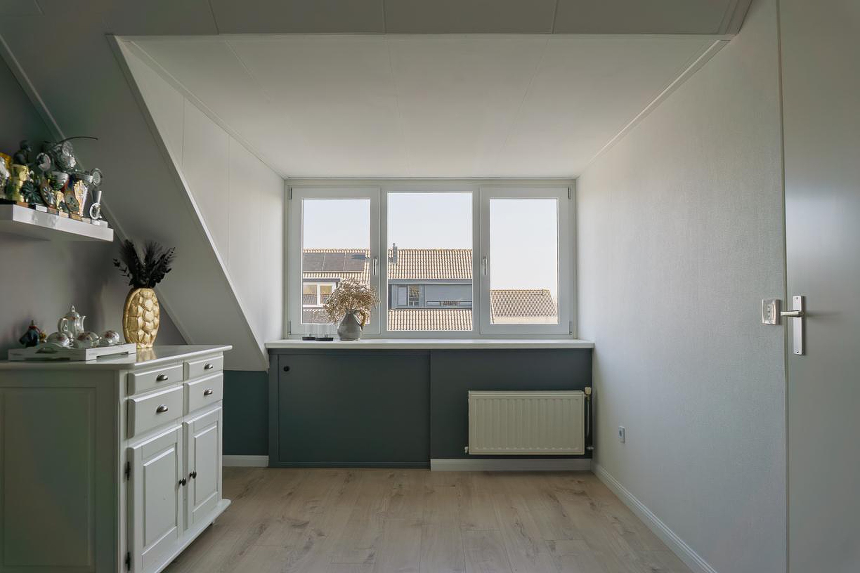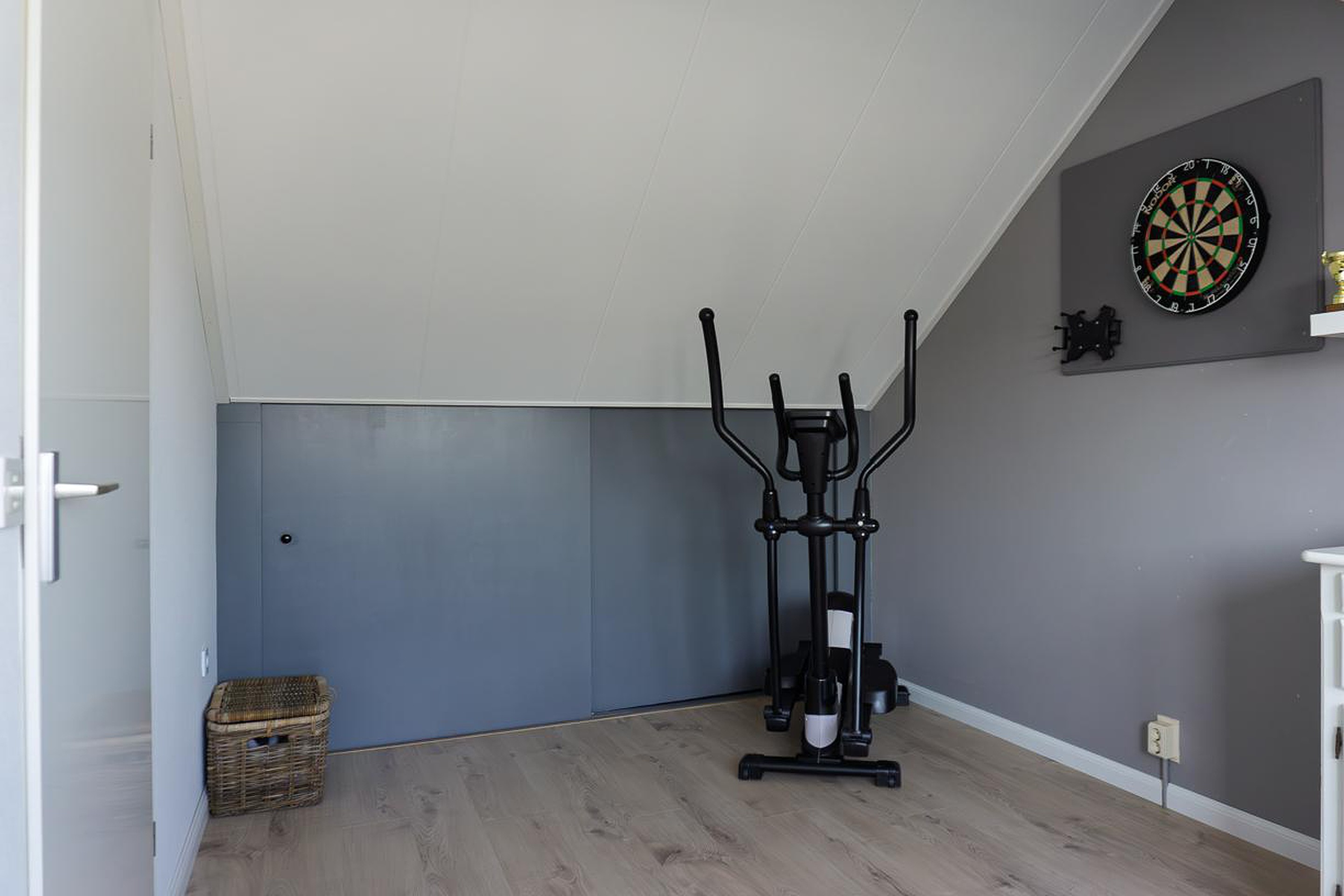 Deze slaapkamer lig onder het schuine dak van de woning. In de schuinten van het dakvlak zijn knieschotten aangebracht waarachter veel bergruimte schuilgaat. De slaapkamer is afgewerkt met behang op de wanden, laminaat op de vloer en het plafond bestaat uit de afgewerkte dakplaten en ter hoogte van de dakkapel uit gestucte gipsplaat.