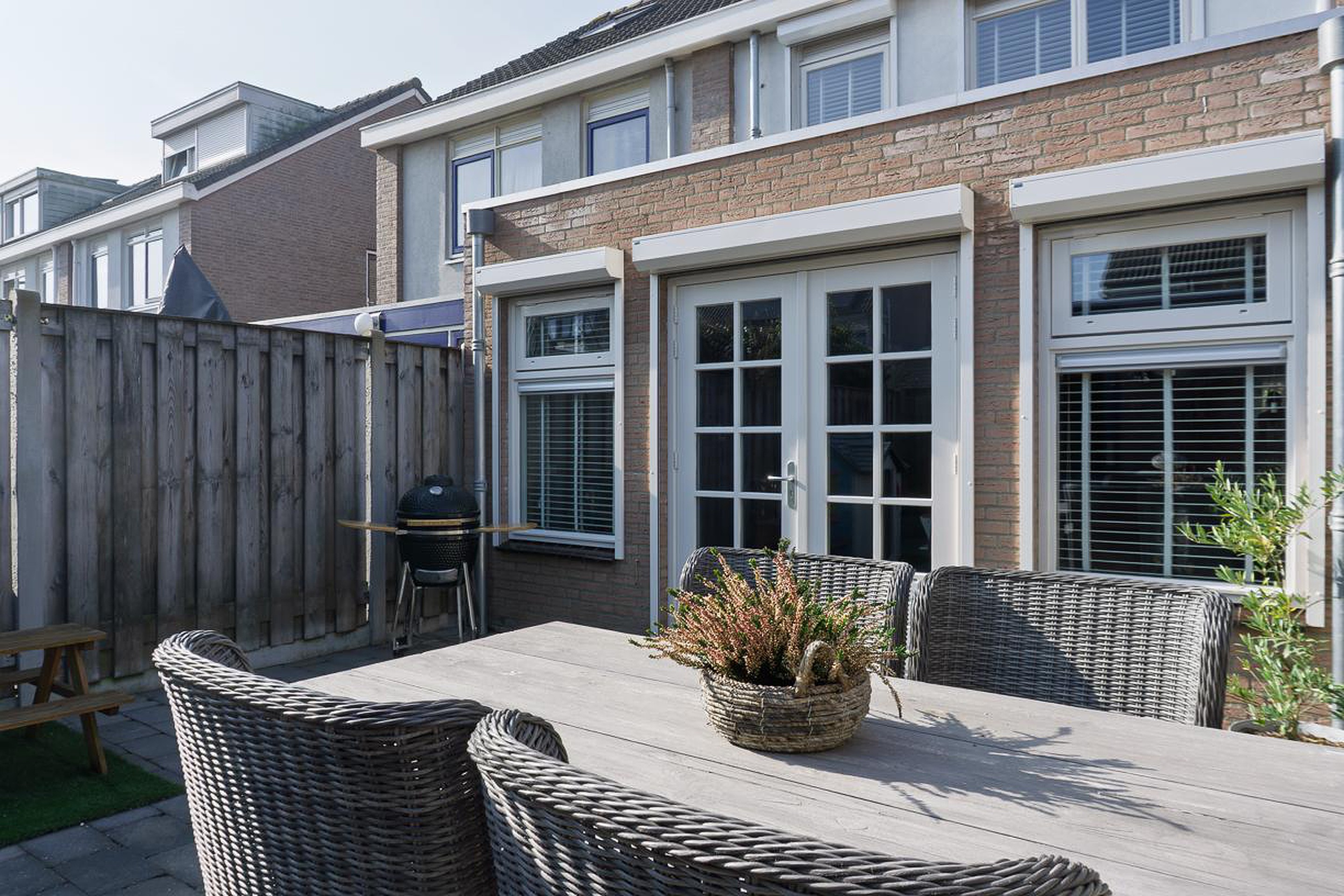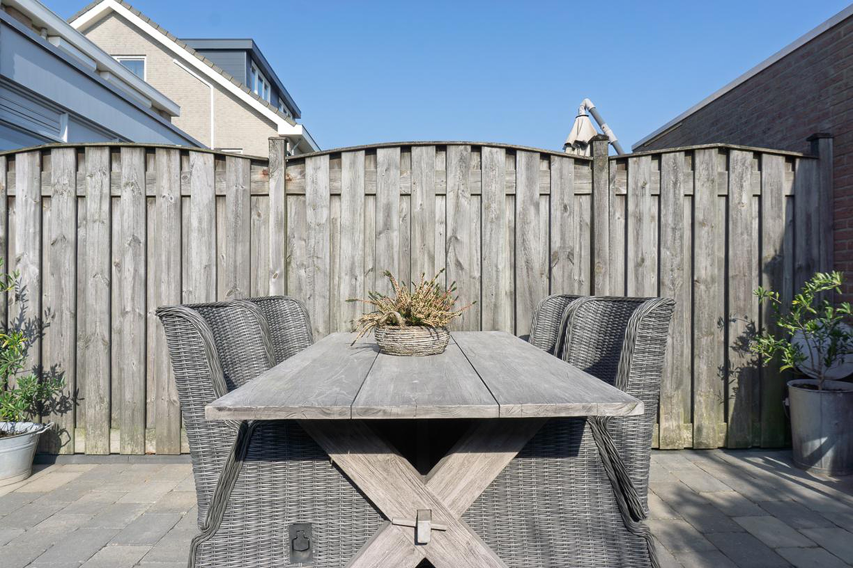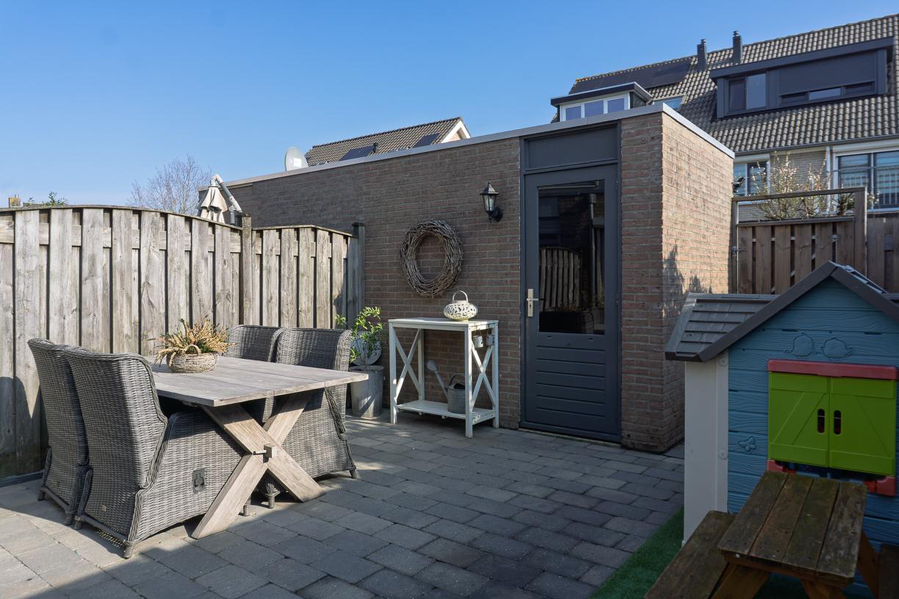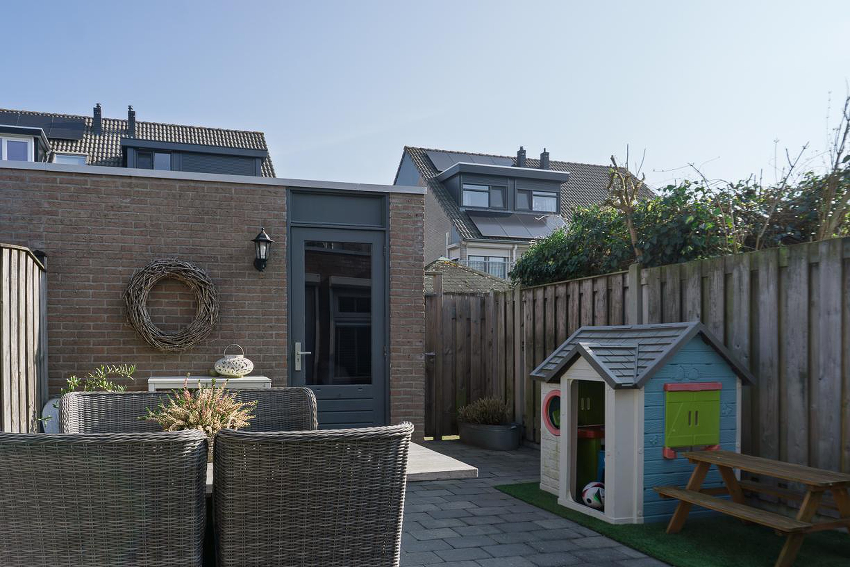 Tuin De achtertuin is toegankelijk via de woonkamer en is op oosten gelegen. De achtertuin is onderhoudsvriendelijk aangelegd met bestrating en omheind met een houten schutting tussen betonnen en houten palen. Achterin de tuin staat de stenen berging waarin elektra aanwezig is. Naast de berging bevindt zich de poort die toegang geeft tot de achter de woning gelegen brandgang.