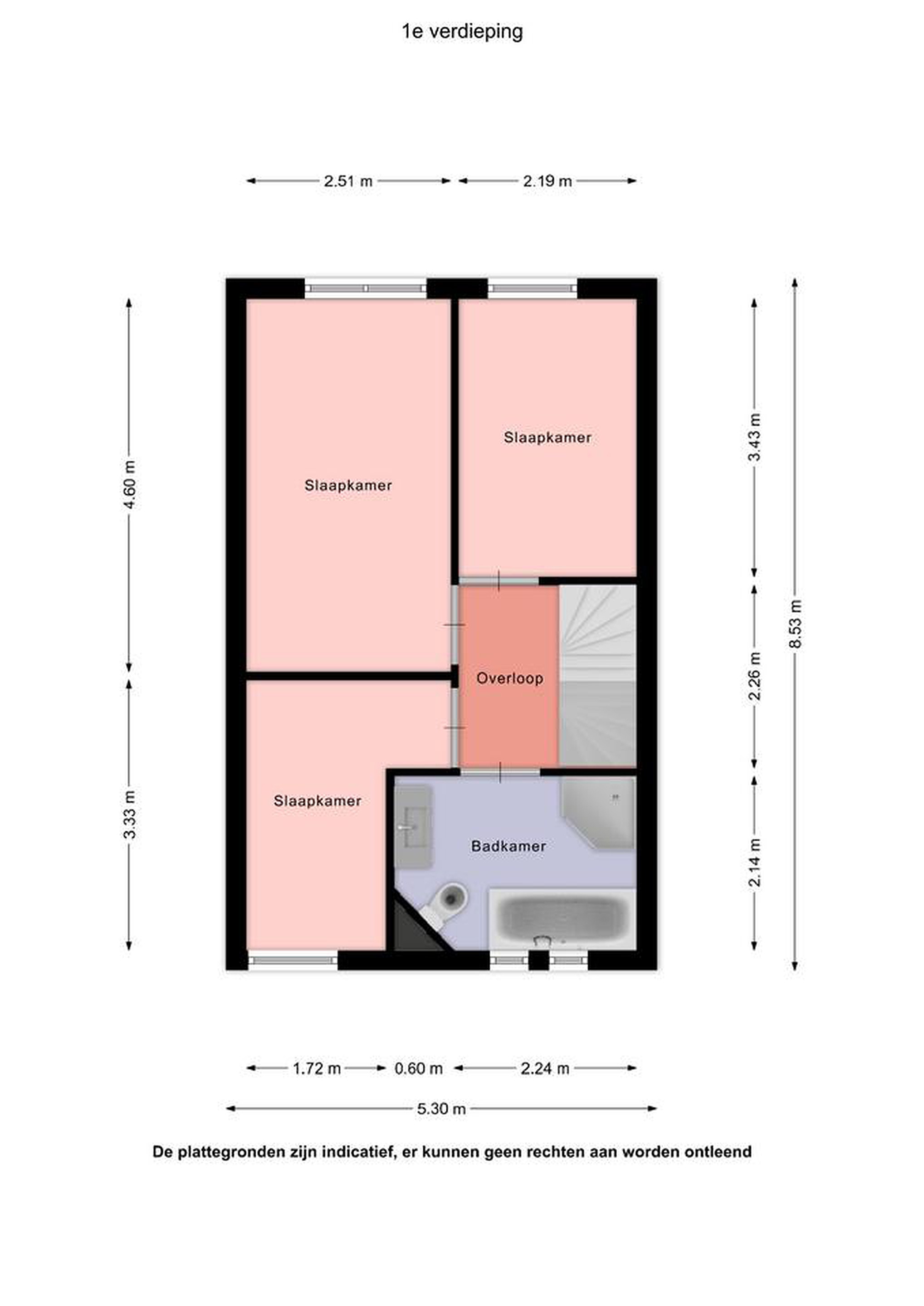 Eerste verdieping De trapopgang in de hal komt uit op de overloop van de 1e verdieping. De overloop geeft toegang tot 3 slaapkamer en de badkamer. De trapopgang naar de 2e verdieping bevindt zich ook op de overloop.