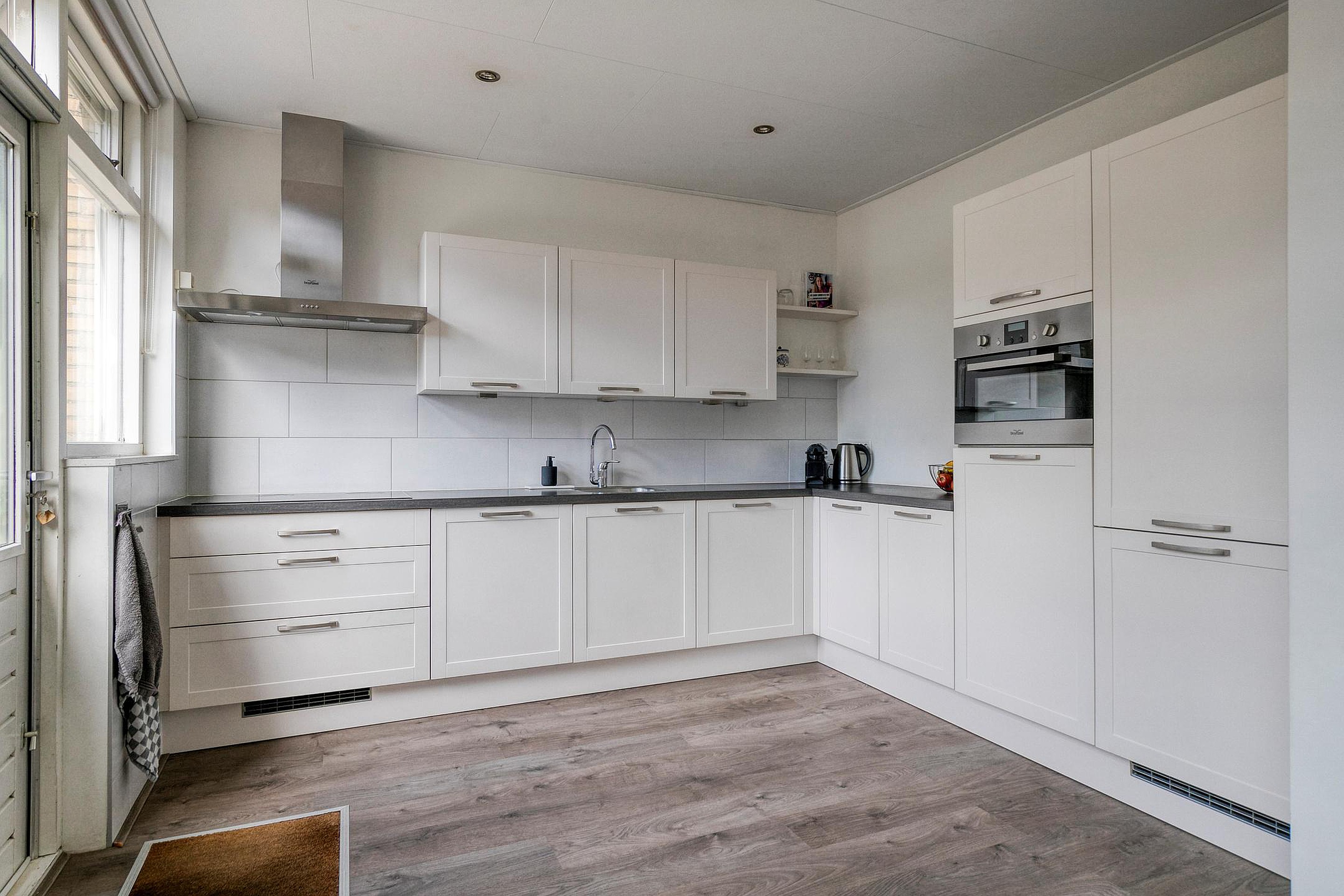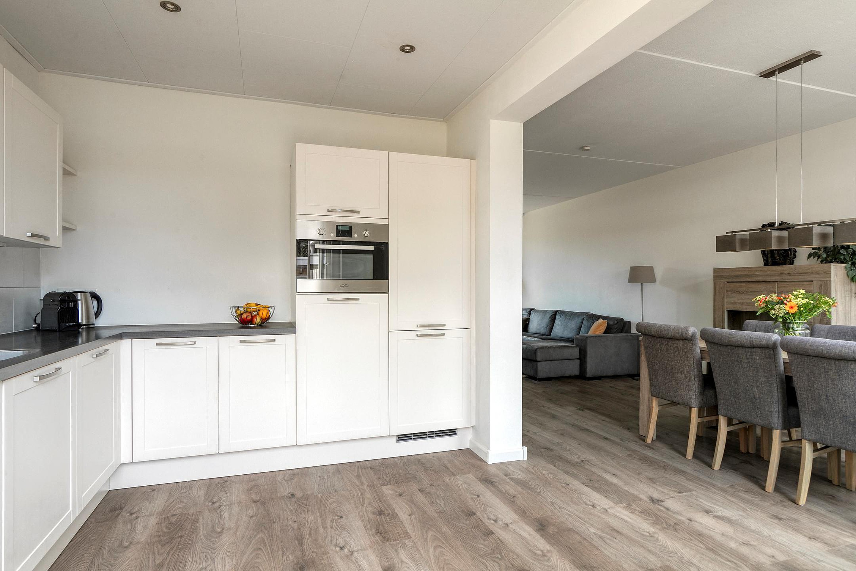 Ruime open keuken die keurig netjes is onderhouden. De lichte frontjes samen met het donkere kunststof werkblad zorgen voor een neutrale uitstraling, waardoor je met wat leuke accessoires de keuken helemaal eigen kunt maken. Er is voldoende bergruimte en werkruimte aan het aanrecht om de heerlijkste gerechten te bereiden. De keuken is voorzien van: