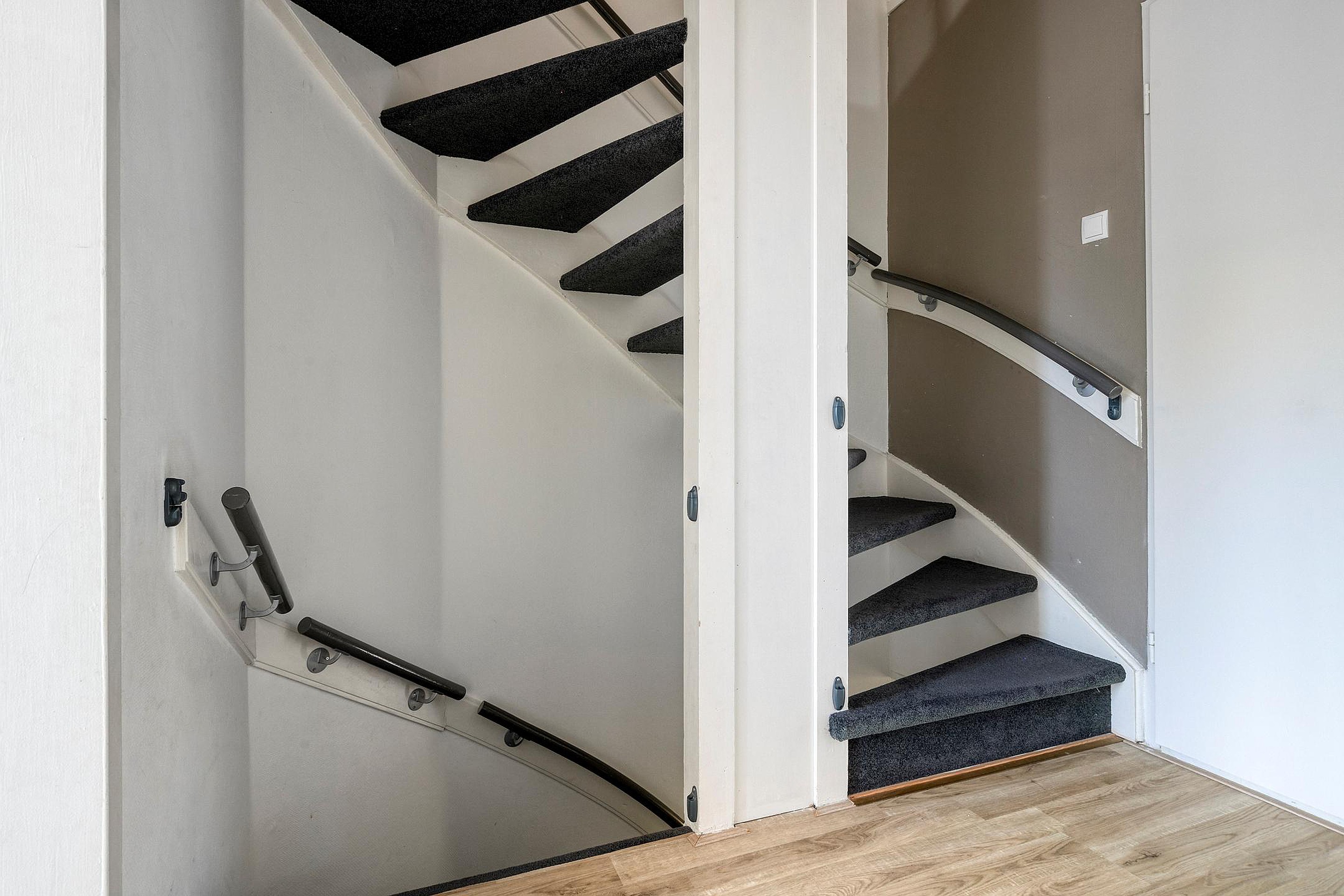 Prettige binnenkomst van de woning in deze ruim opgezette hal. De jassen kunnen makkelijk worden opgehangen zonder dat je er dwars doorheen loopt. De handige vaste kast zorgt voor berging van de stofzuiger en de schoenen. De hal geeft toegang tot de woonkamer, het toilet, de meterkast en de trapopgang.