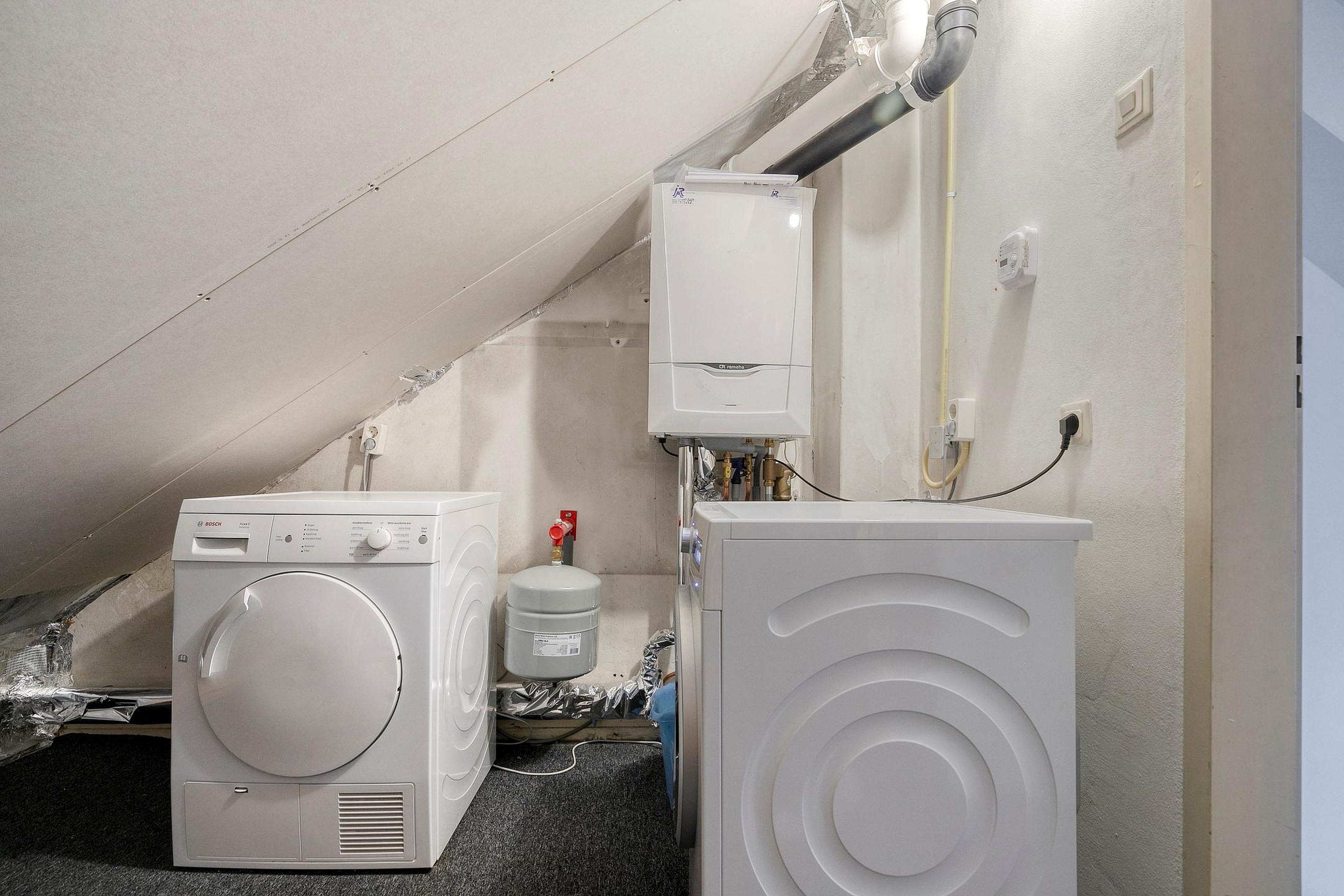 Praktische ruimte waar de wasmachine keurig kan staan net als de droger. Ook kun je hier het nodige in opbergen. De vrij recent geplaatste combiketel hangt keurig uit het zicht in deze ruimte.