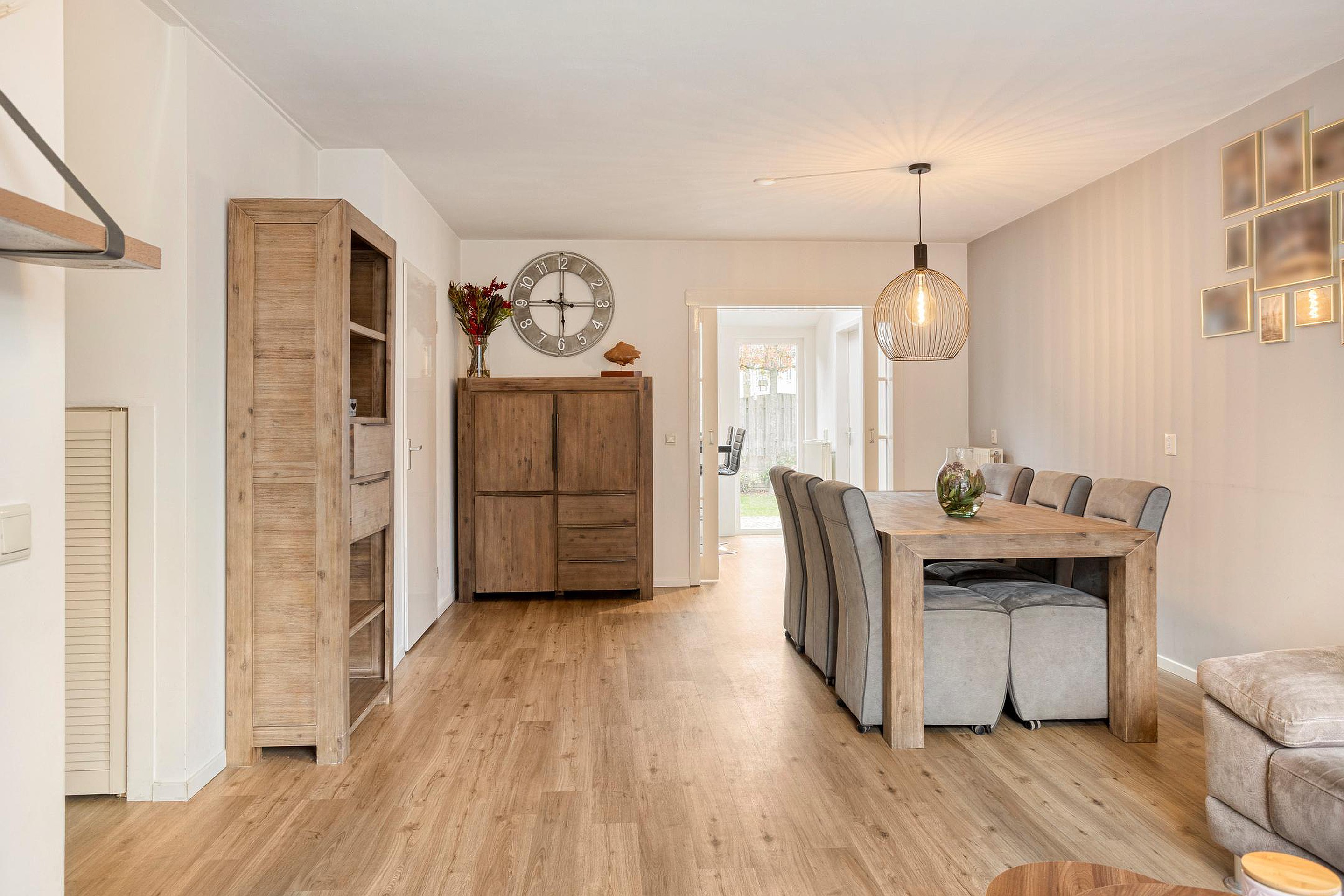 De stijlvolle ensuite-deuren leiden naar de moderne leefkeuken, dé plek waar koken en samenzijn centraal staan. De keuken is uitgerust met diverse inbouwapparatuur, een praktische eetbar en biedt direct toegang tot de zonnige achtertuin.