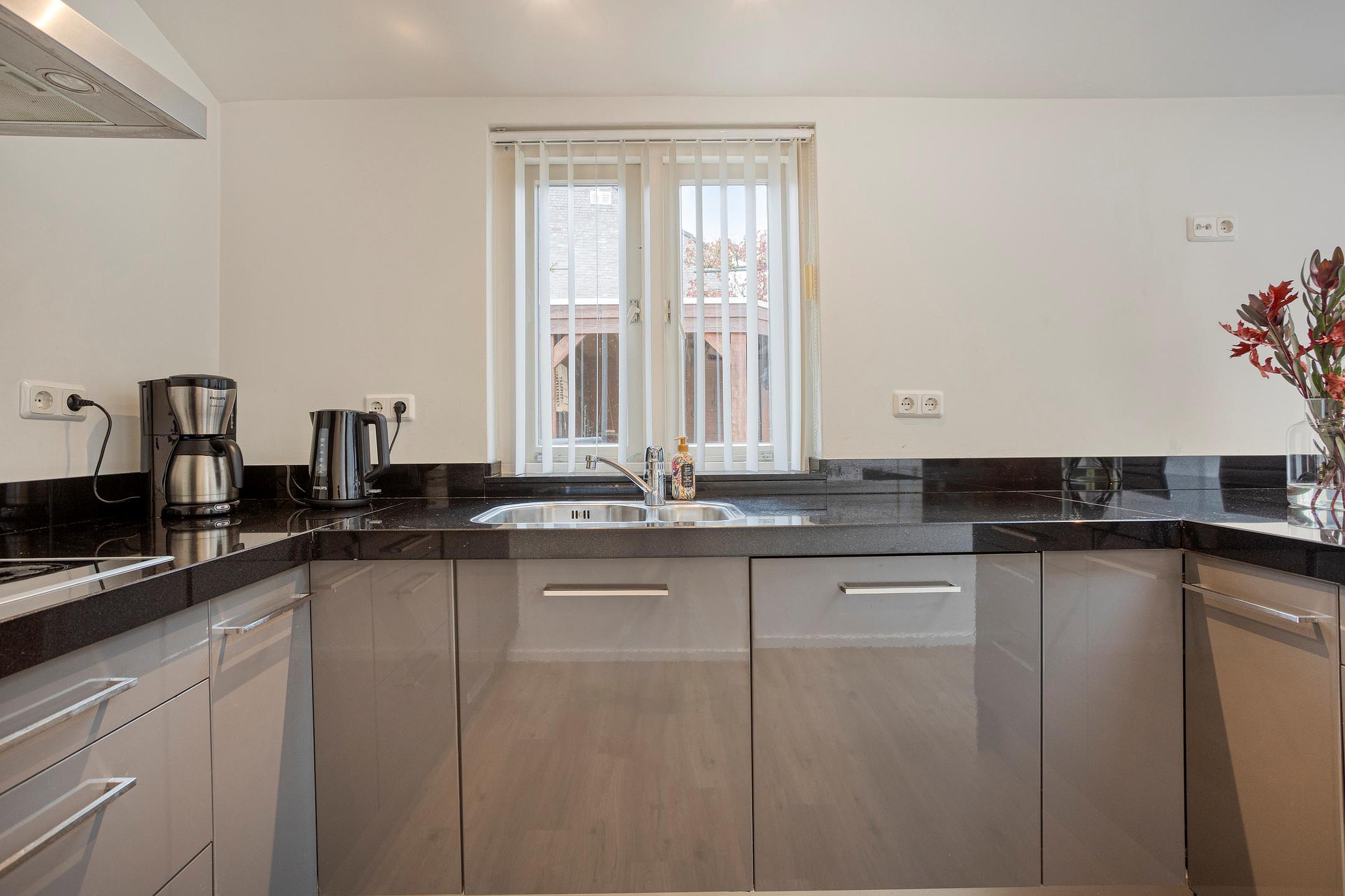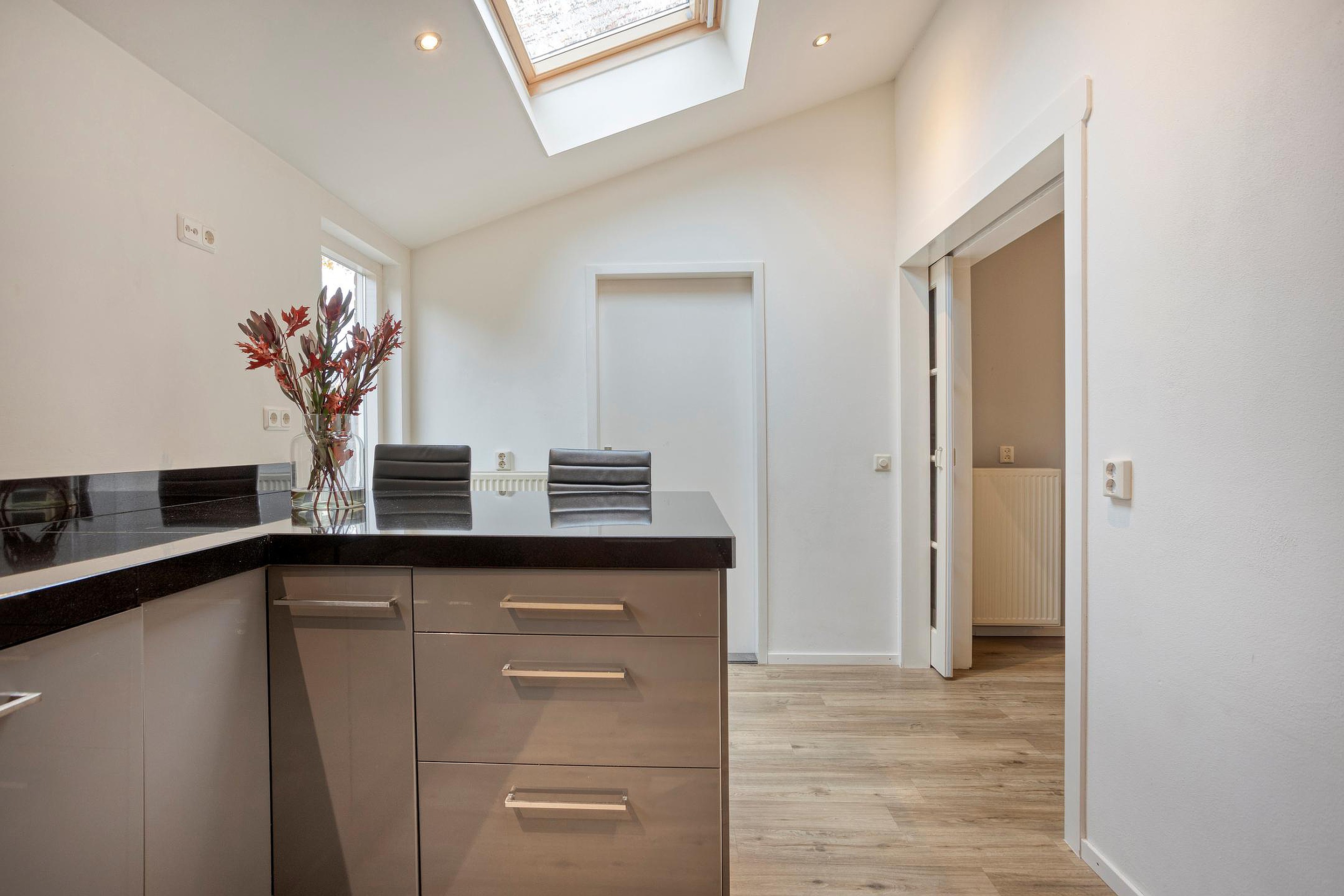 - De moderne inbouwkeuken beschikt over een stijlvol natuurstenen aanrechtblad met een eetbar. In de keuken is een close-in boiler aanwezig zodat je altijd snel kunt beschikken over warm water.