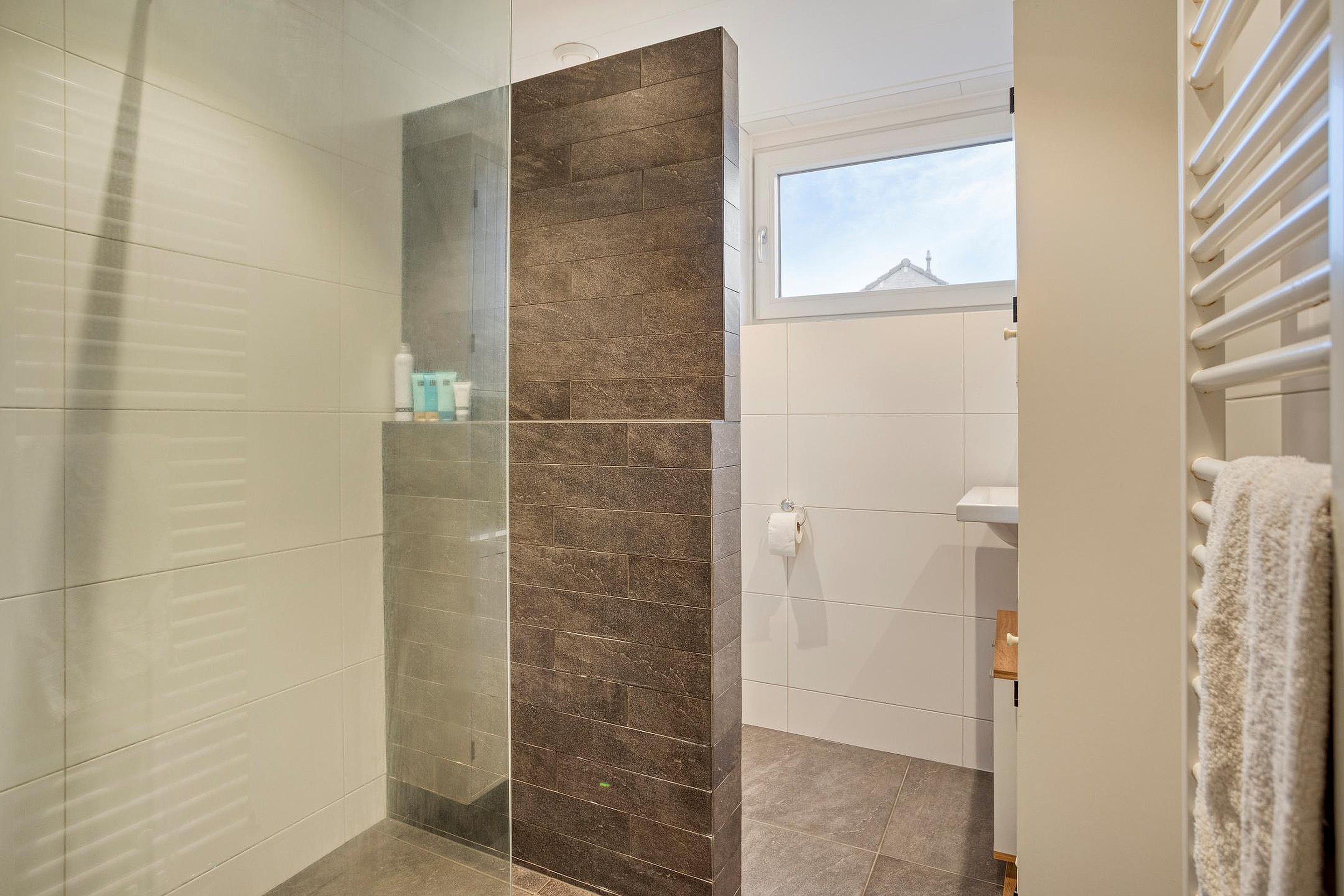 De stijlvolle badkamer is uitgerust met een inloopdouche, toilet en vaste wastafel.