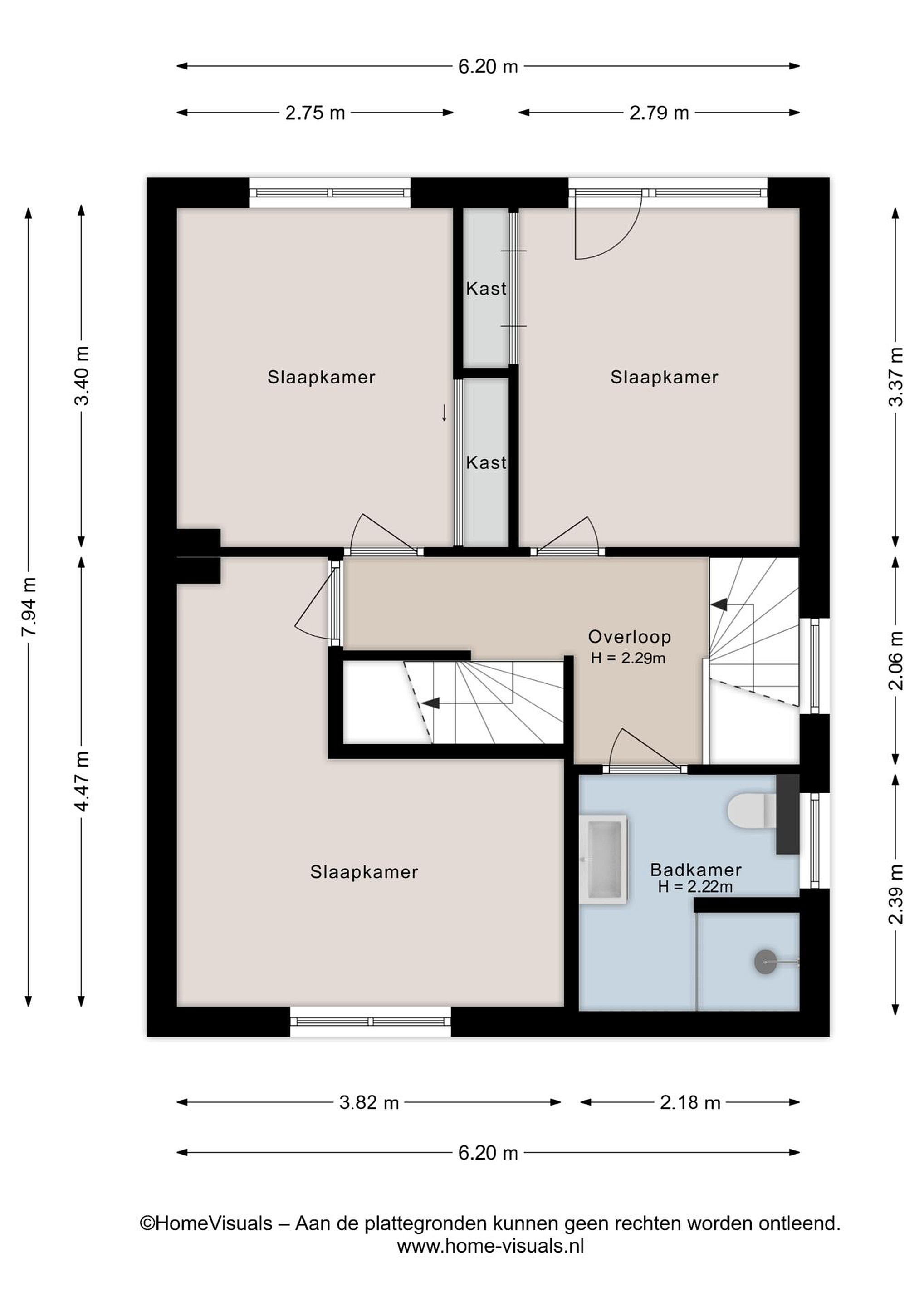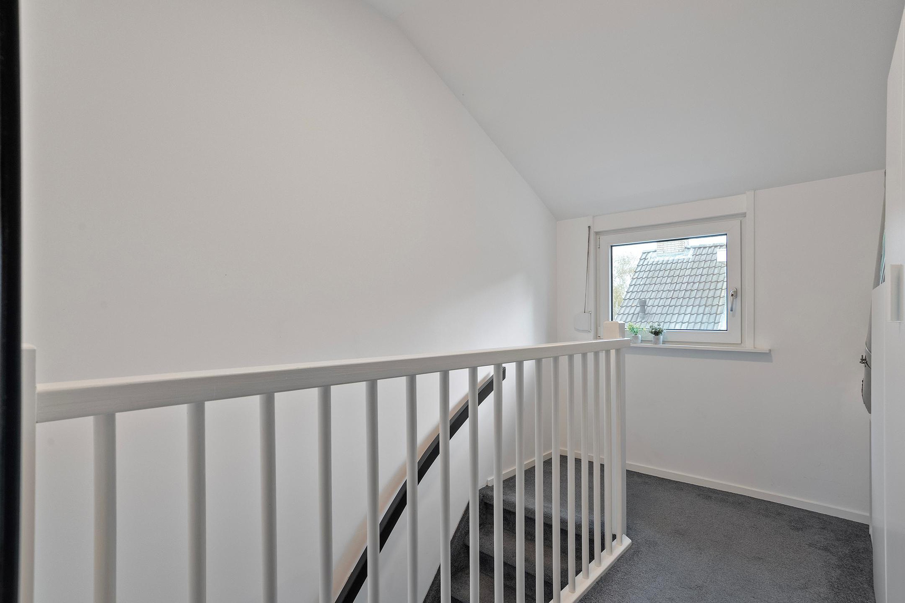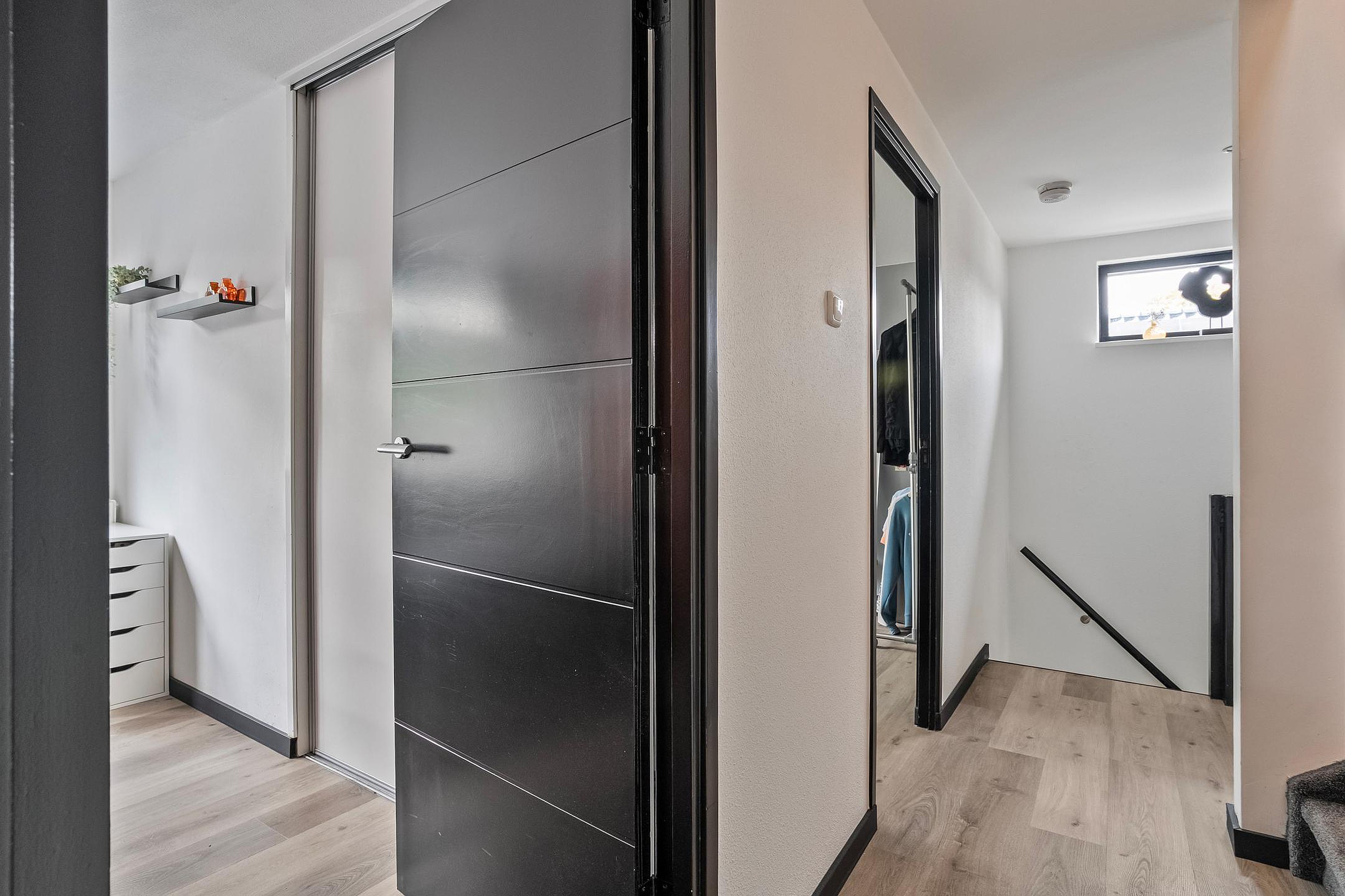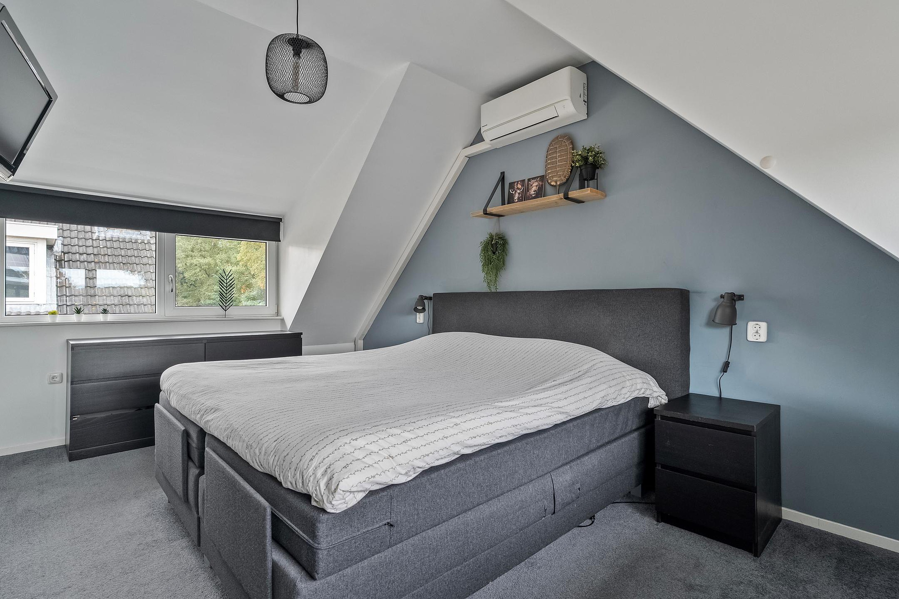 Overloop met twee slaapkamers, waarvan één voorzien van elektrische rolluiken en airco.