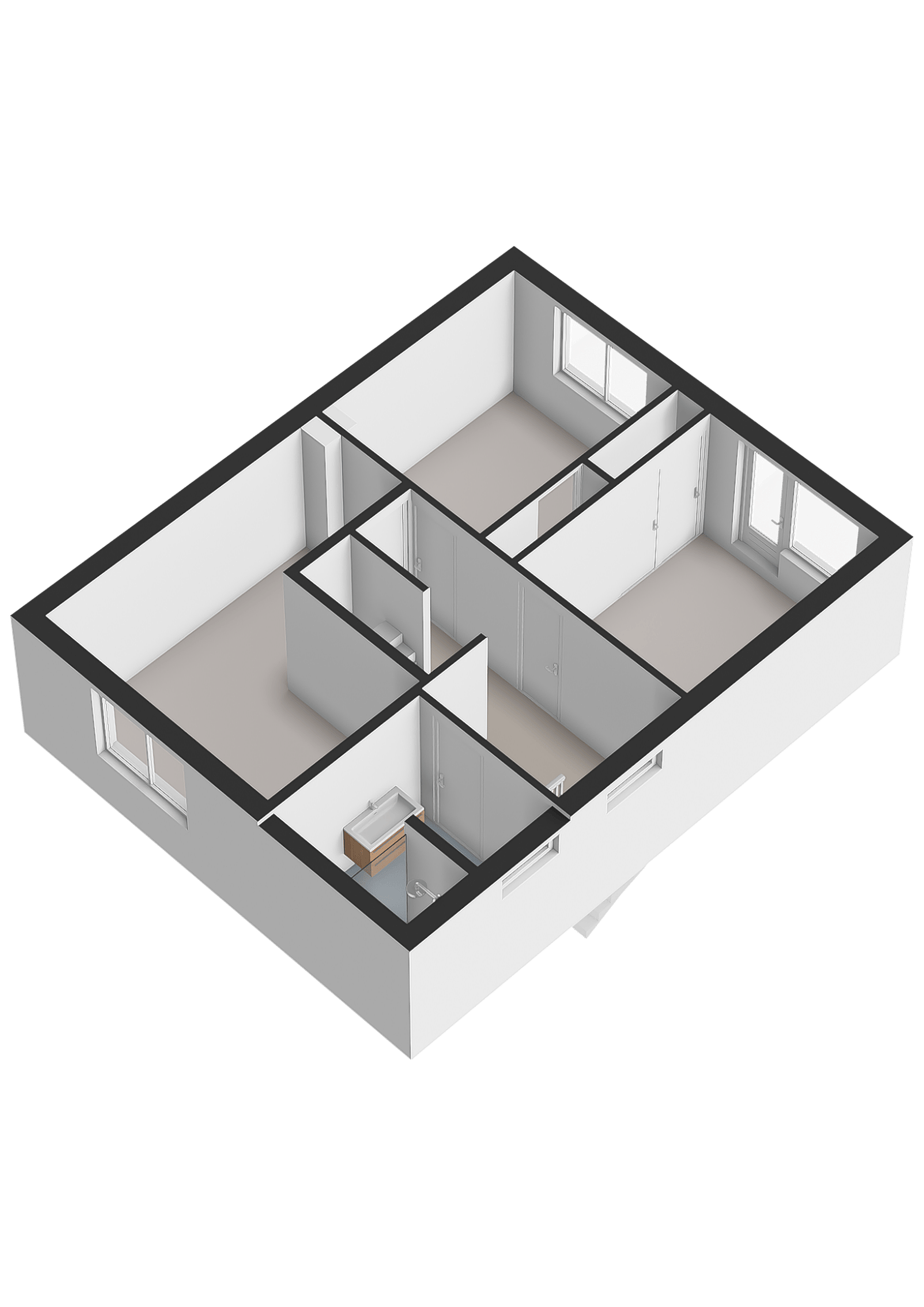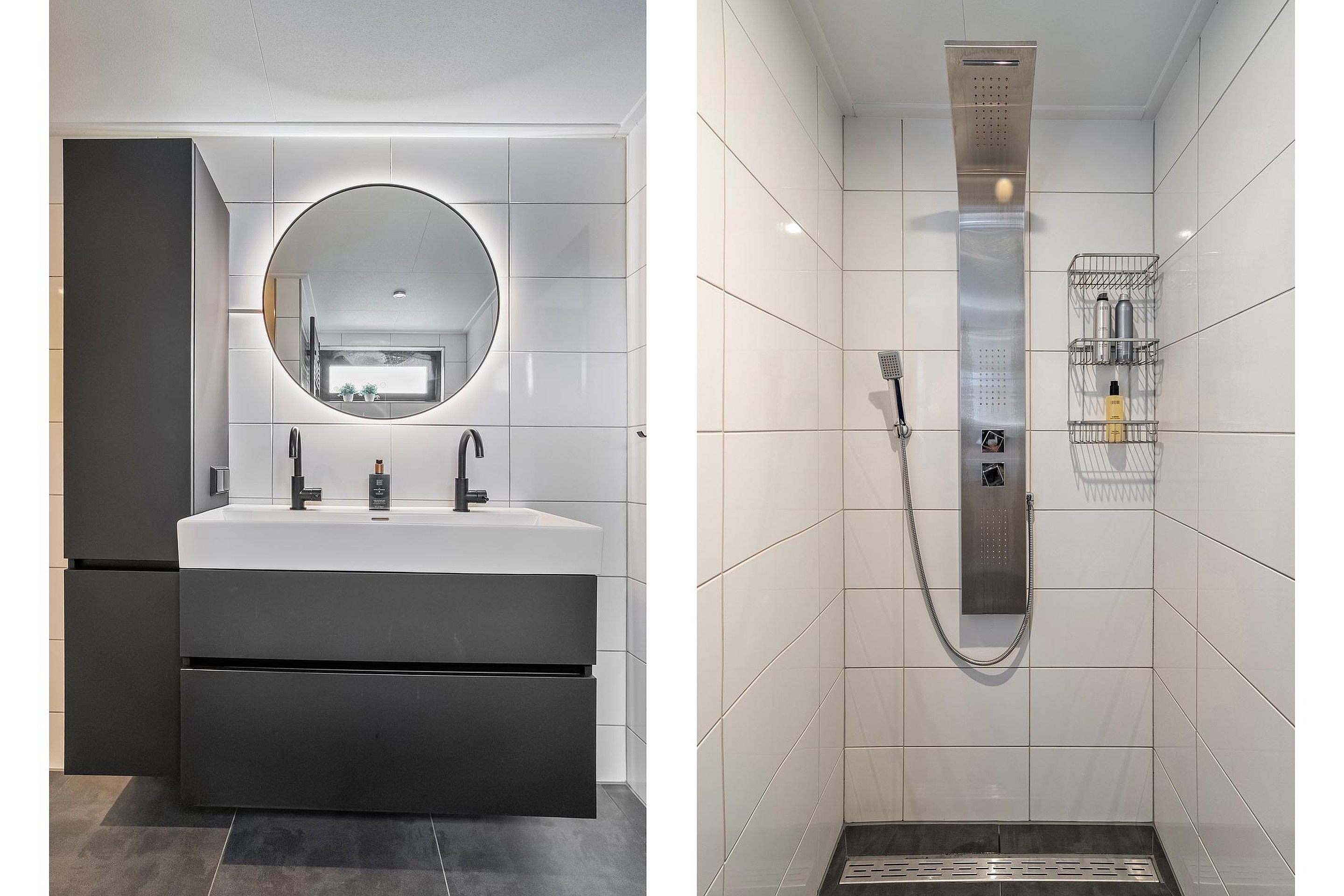 Overloop, drie slaapkamers en badkamer v.v. toilet, wandmeubel, inloopdouche, designradiator en dubbele wastafelmeubel.