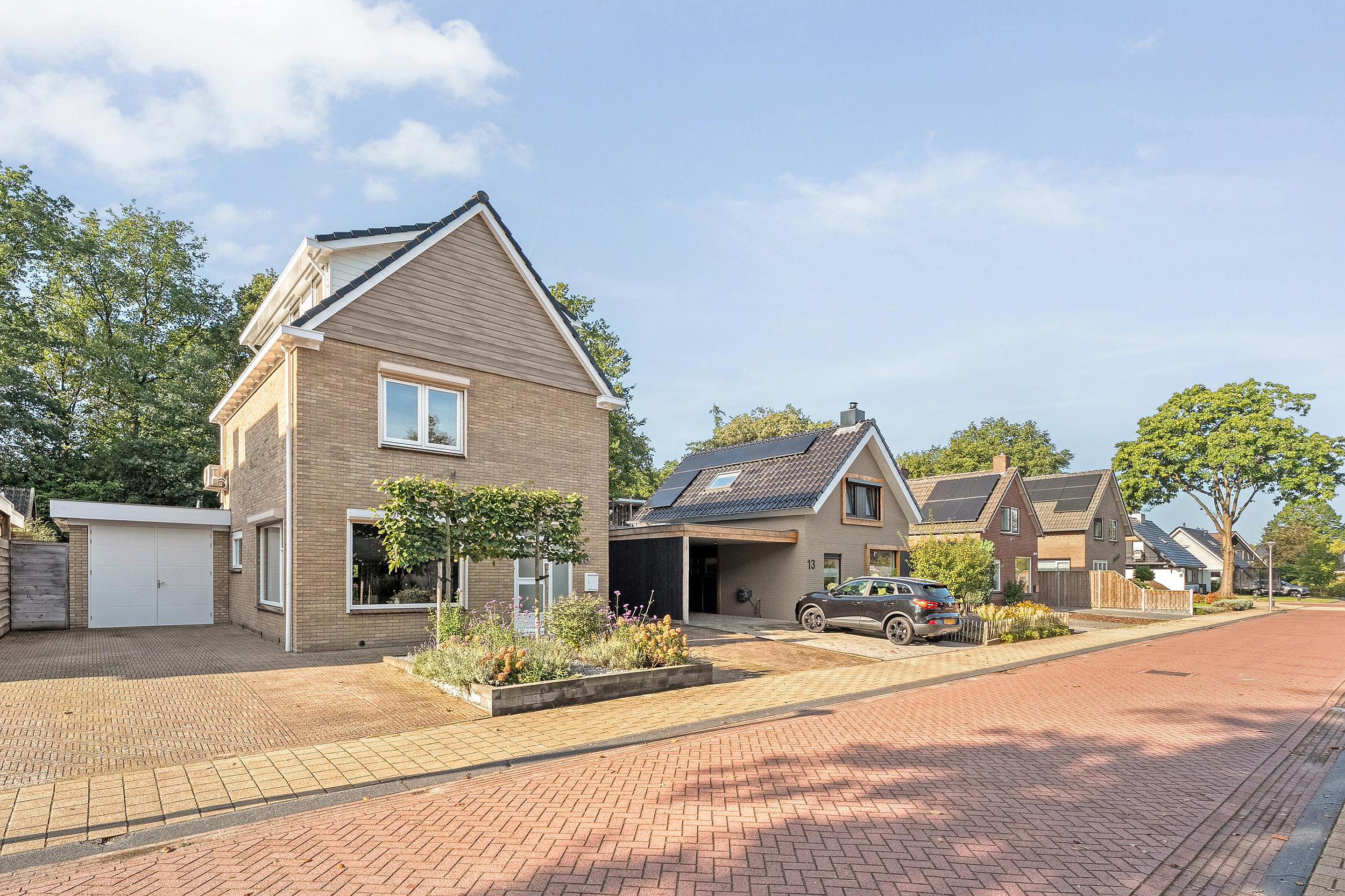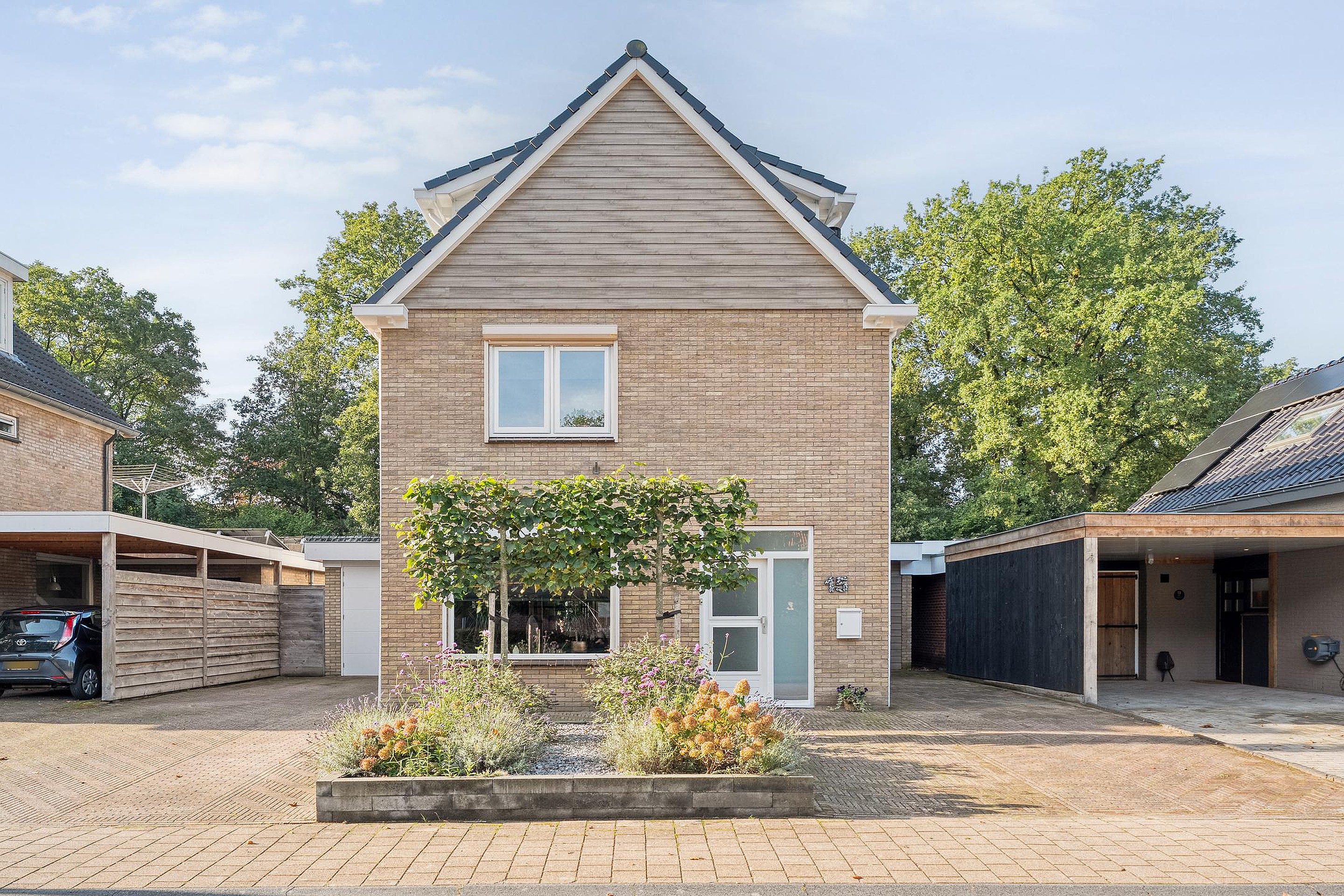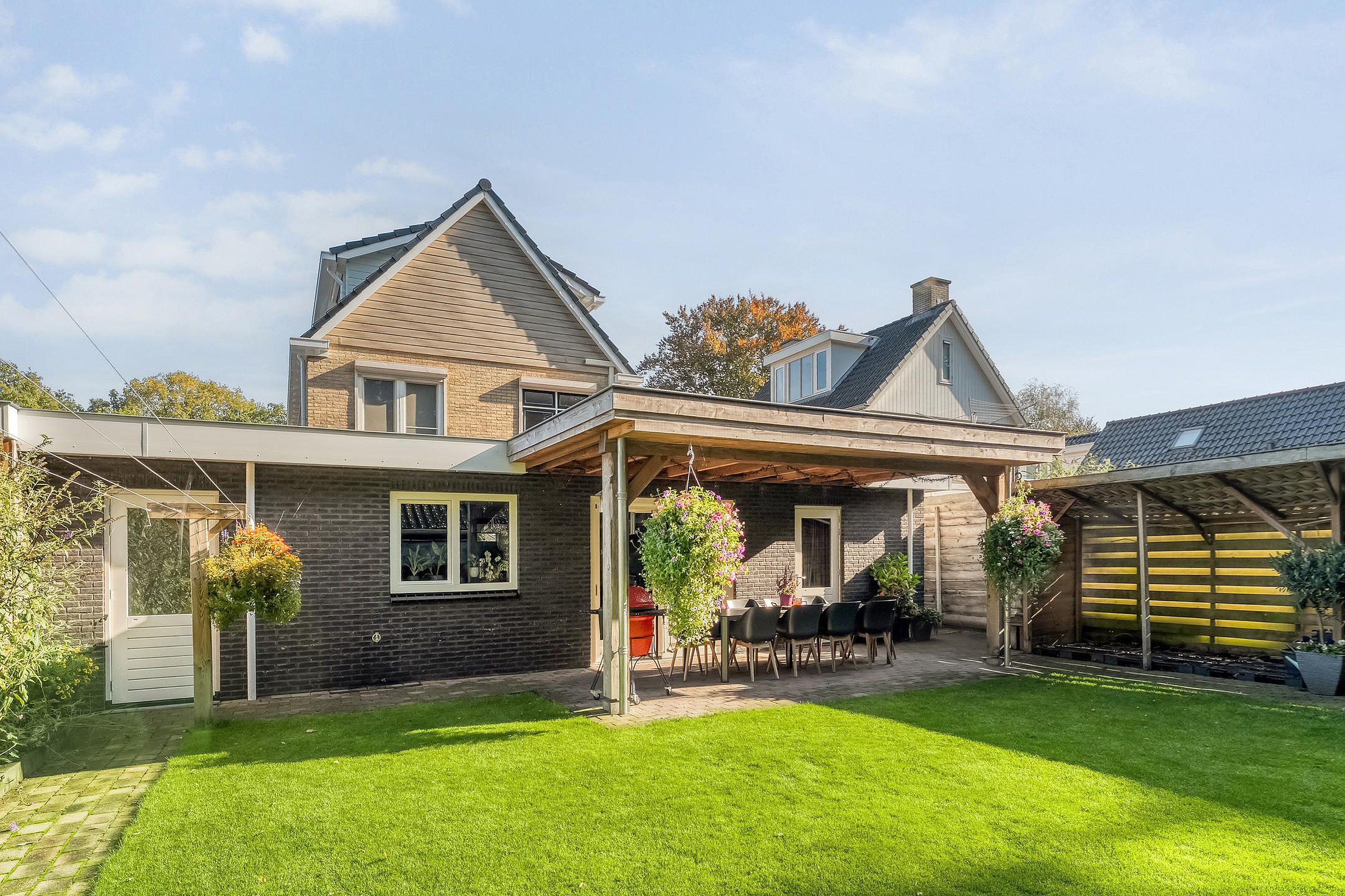 Bij aankomst valt direct de dubbele oprit op – parkeerproblemen zijn hier taboe. Heb je een elektrische auto? Je kunt voor de woning makkelijk een laadpaal plaatsen, mocht je dat willen. Achterom ligt een tuin waar je echt blij van wordt: speels aangelegd met verschillende hoekjes, veel privacy, een royale overkapping (lekker lang buiten zitten!) én handige schuur/barruimte voor feestjes of klussen. Extra’s als een pergola maken het helemaal af.