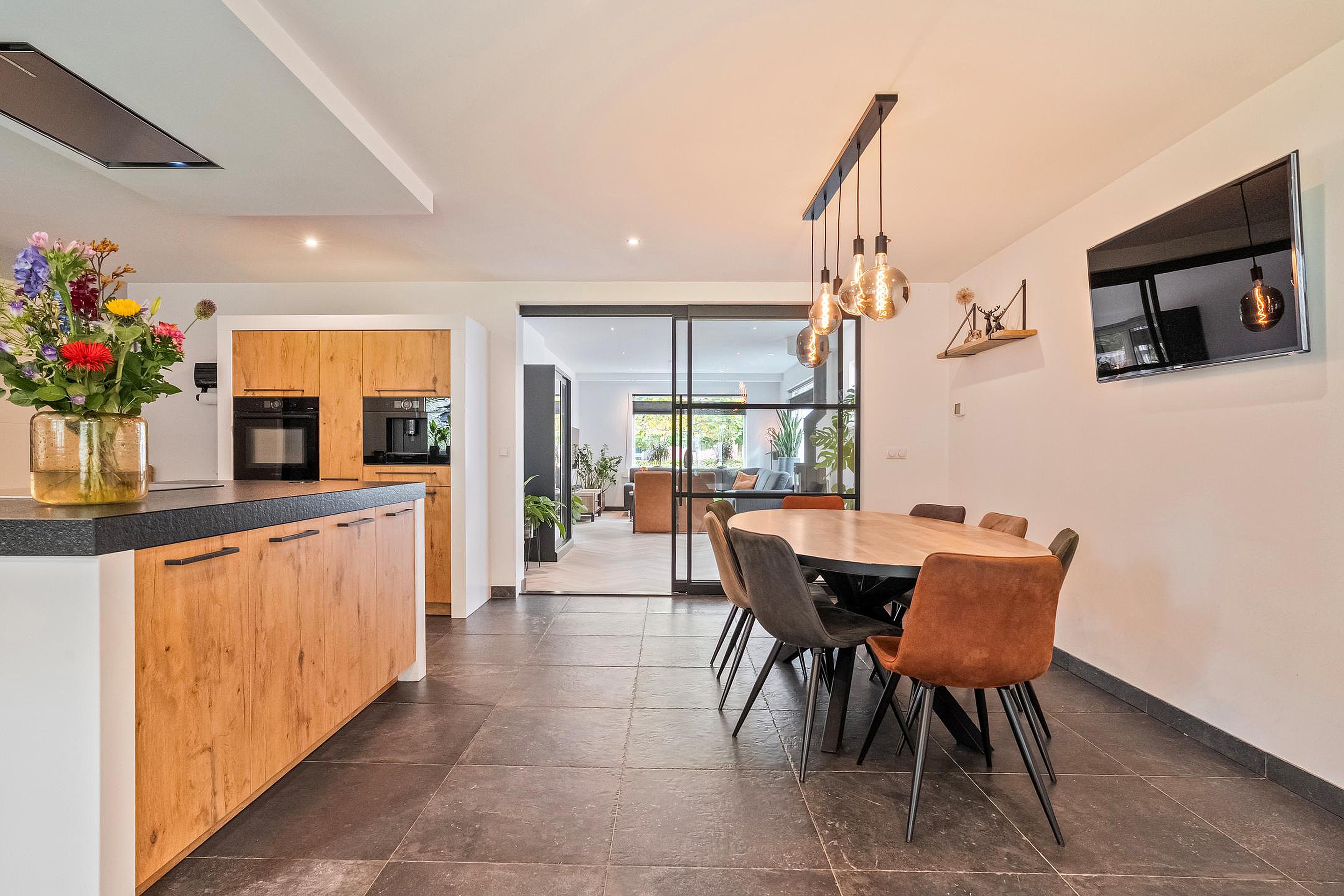 Tussen woonkamer en keuken vind je fraaie industriële kamer-en-suite deuren. Die geven niet alleen een stoere look, maar zorgen ook nog eens voor een flexibele indeling. Sluit je ze? Dan heb je rust aan beide kanten. Laat je ze openstaan, dan vloeit alles mooi in elkaar over.
