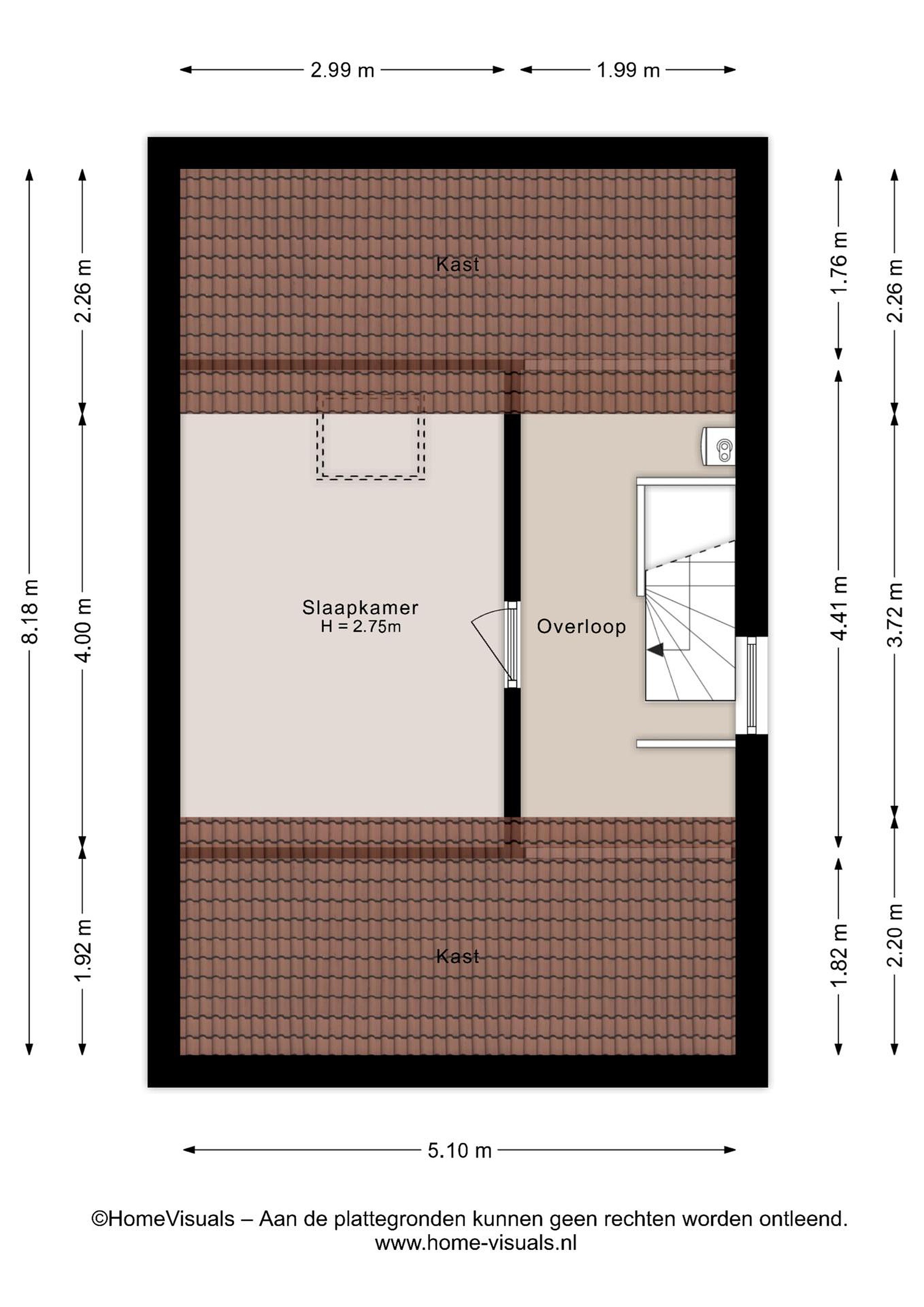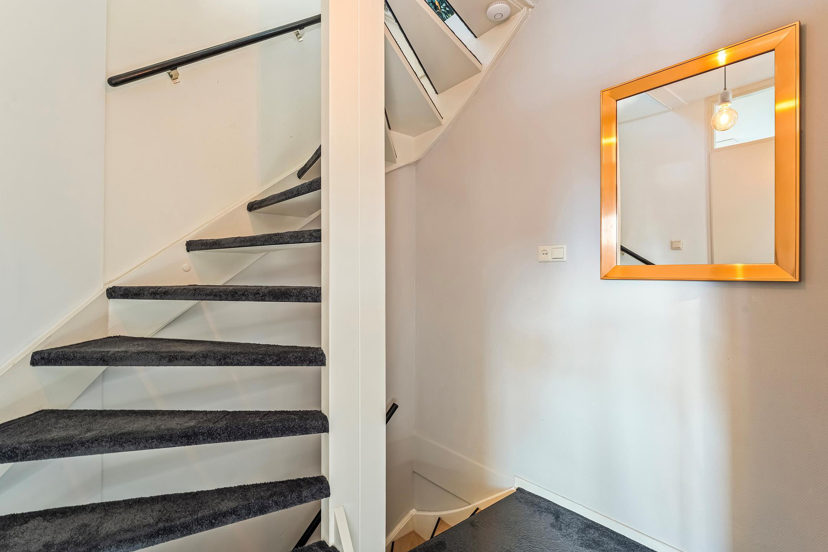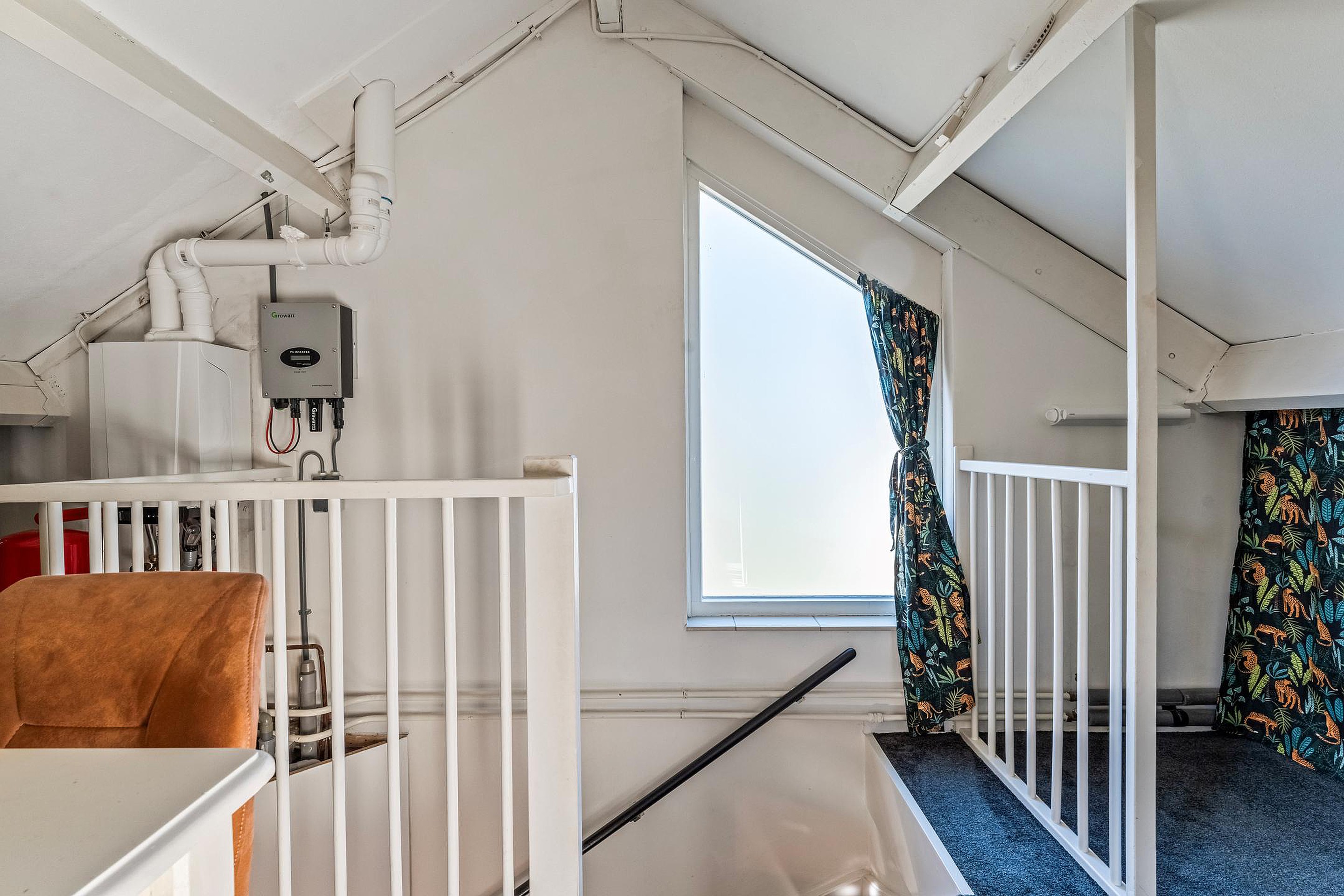 Een nette overloop met c.v.- en zonnepaneel installatie, veel opbergruimte achter de schuine kanten en een derde slaapkamer v.v. dakraam.