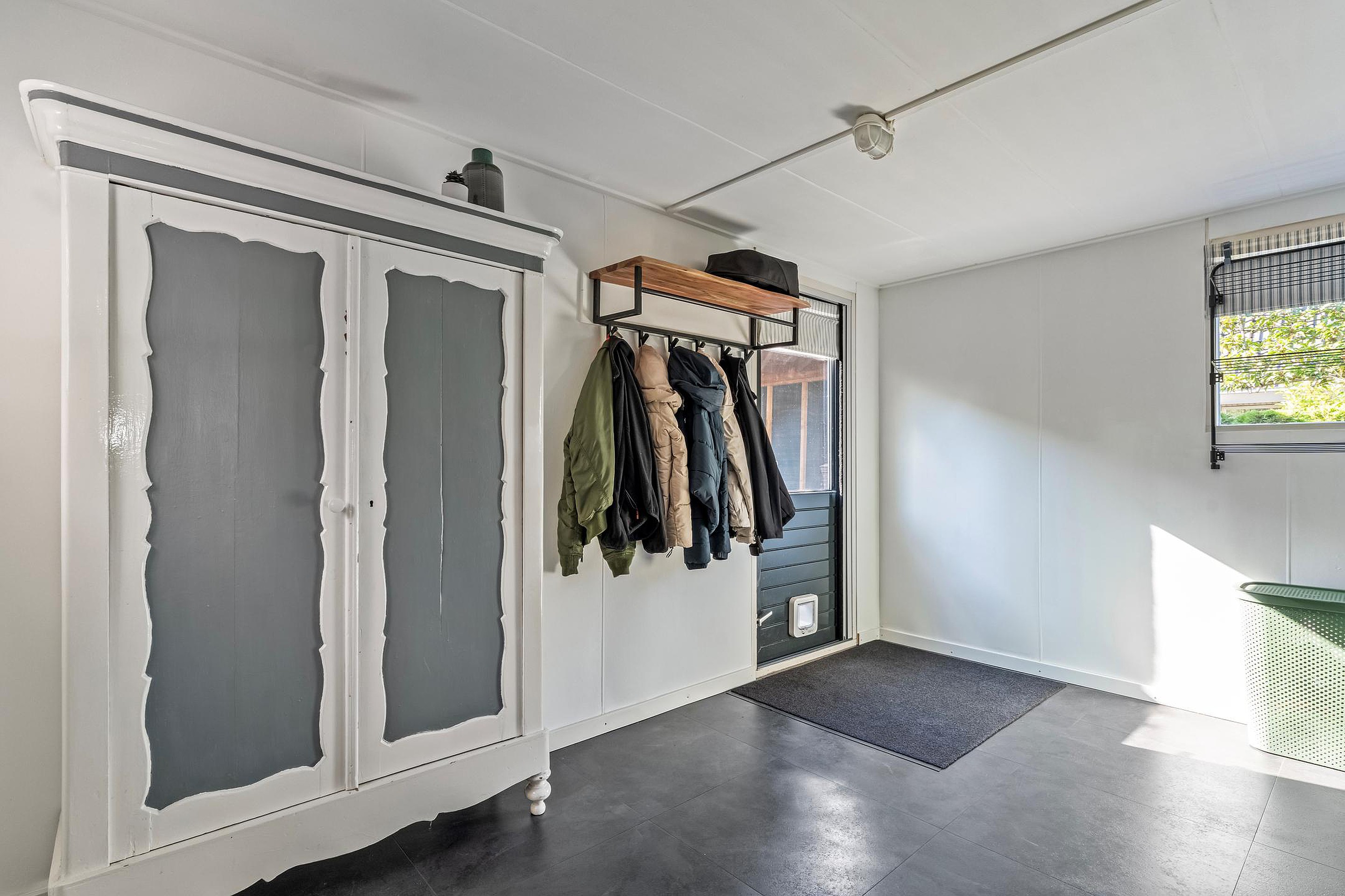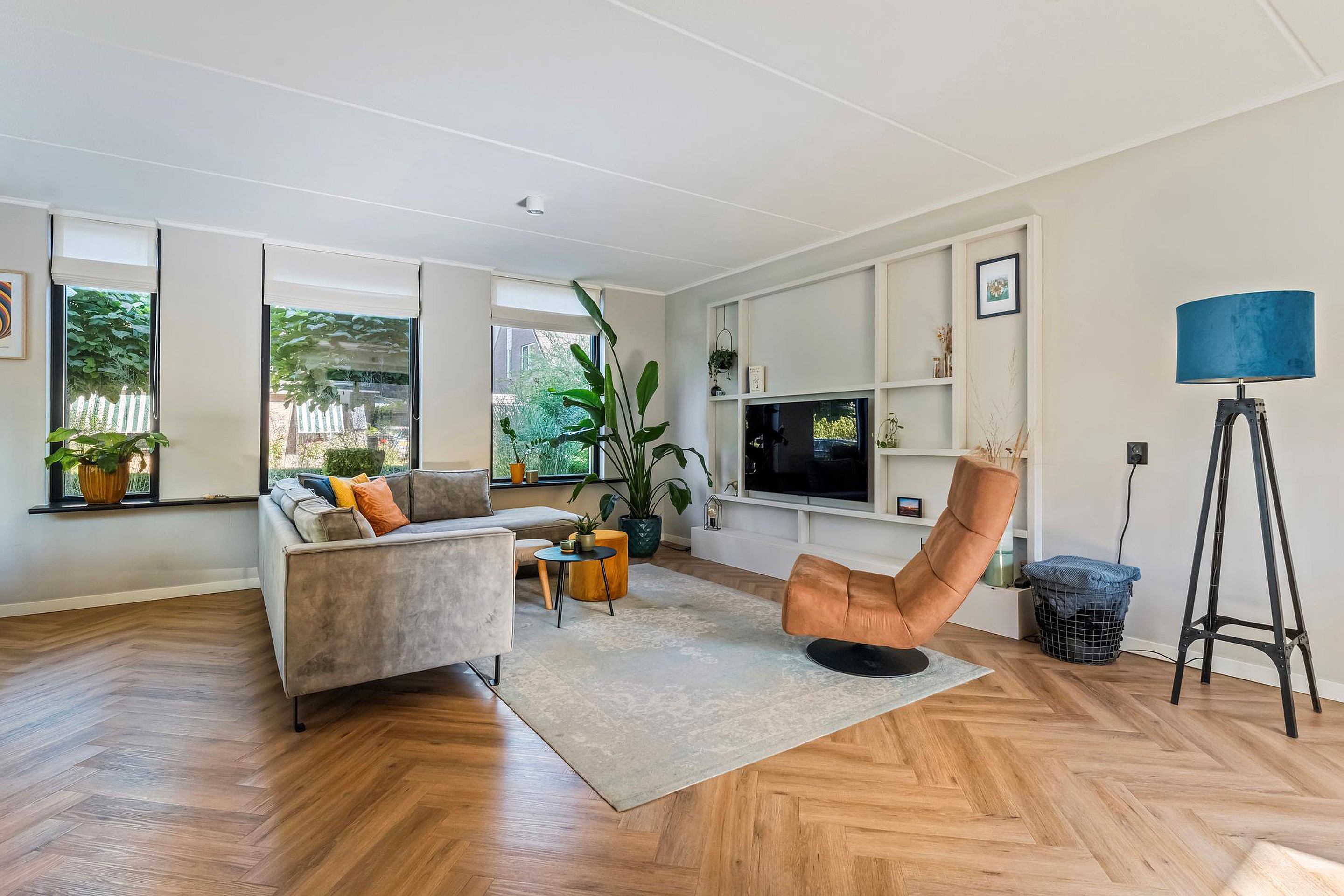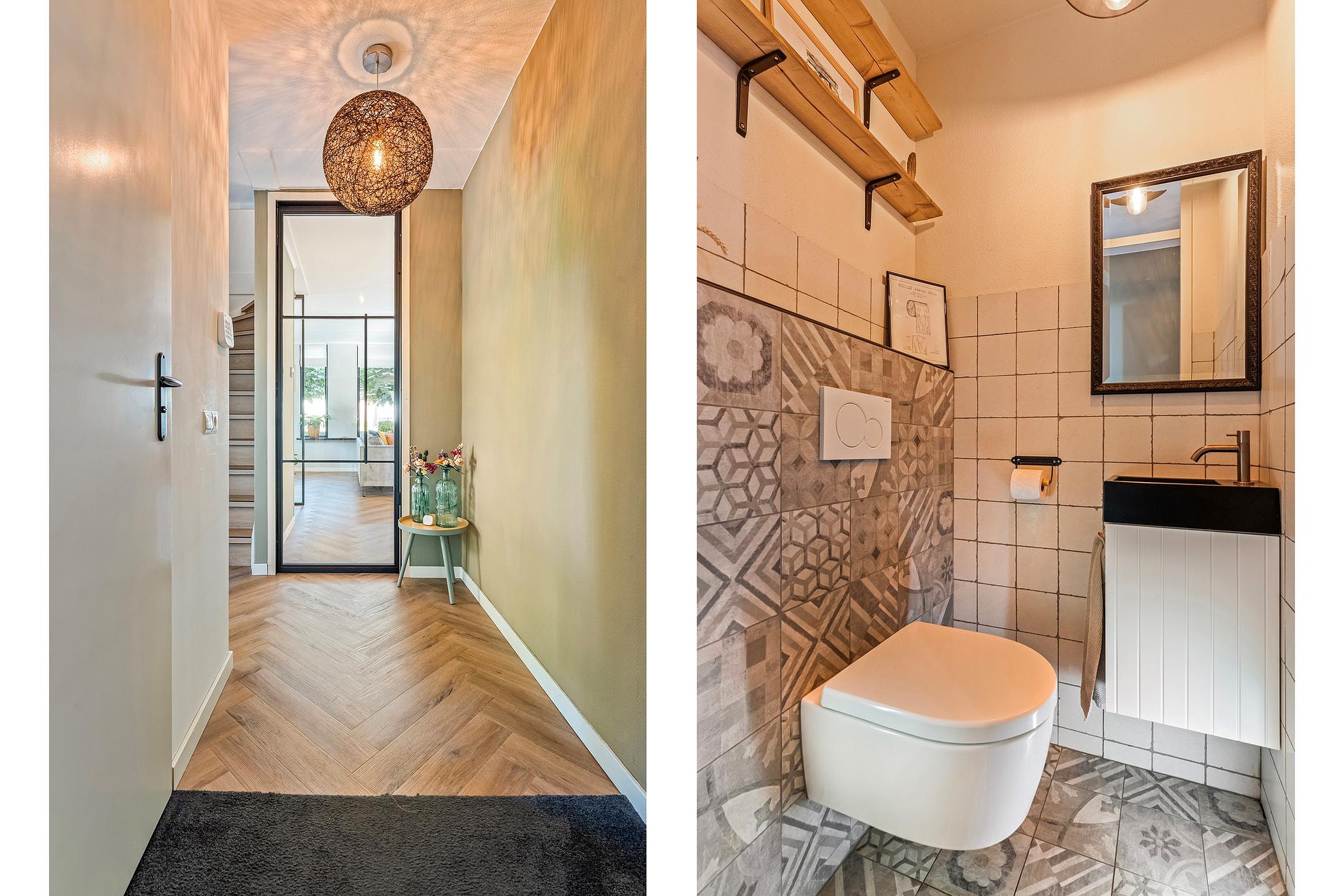 Stap vanuit de ruime bijkeuken via de lichte hal binnen en direct is de prettige sfeer voelbaar. De woonkamer is niet alleen knus en sfeervol, maar ook ruim en licht. Hierdoor is het een prettige leefruimte waar je kan ontspannen of mensen uit kan nodigen voor een gezellige borrelavond. Het is allemaal mogelijk door de efficiënte indeling van de benedenverdieping.