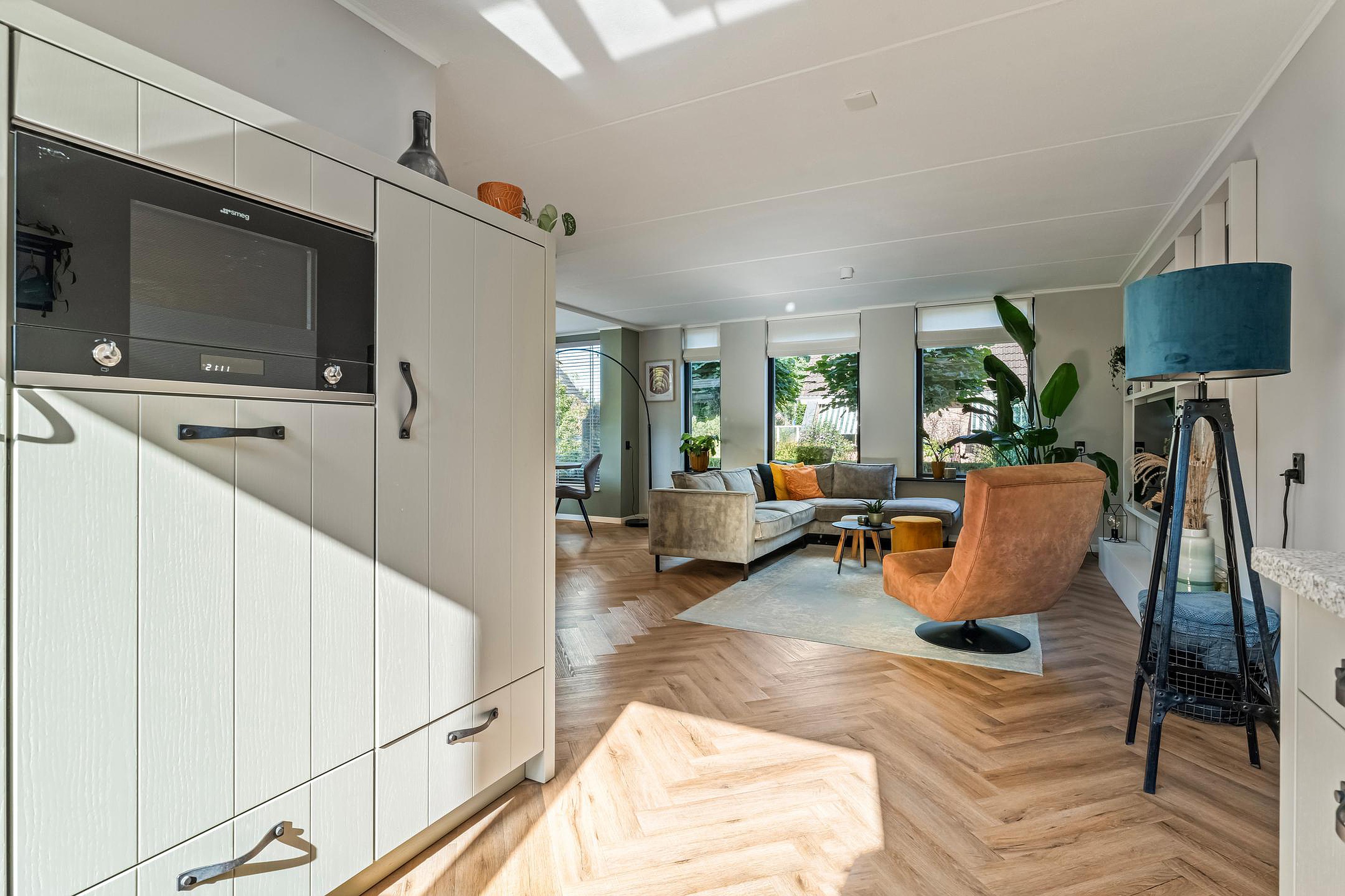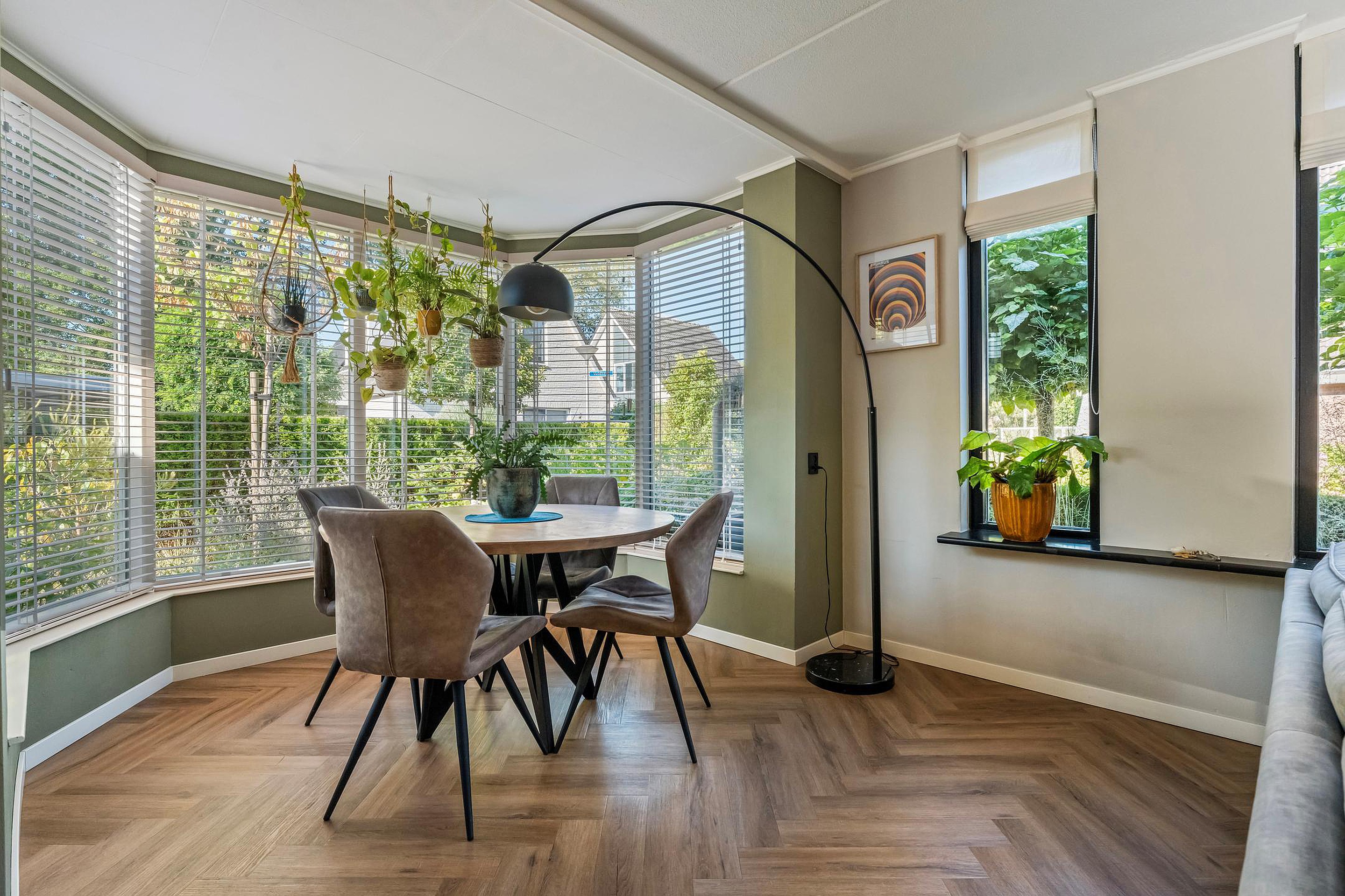 De keuken loopt over in de woonkamer die vervolgens naadloos aansluit op de eetkamer in de erker. Dit is niet alleen een fijne plek om te eten of samen spelletjes doen, maar ook thuiswerken kan hier uitstekend, inclusief zicht op de sfeervolle tuin.