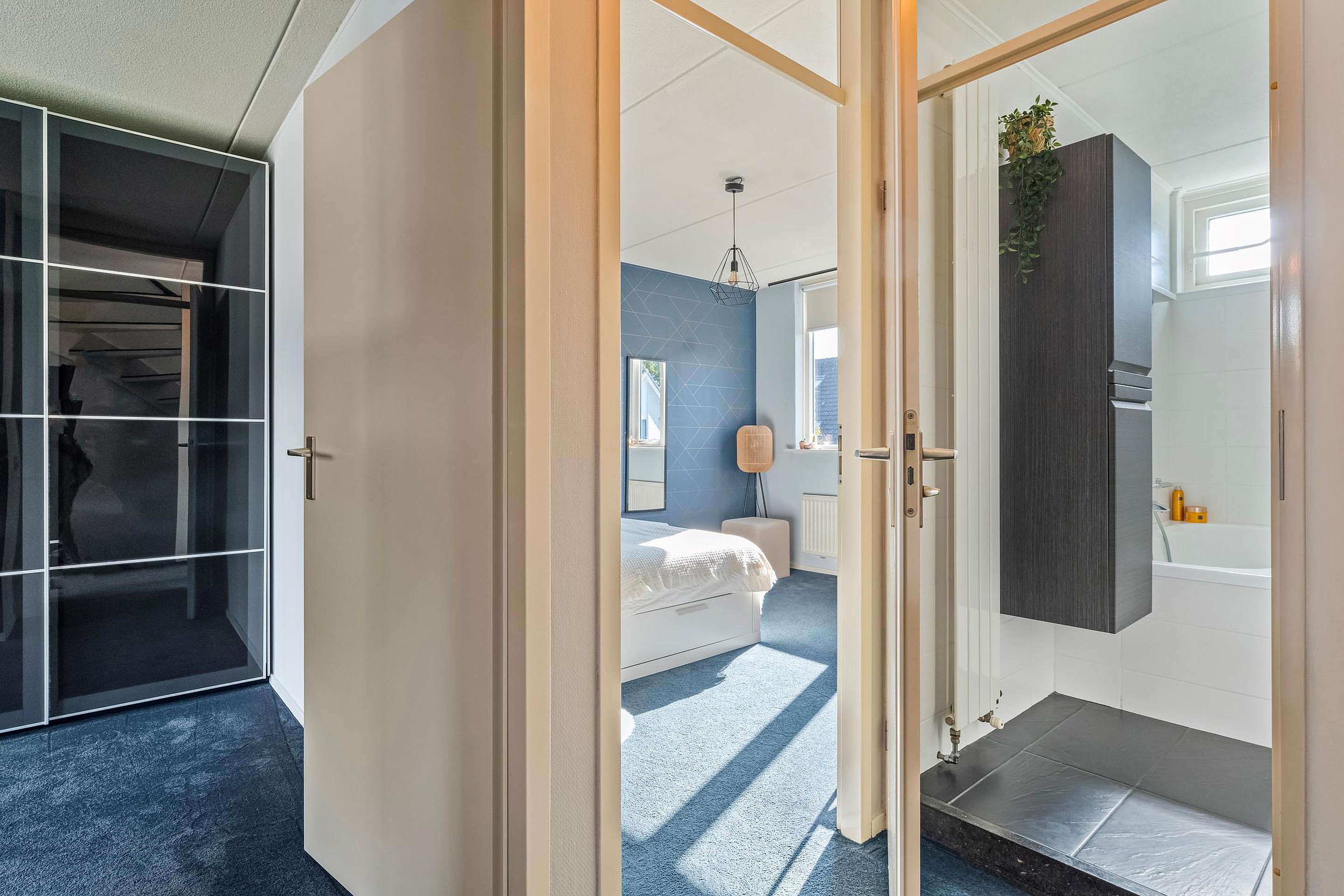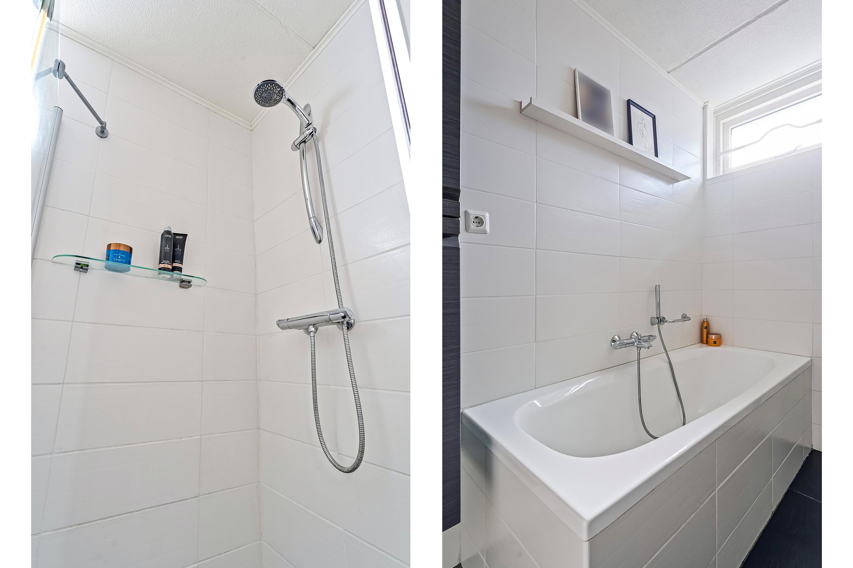 Overloop, twee ruime slaapkamers (voorheen drie slaapkamers) en een moderne badkamer uitgevoerd met ligbad, wandmeubel, wastafelmeubel, toilet en inloopdouche.