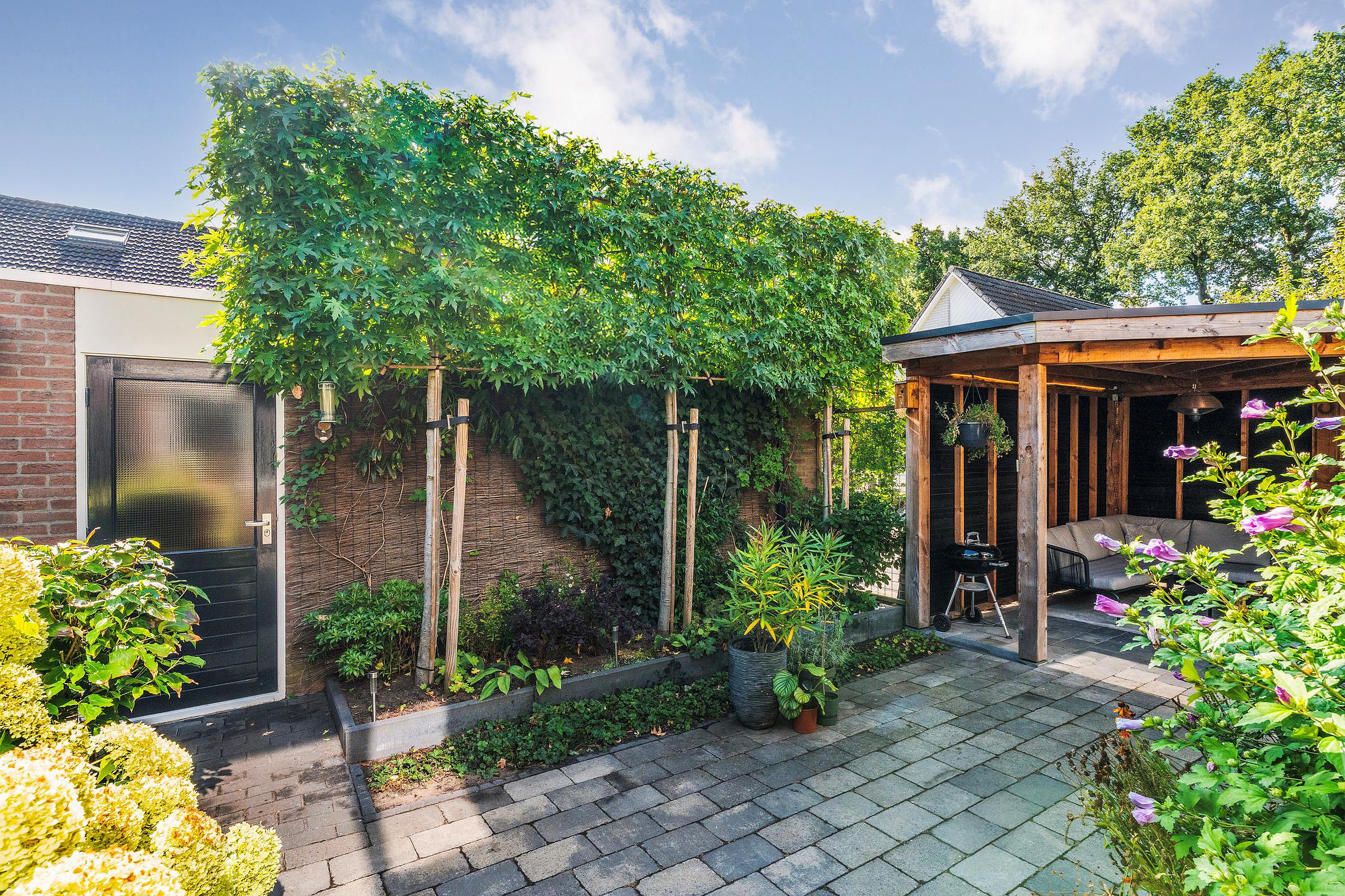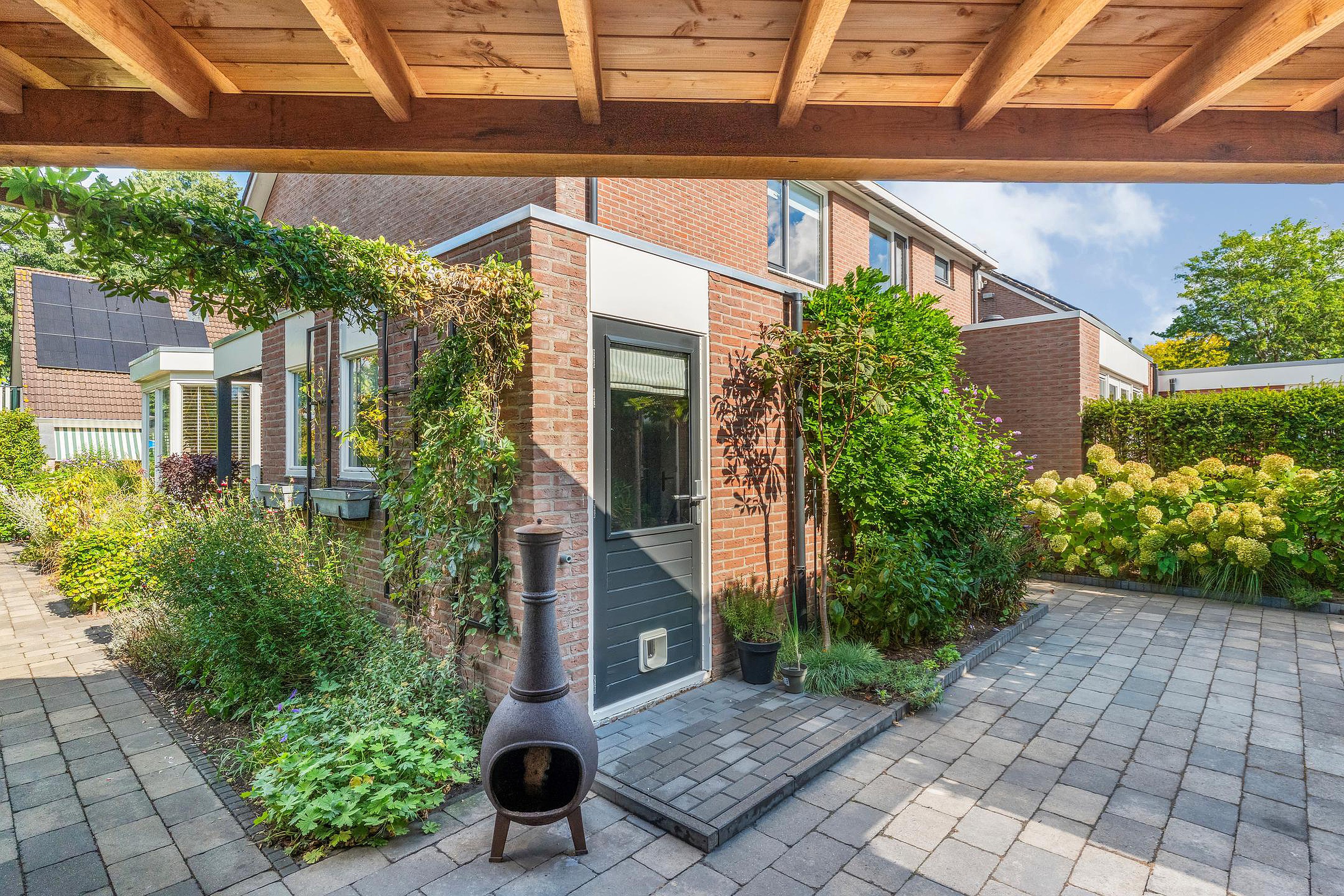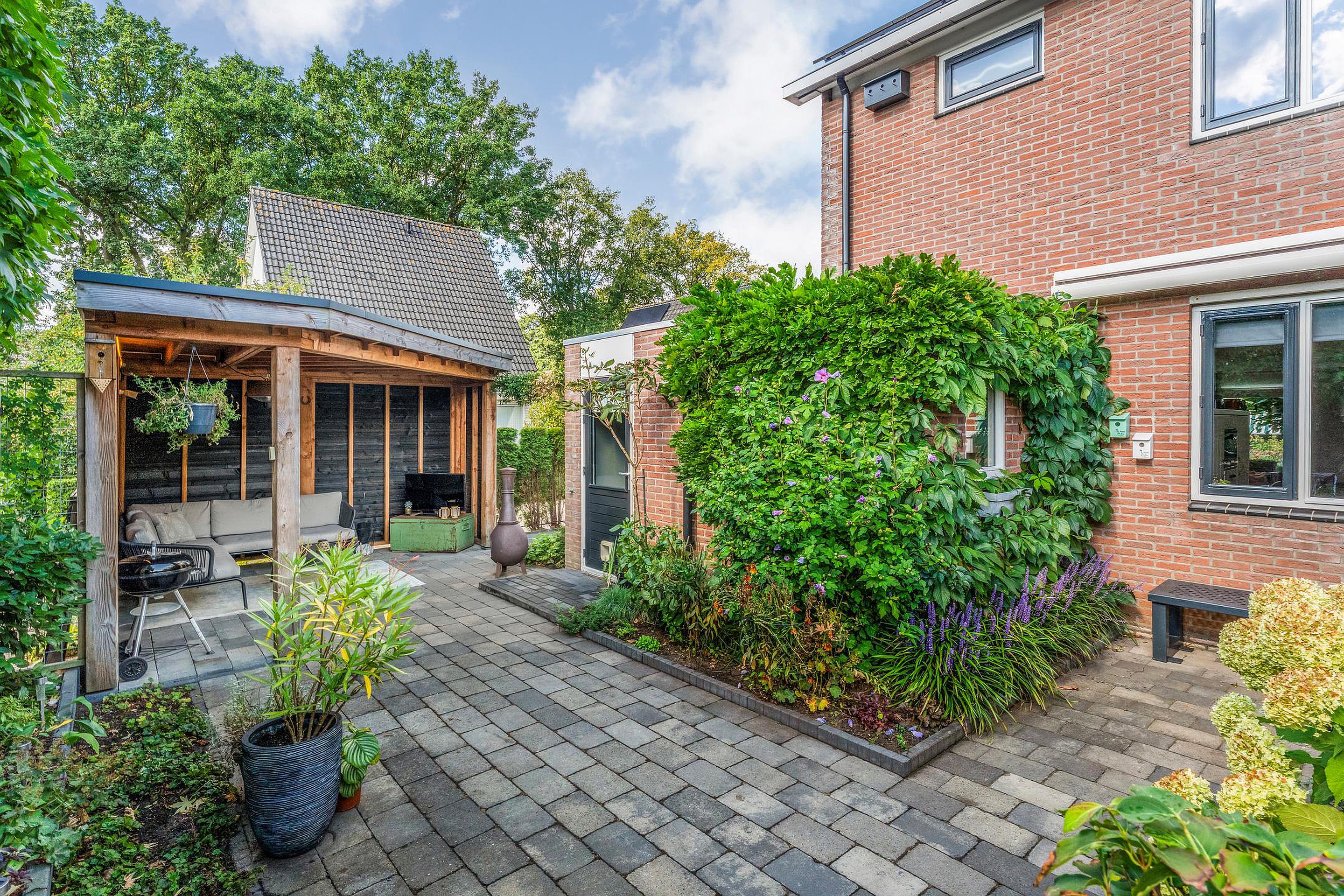 De woning beschikt over meerdere sfeervolle terrassen en een overkapping. Aan de achterzijde een vrijstaande stenen garage met oprit en aan de voorzijde een extra privé parkeerplaats.