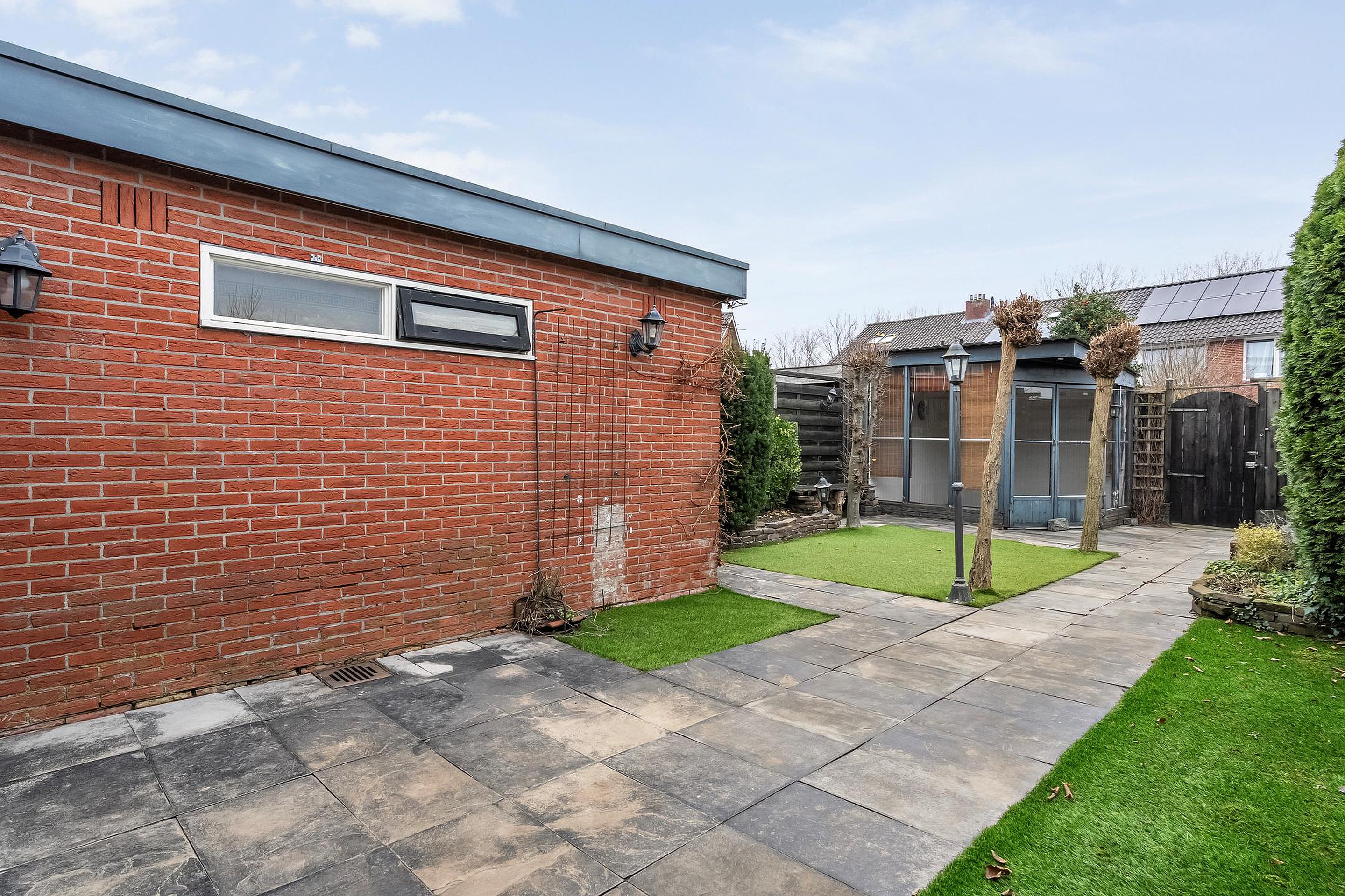 Een aangebouwde overkapping/veranda, vrijstaande stenen berging, vrijstaande houten berging/prieel alsmede een achterom gelegen in een diep bemeten achtertuin.