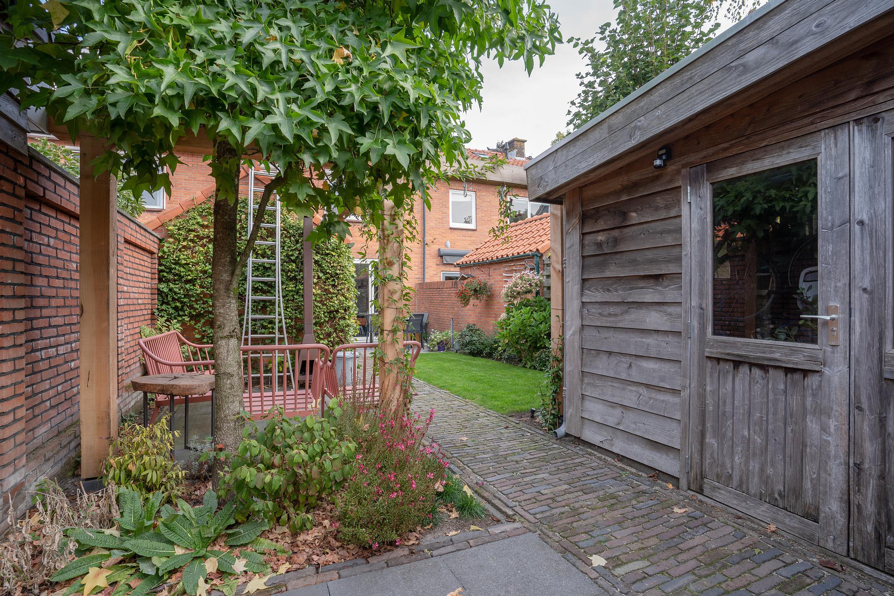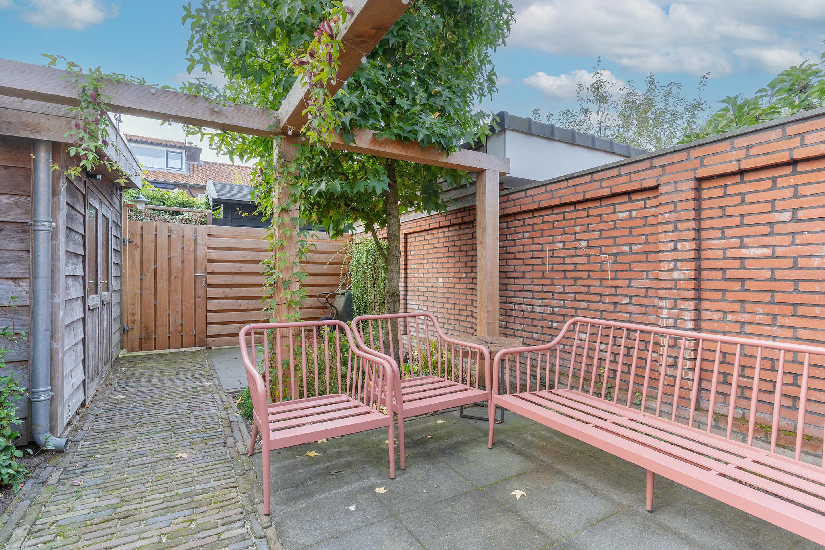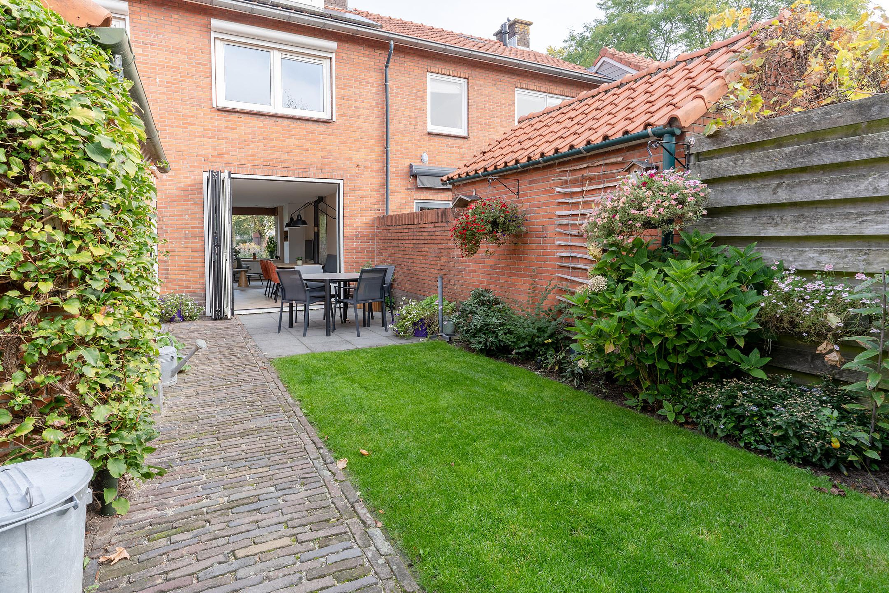De fraai aangelegde tuin op het zonnige zuiden is jouw eigen stukje rust. Meerdere terrassen, een gazon, groene borders, twee bergingen én een achterom maken het plaatje compleet. Of je nu wakker wordt met een kop koffie in de ochtendzon of ’s avonds gezellig barbecuet met vrienden – hier voelt het altijd als thuiskomen.
