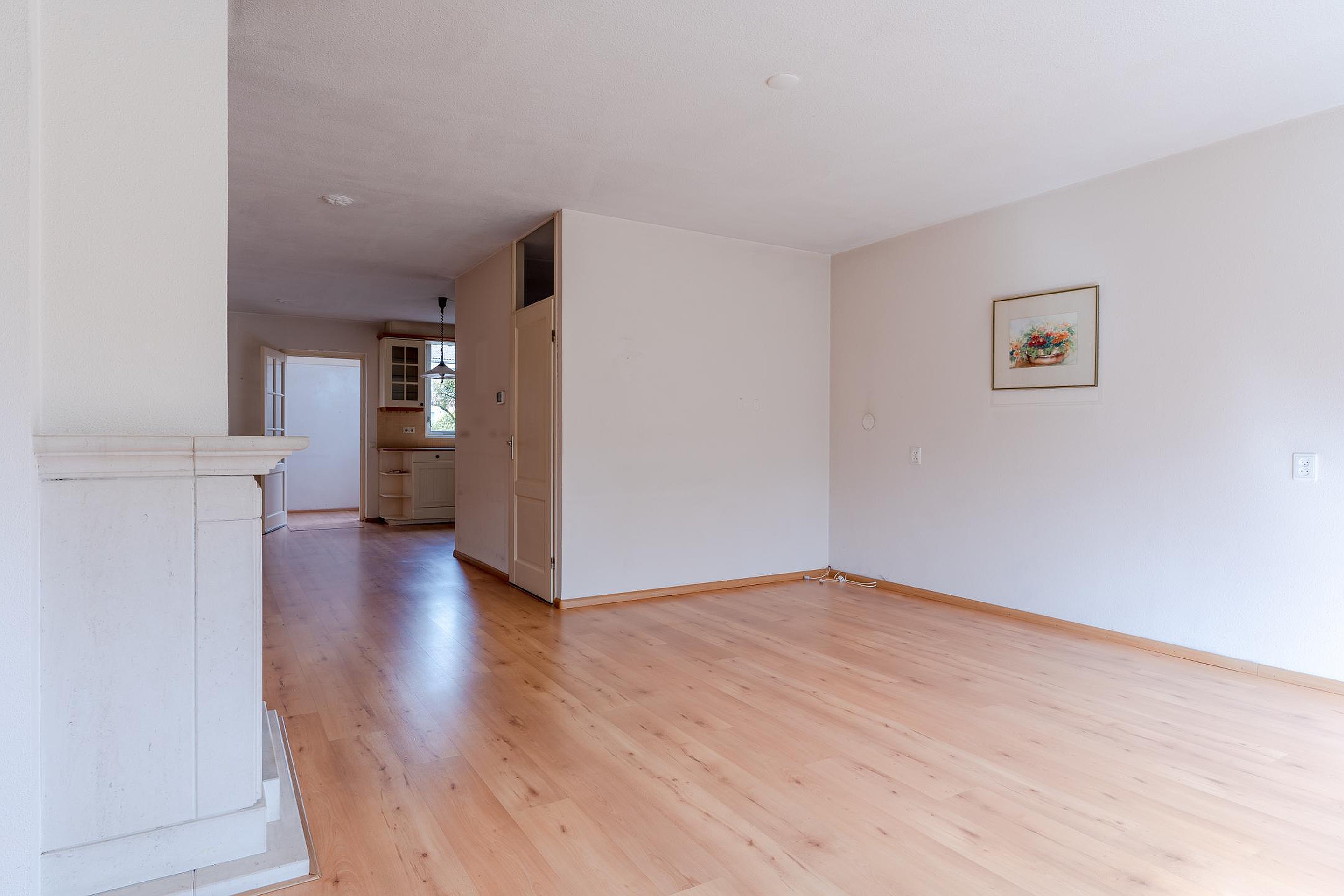 hal met binnendoor toegang naar de garage. Open keuken met trapkast en ruimte voor een grote eethoek. Riante woonkamer met haard en toegang tot de tuin. In de tussenhal is het toilet te vinden.