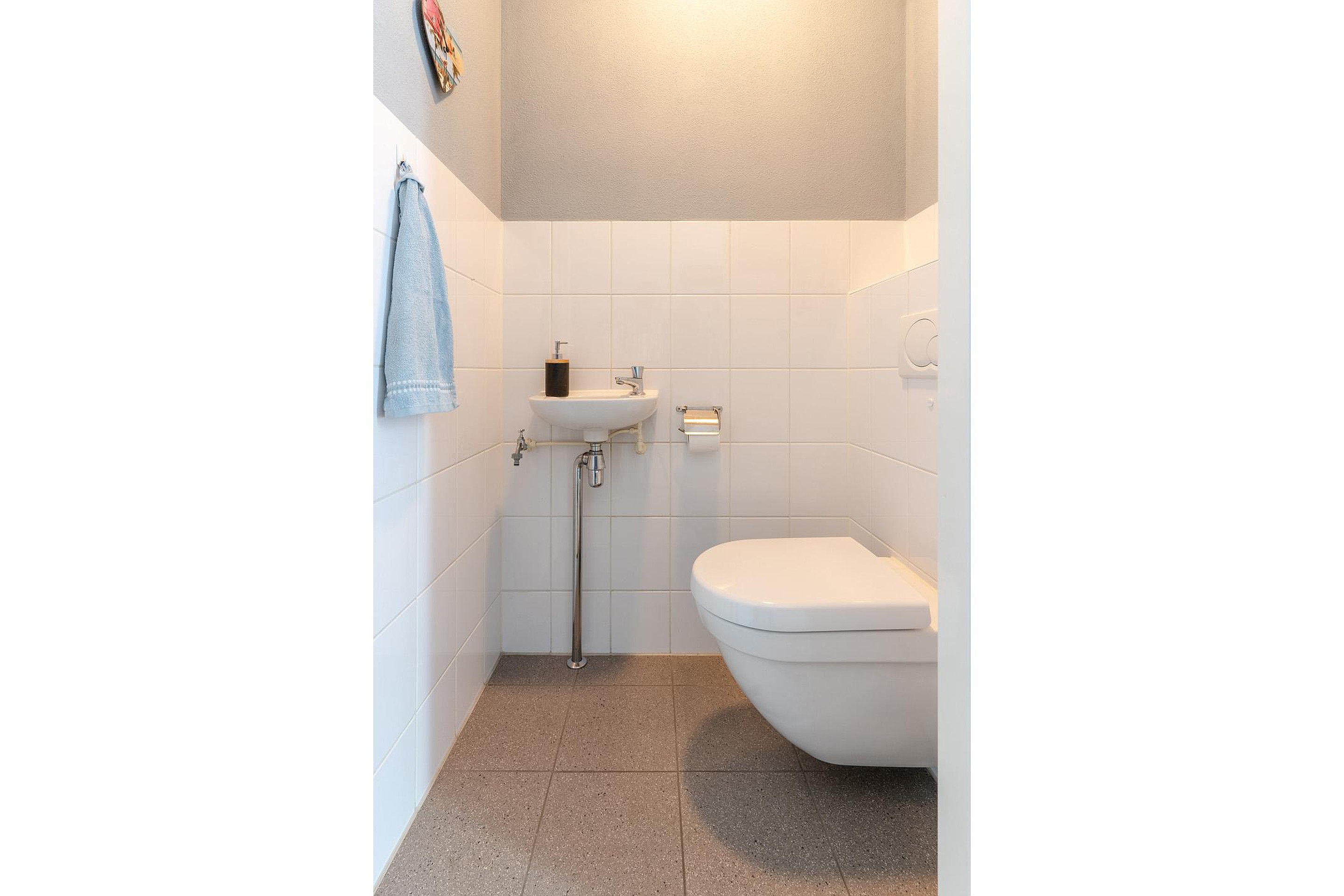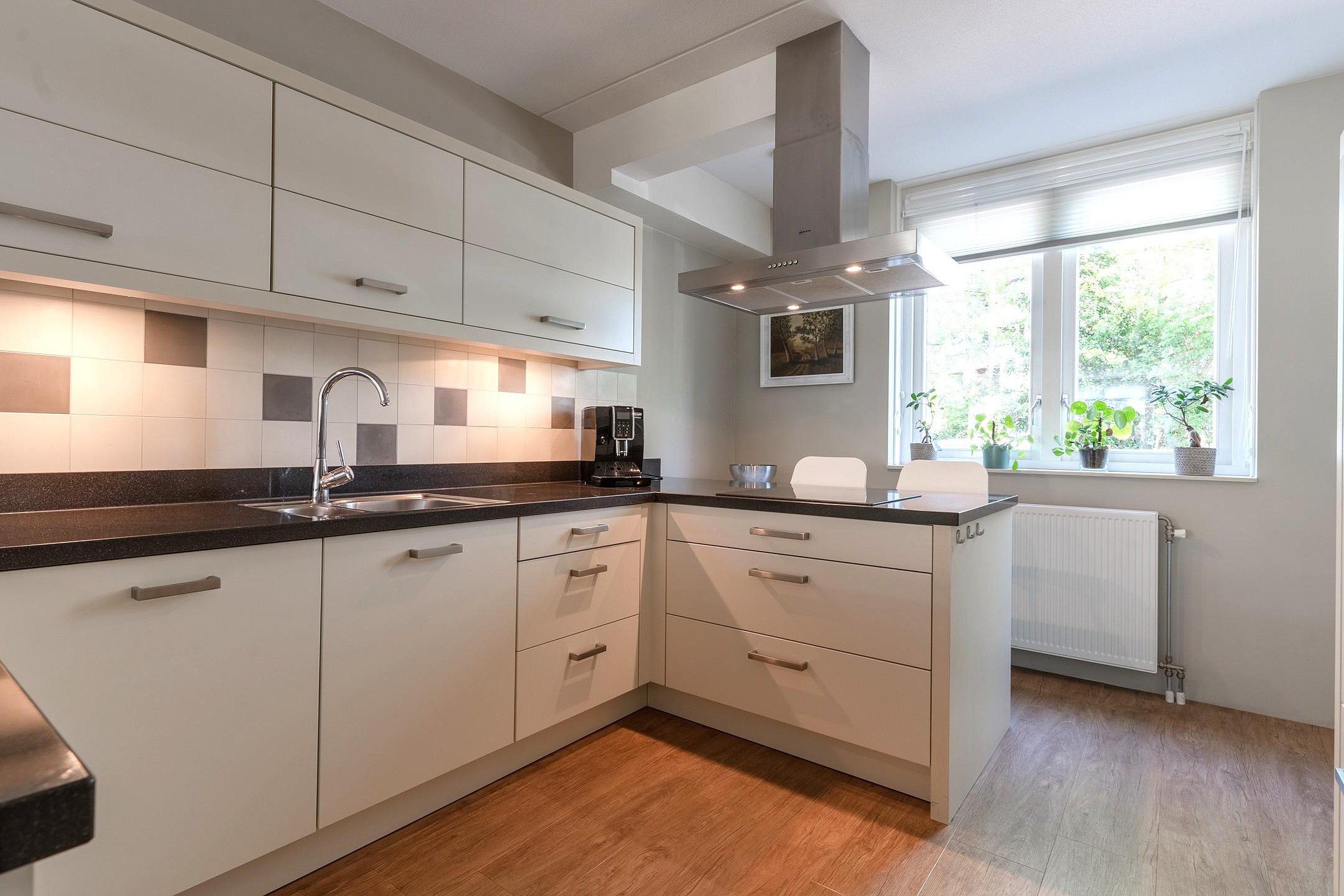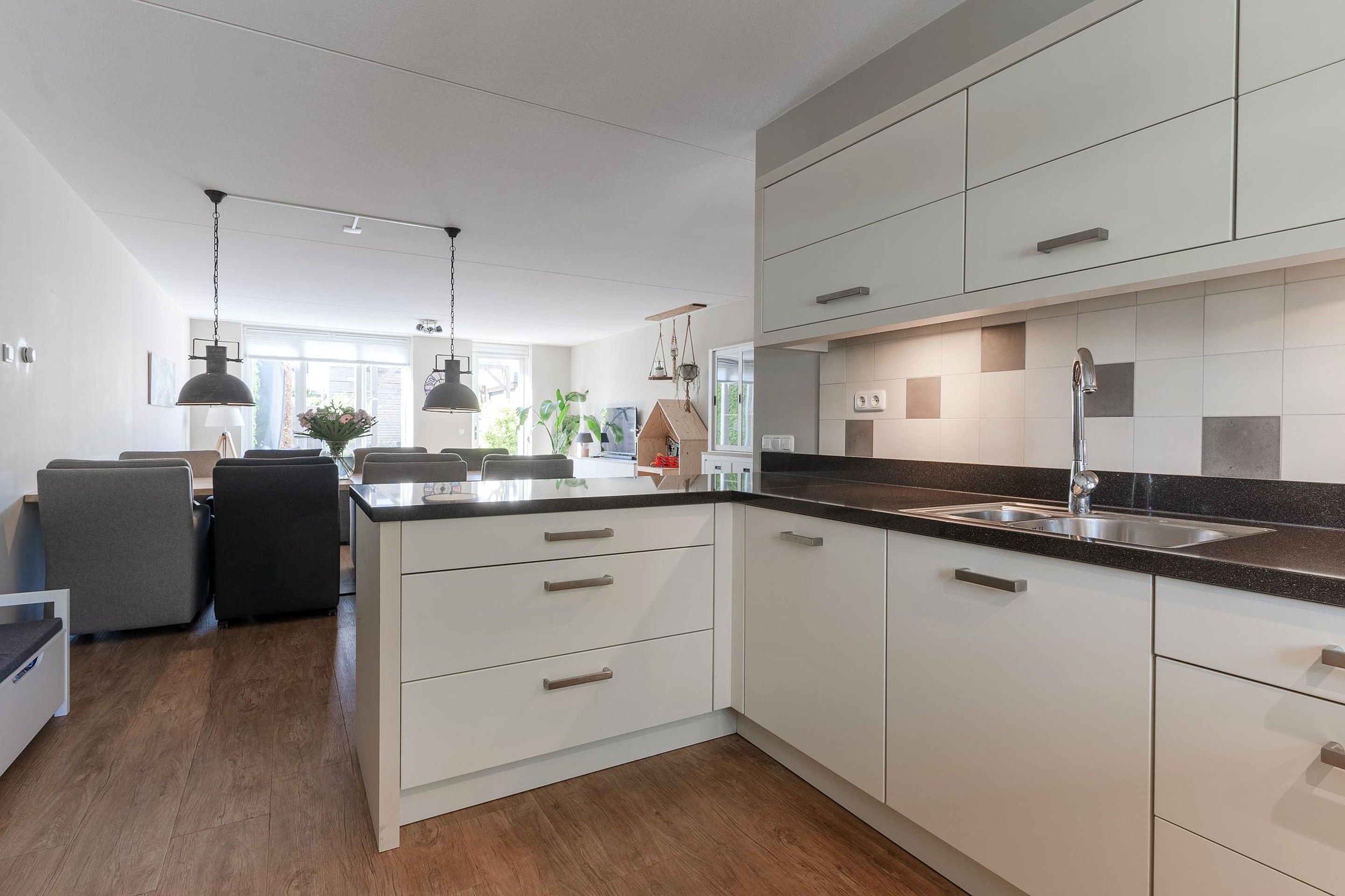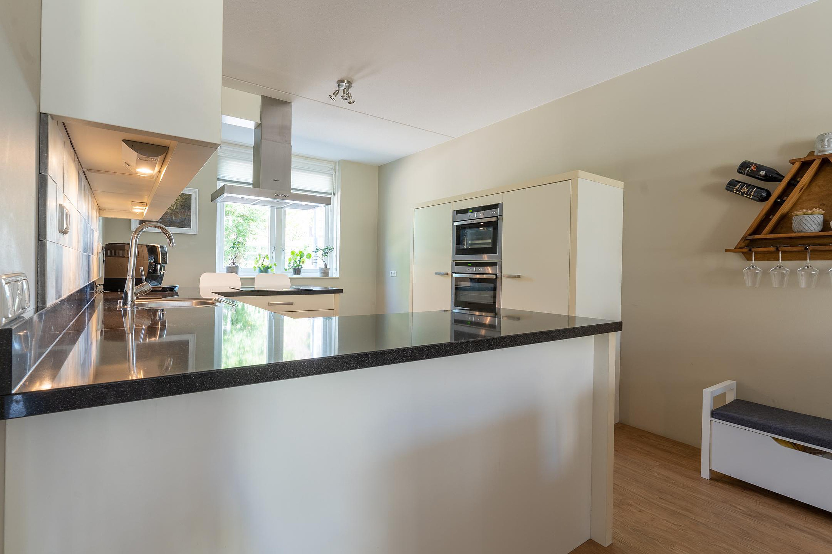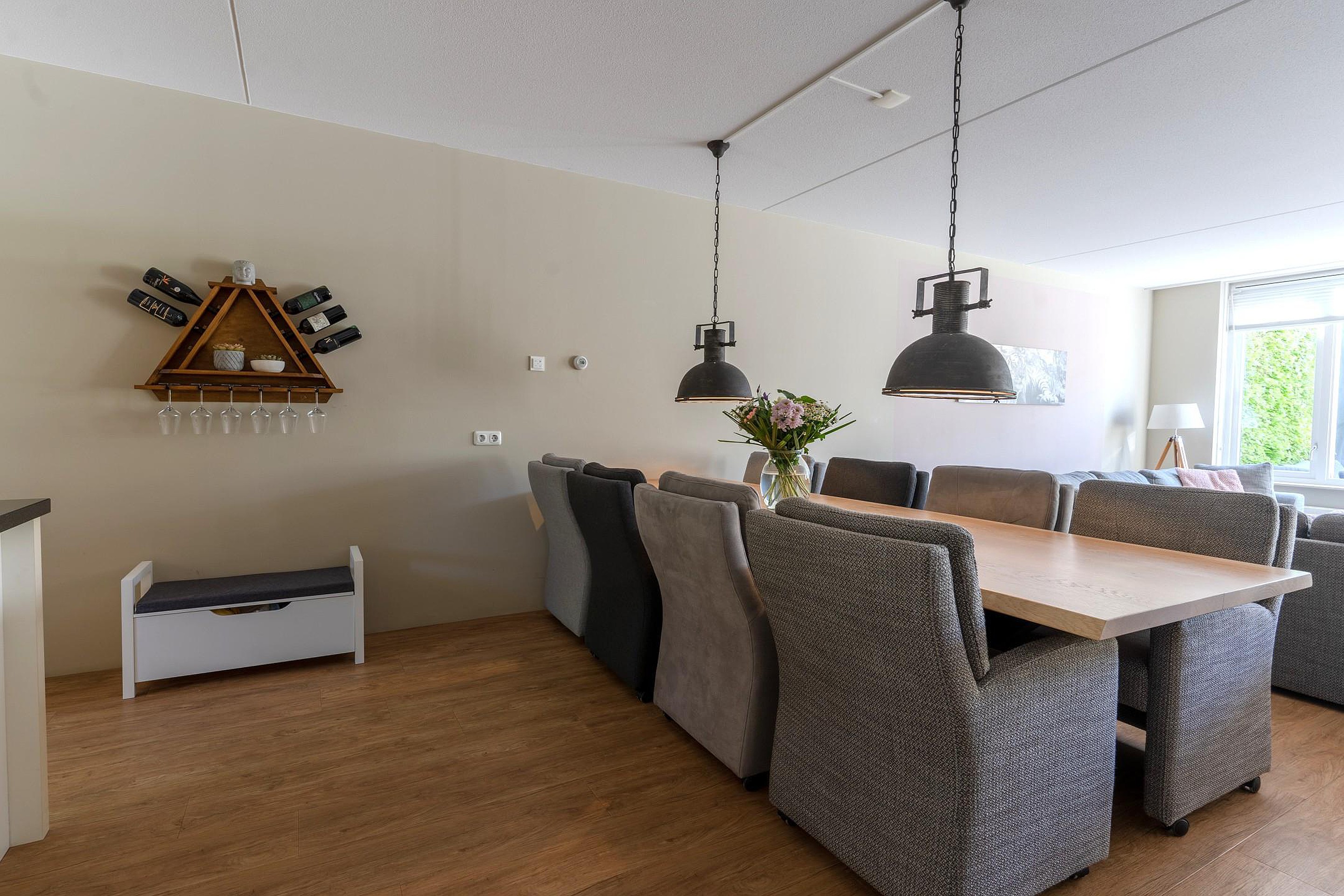 hal met toilet, grote uitgebouwde woonkamer met open keuken in U-vorm met eetbar aan de voorzijde. De gehele begane grond is voorzien van een mooie PVC-vloer met vloerverwarming.