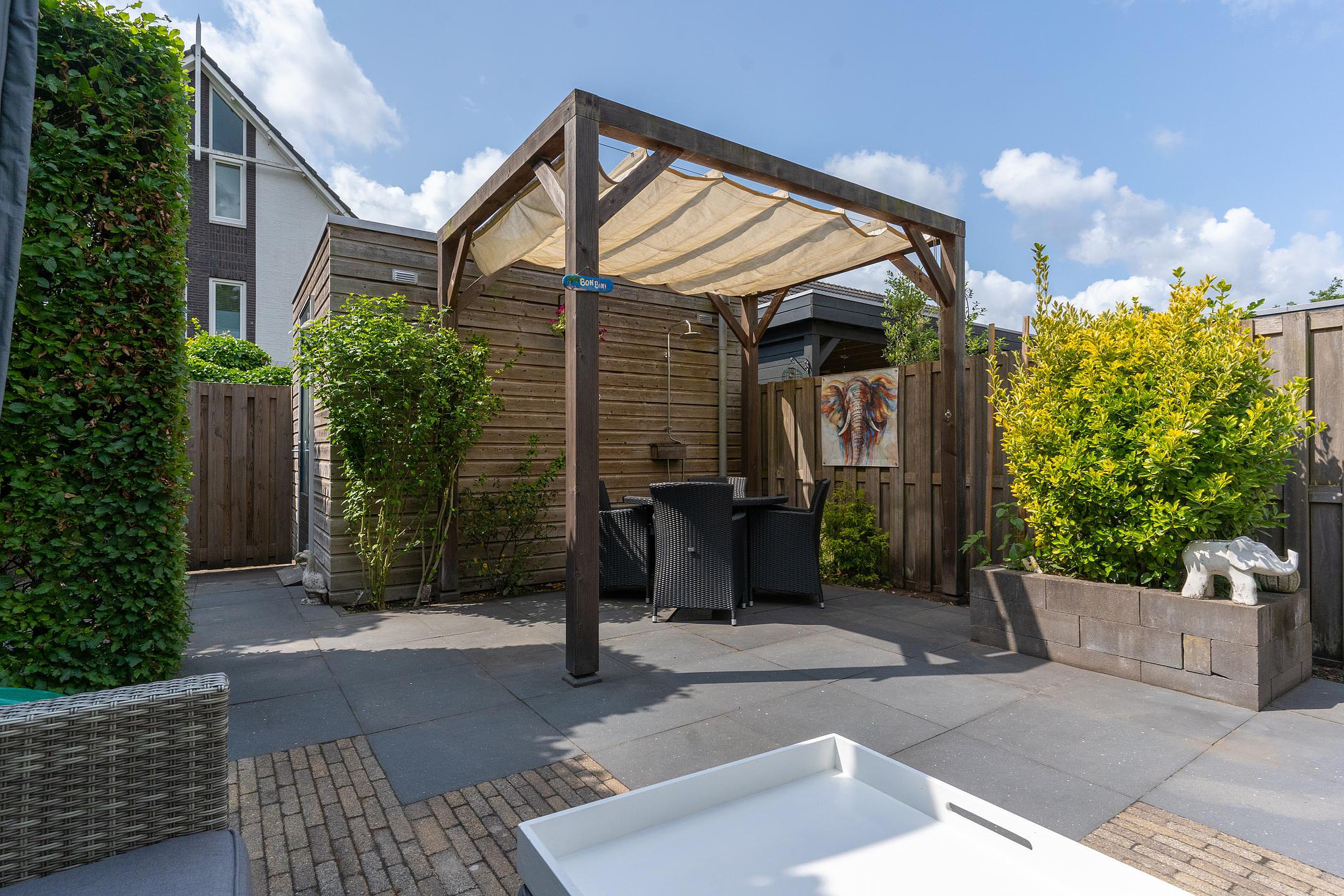 Deze heerlijke tuin is gelegen op het zuiden en heeft een afmeting van ongeveer 9 x 5,5 meter. De tuin is voorzien van een achterom, een ruime berging, een pergola met schaduwdoek en een buitendouche.
