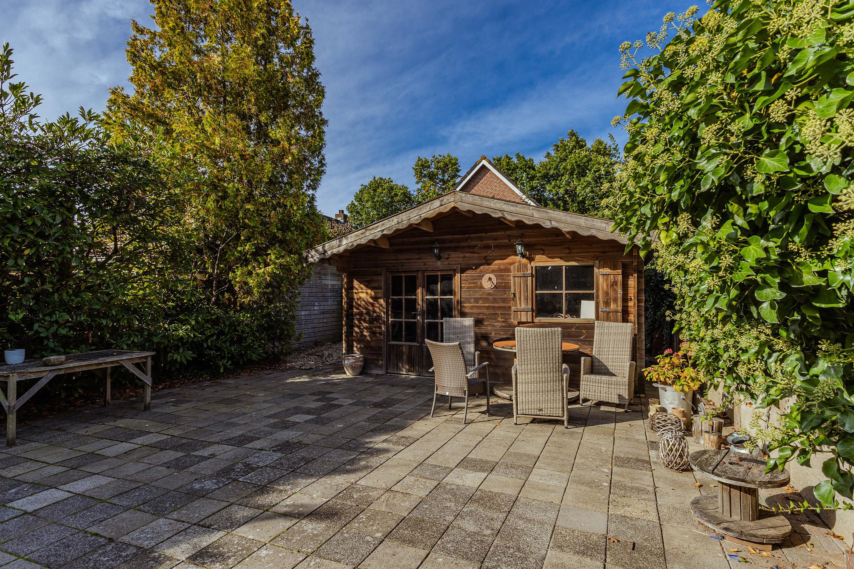 De heerlijke en circa 25 meter diepe achtertuin is gelegen op het westen en biedt volop ruimte en privacy. Hier vind je een vrijstaande stenen berging en achterop het perceel is een riant houten tuinhuis geplaatst. Direct aan de aanbouw grenst een overkapping, voorzien van een gezellige houtkachel. De tuin is grotendeels bestraat met aan beide zijden een groene haag welke voor veel privacy zorgt. De achterzijde wordt afgesloten met een nette houten schutting.
