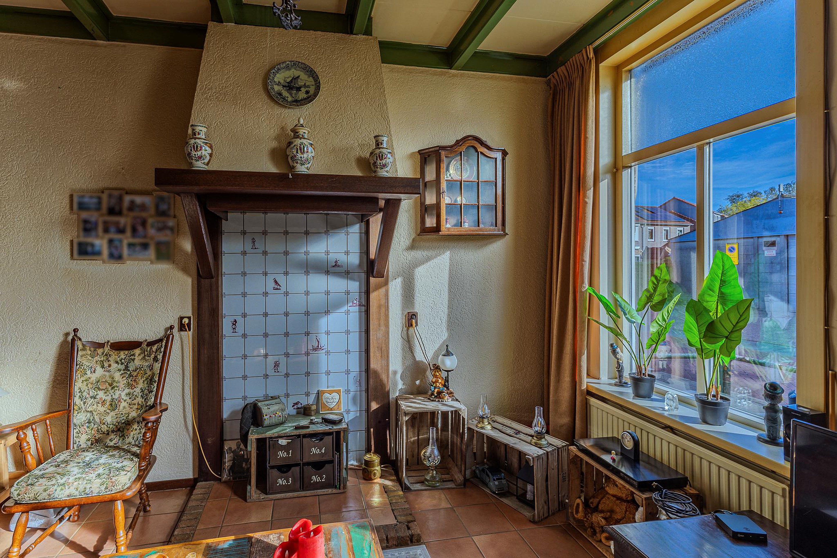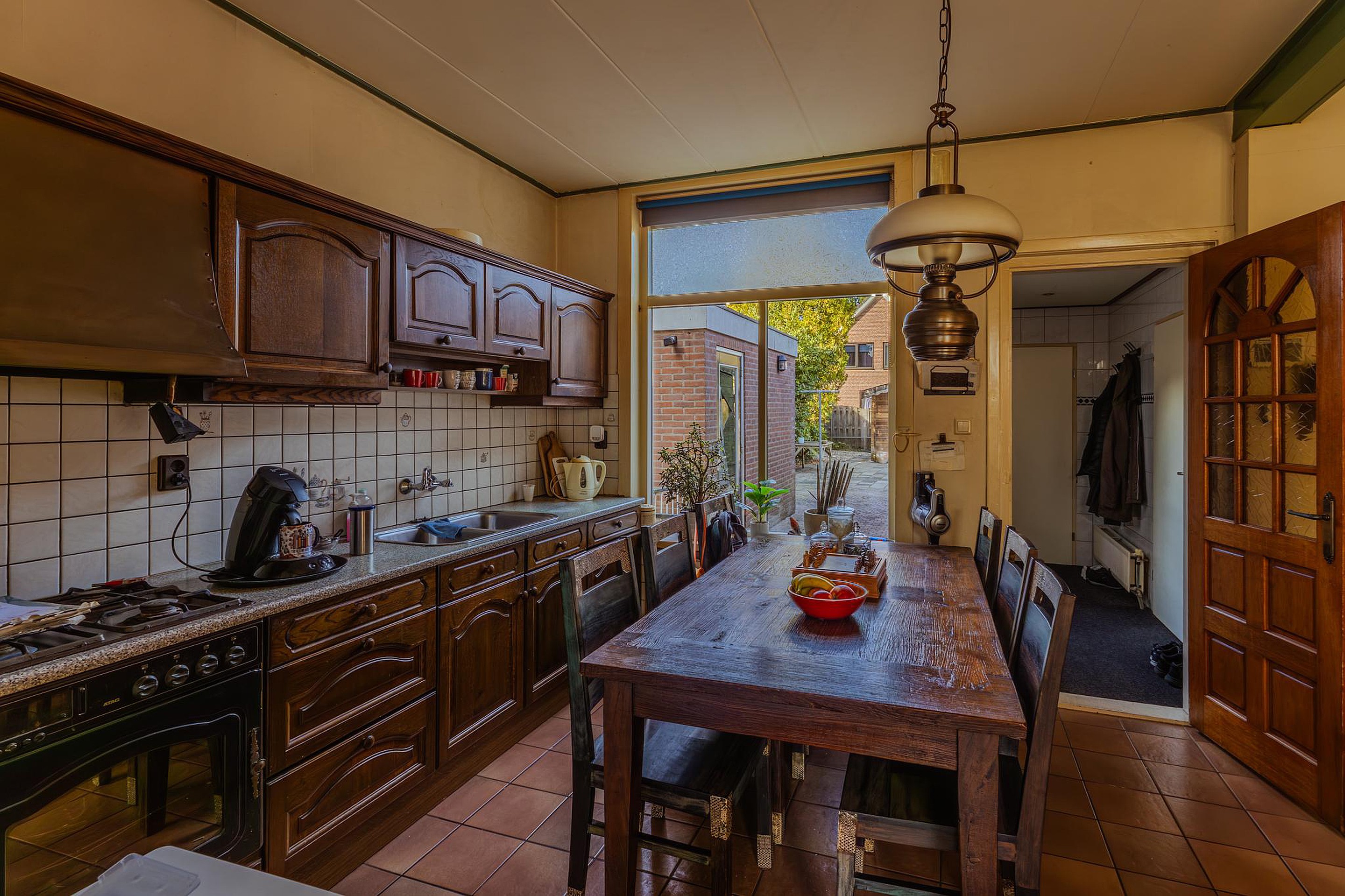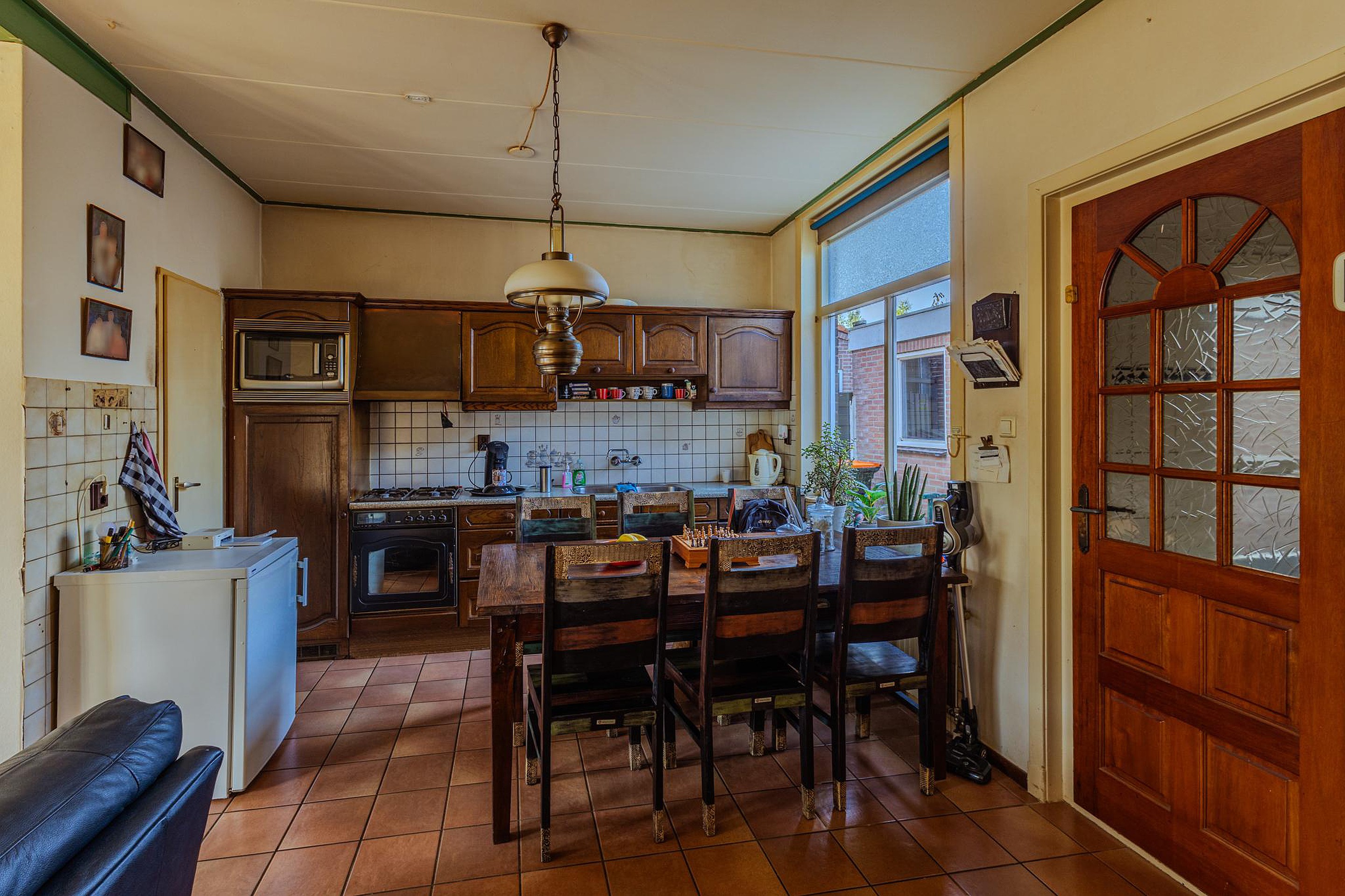 De entree vindt plaats in de hal voorzien van de trapopgang en de garderoberuimte. Aan de straatzijde van de woonkamer vind je de nog originele schouw met het evenzo originele tegelwerk waar omheen het zitgedeelte gesitueerd. Dankzij het hoge balkenplafond en de royale raampartijen geniet deze ruimte van veel natuurlijk licht. De open keuken is uitgerust met een dubbele rvs-spoelbak, een gasfornuis, diverse bovenkasten en een oven/magnetron. Vanuit de keuken toegang tot de ruime kelder-/proviandkast. In de aanbouw bevindt zich het achterportaal met toegang tot de tuin, de nette toiletruimte v.v. een staand toilet en een fonteintje en de badkamer. Deze ruime en geheel betegelde badkamer is voorzien van de witgoedaansluitingen, een inloopdouche, een wastafel met groot meubel en een vaste kast met de CV-installatie.