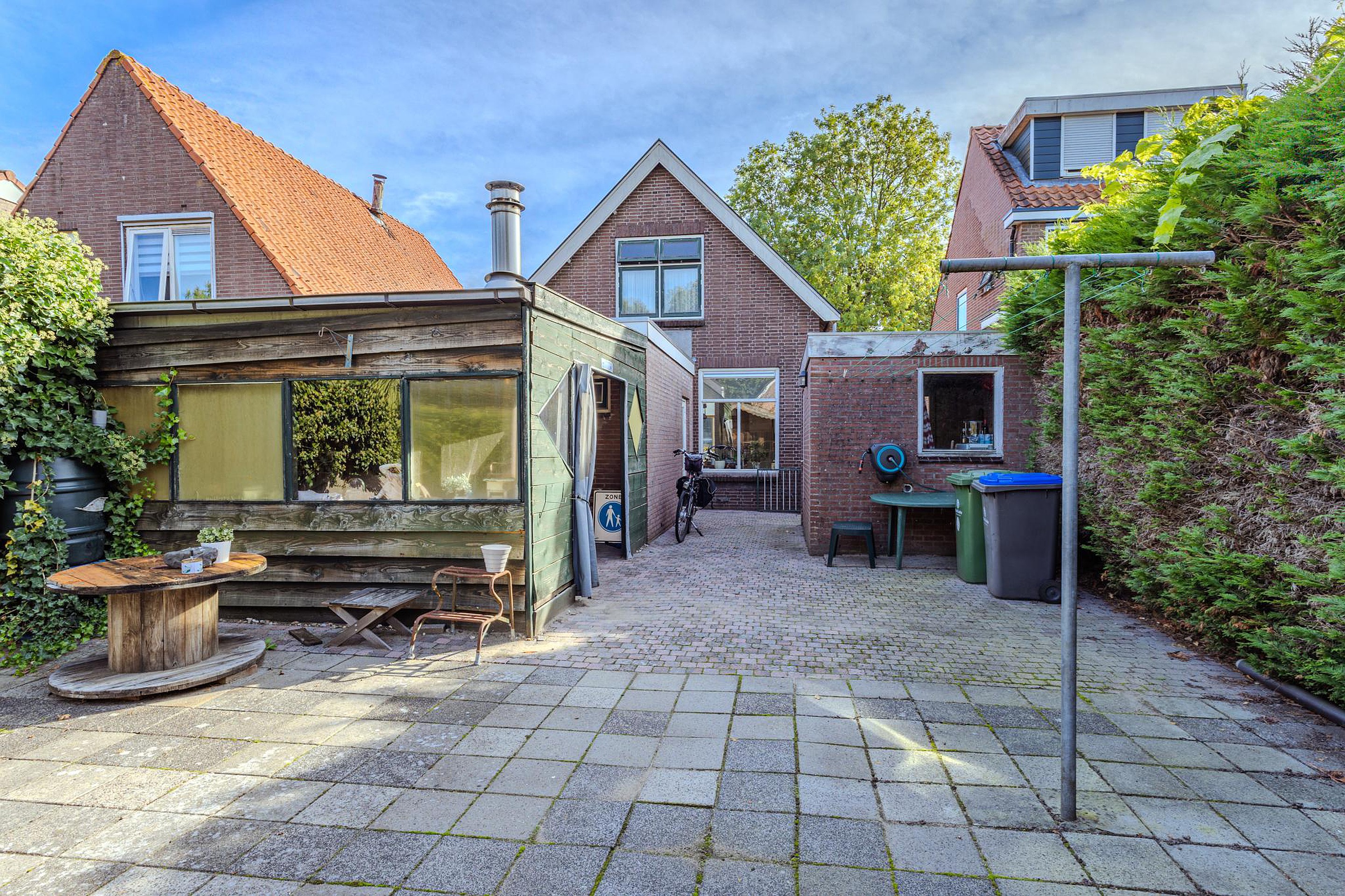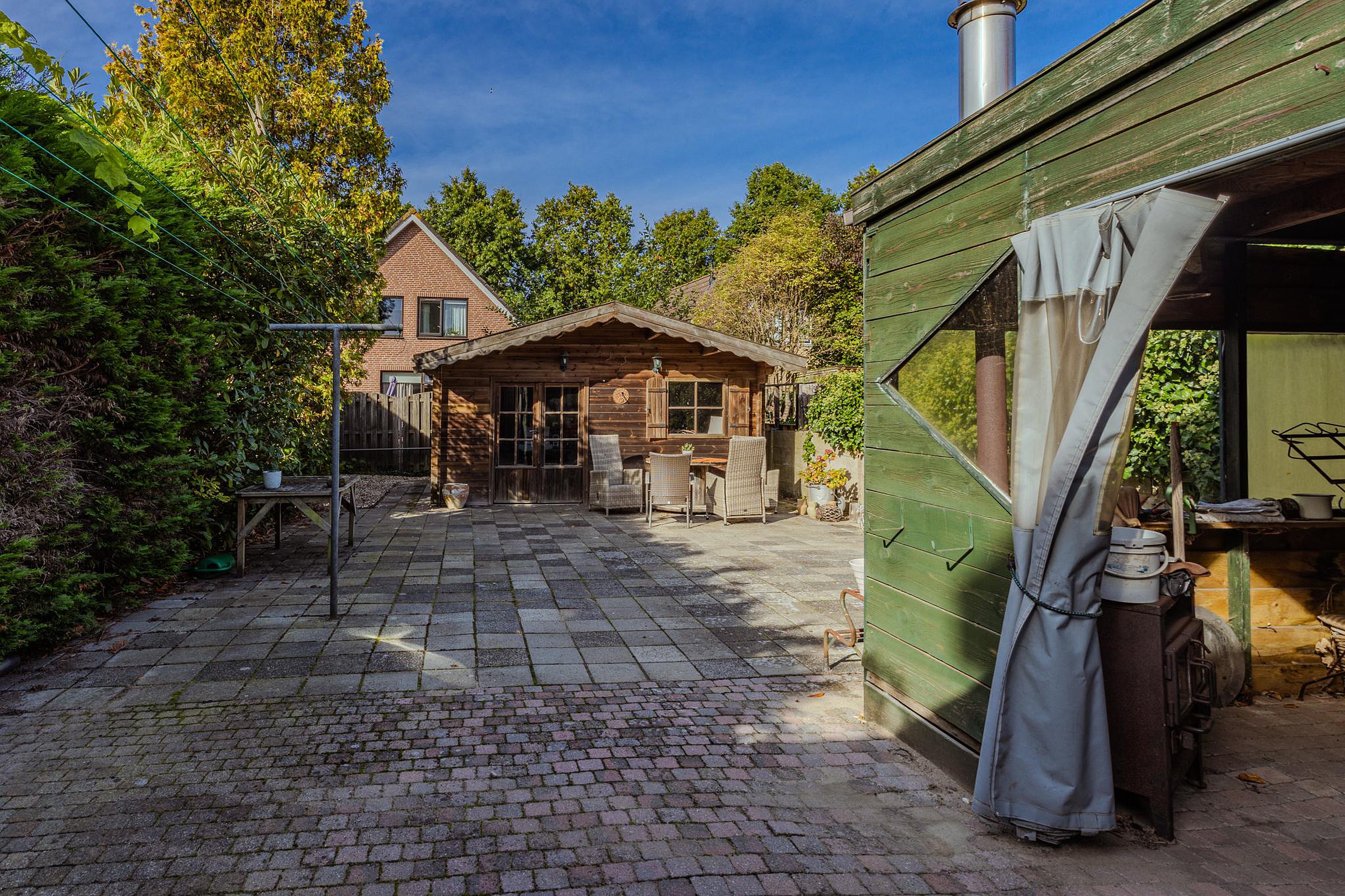 De diepe, op het westen gelegen achtertuin is een waar pluspunt: geniet hier van de middag- en avondzon. De tuin beschikt over een vrijstaande stenen berging, een ruim houten tuinhuis én een gezellige overkapping met zitgedeelte en houtkachel. Aan de zijkant van de woning is er bovendien de mogelijkheid om op eigen terrein te parkeren.