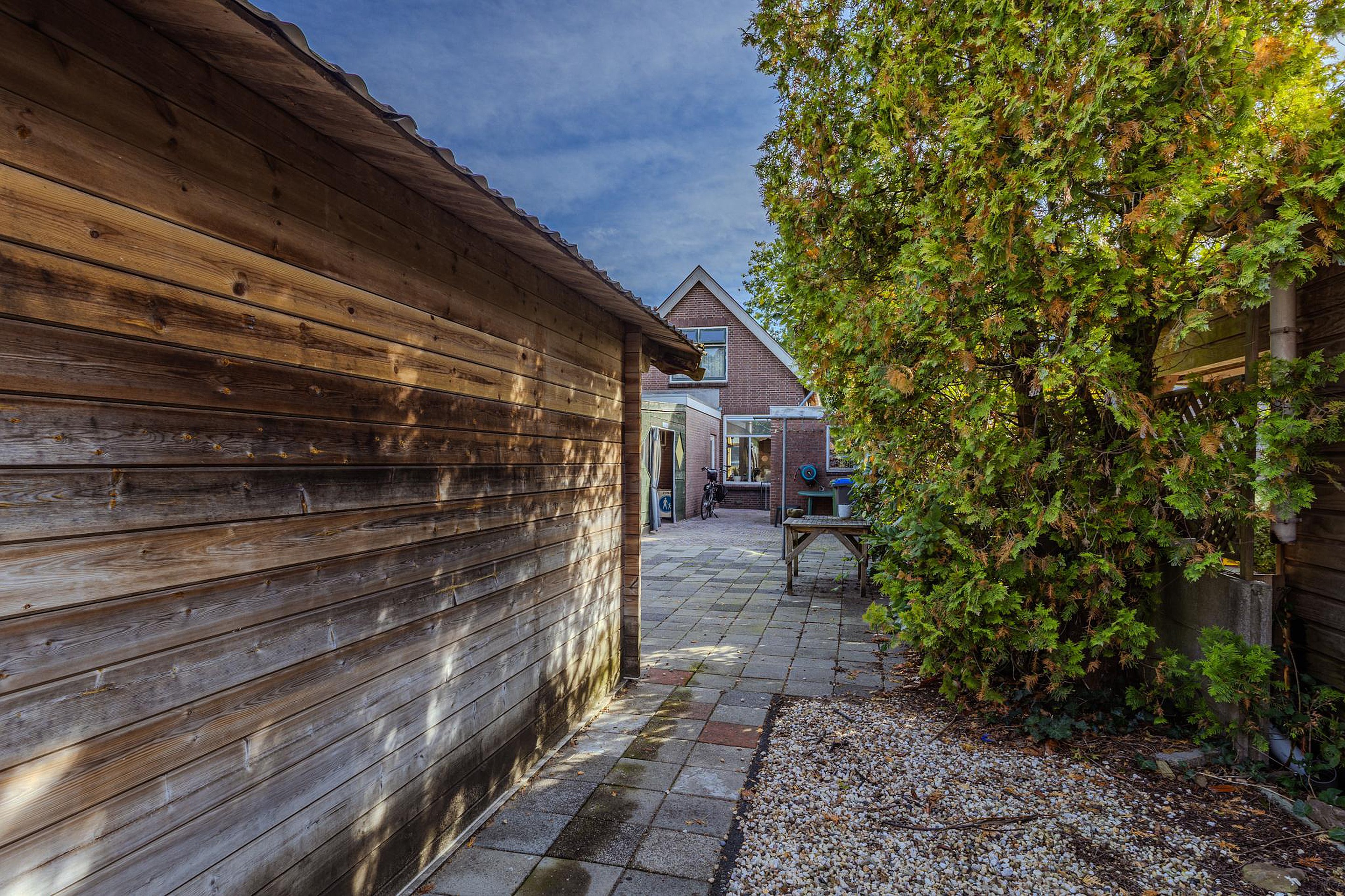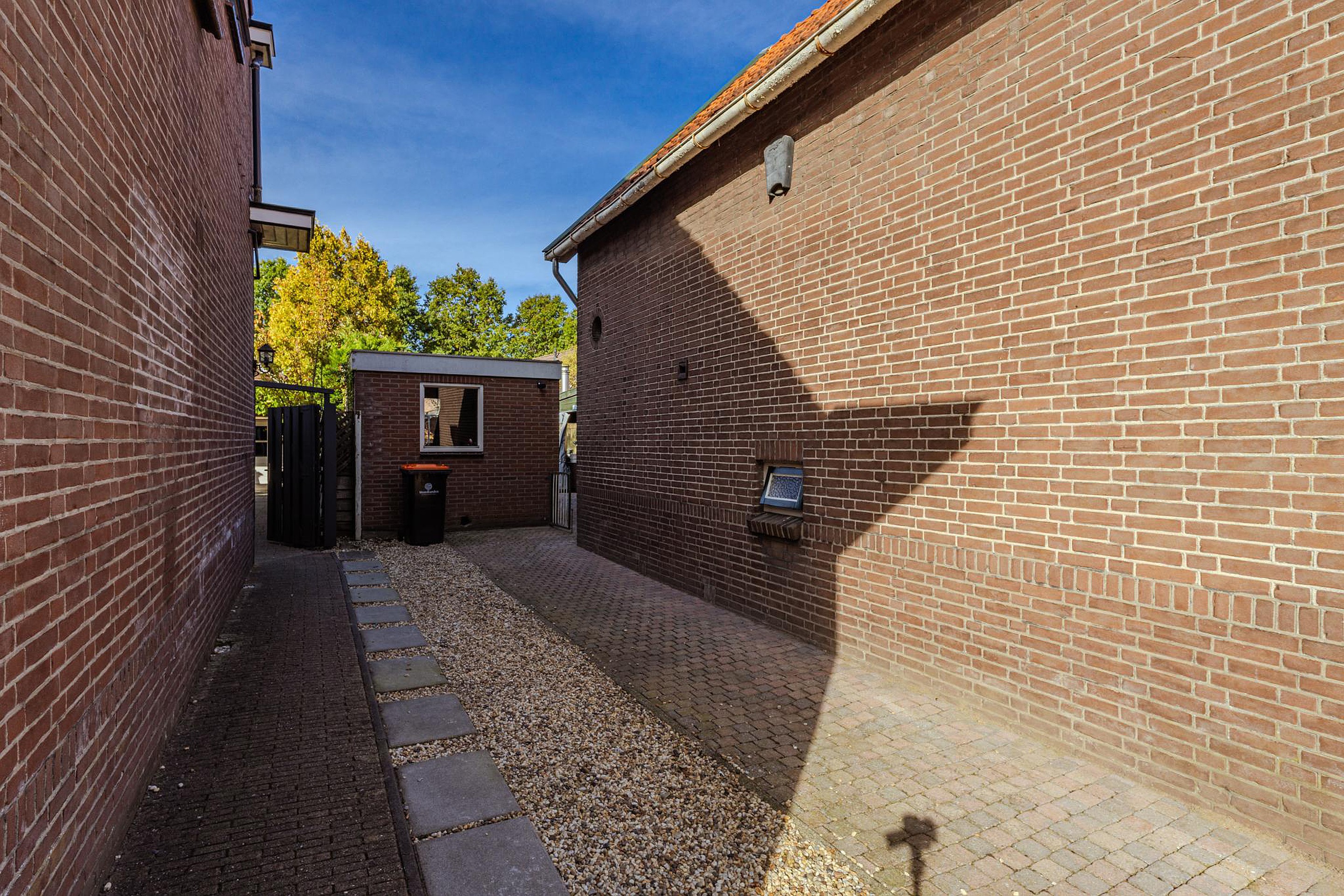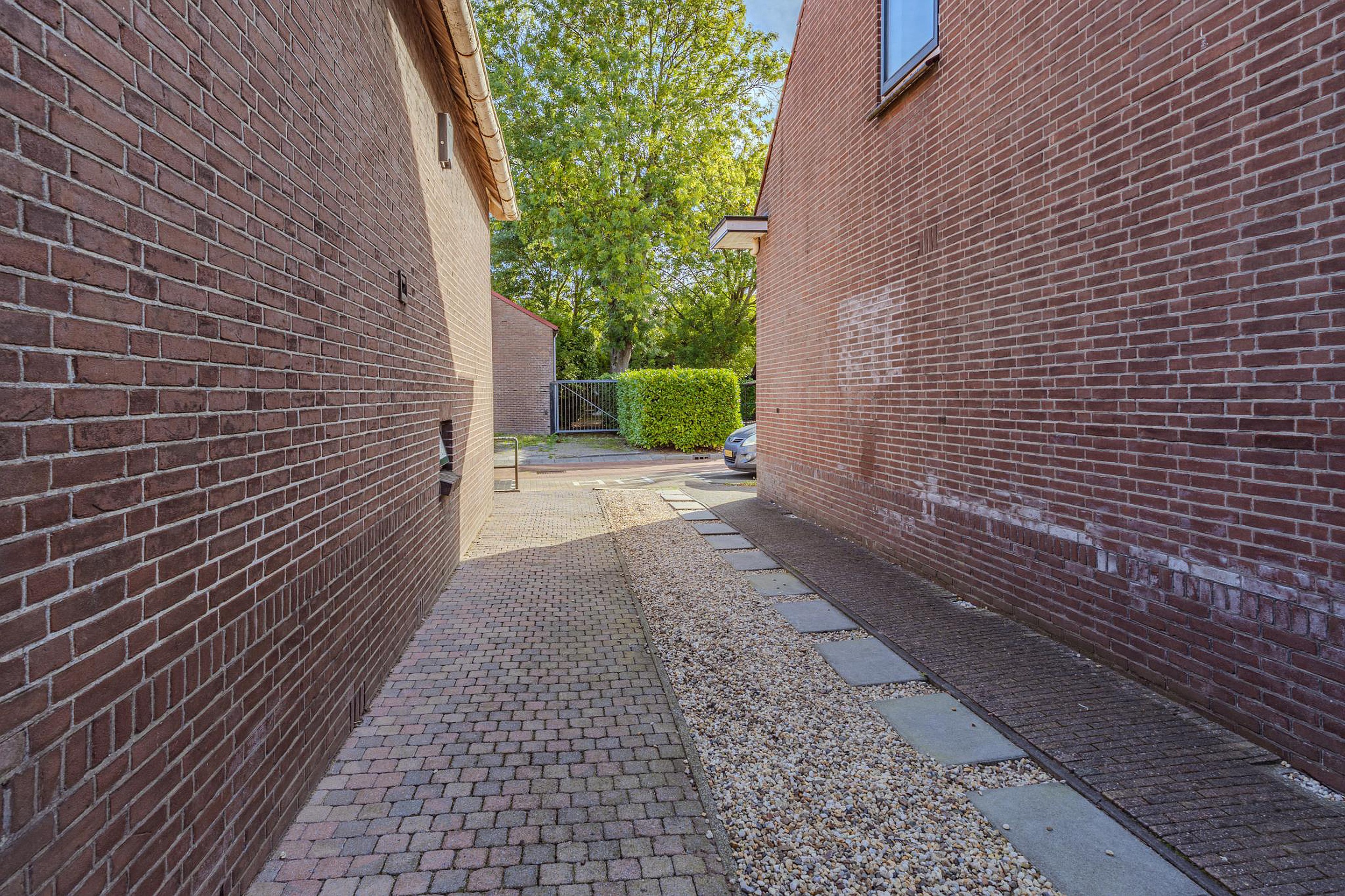 De volledig betegelde en omheinde voortuin gaat over in een pad dat deels is betegeld en deels met grind is aangelegd. Naast een achterom biedt dit pad ook ruimte om een of meerdere voertuig(en) op eigen grond te parkeren.