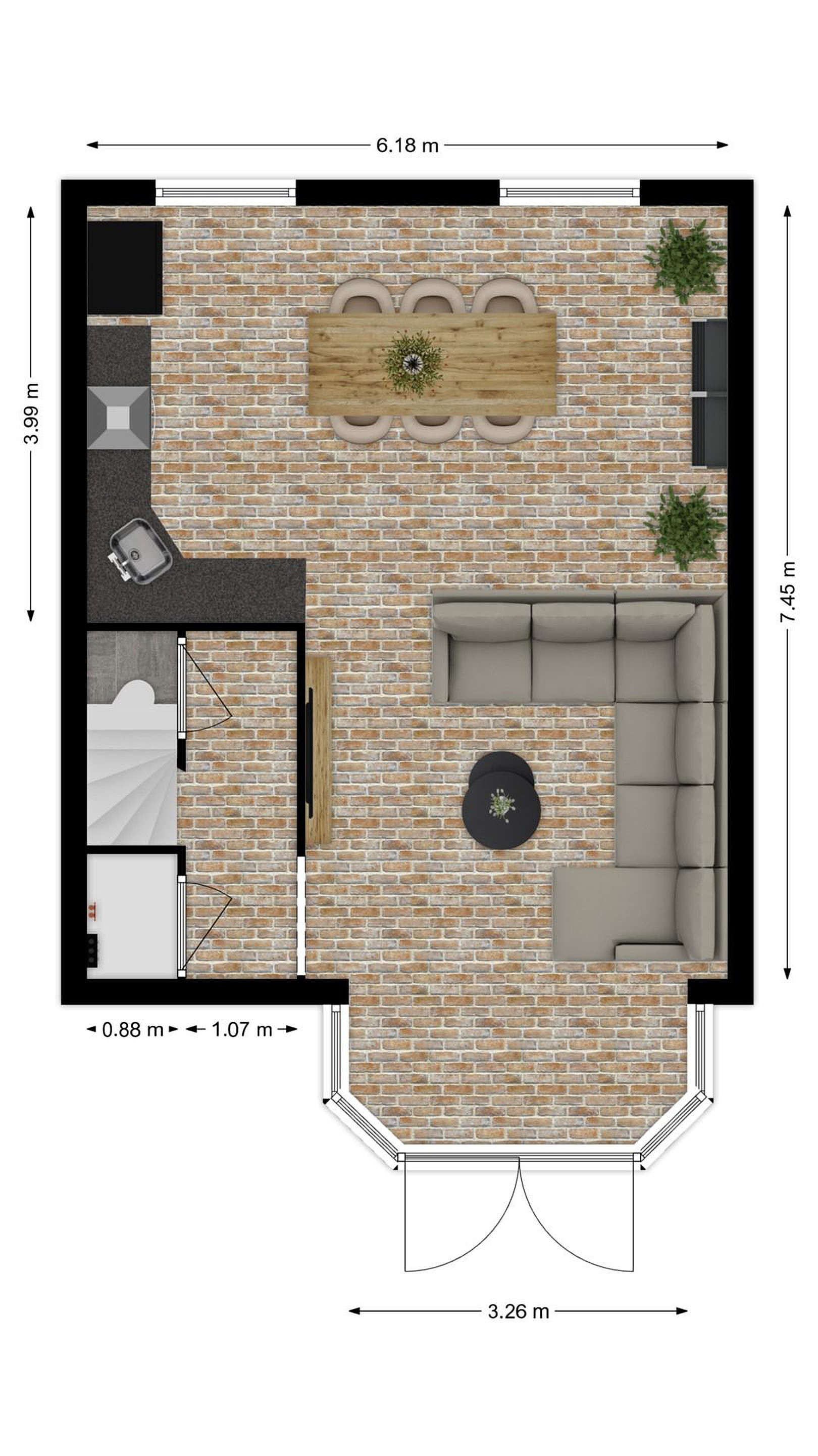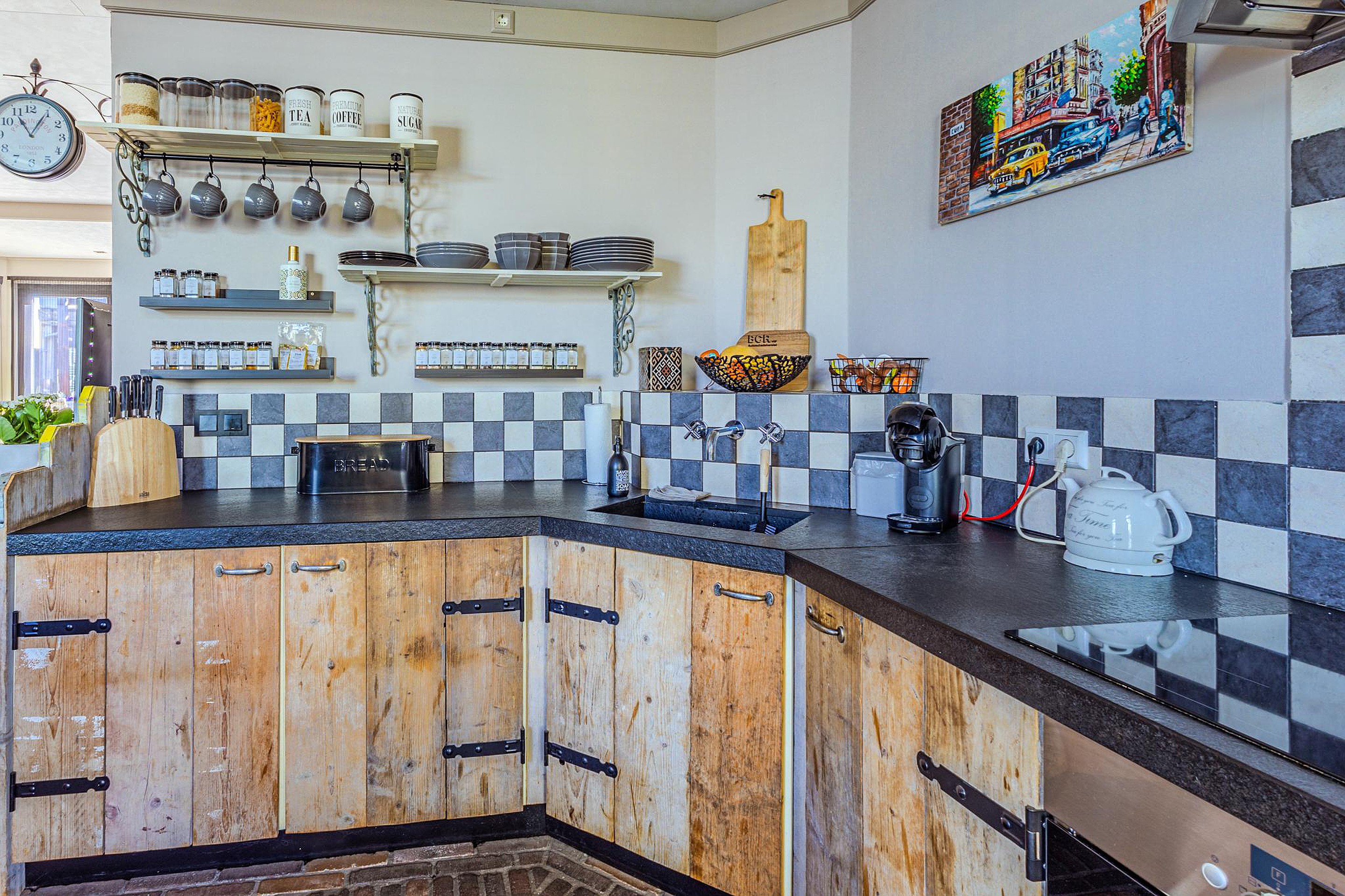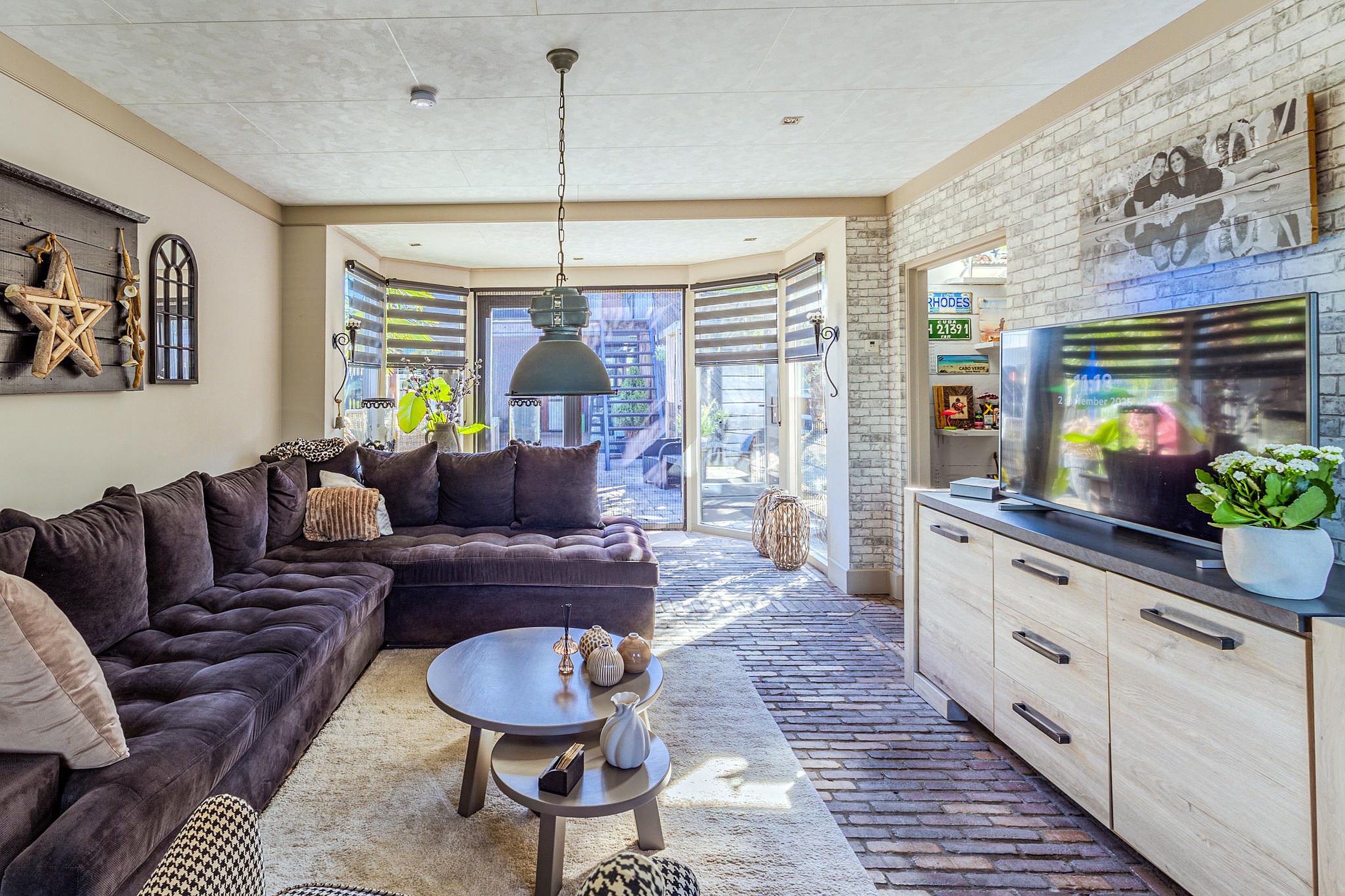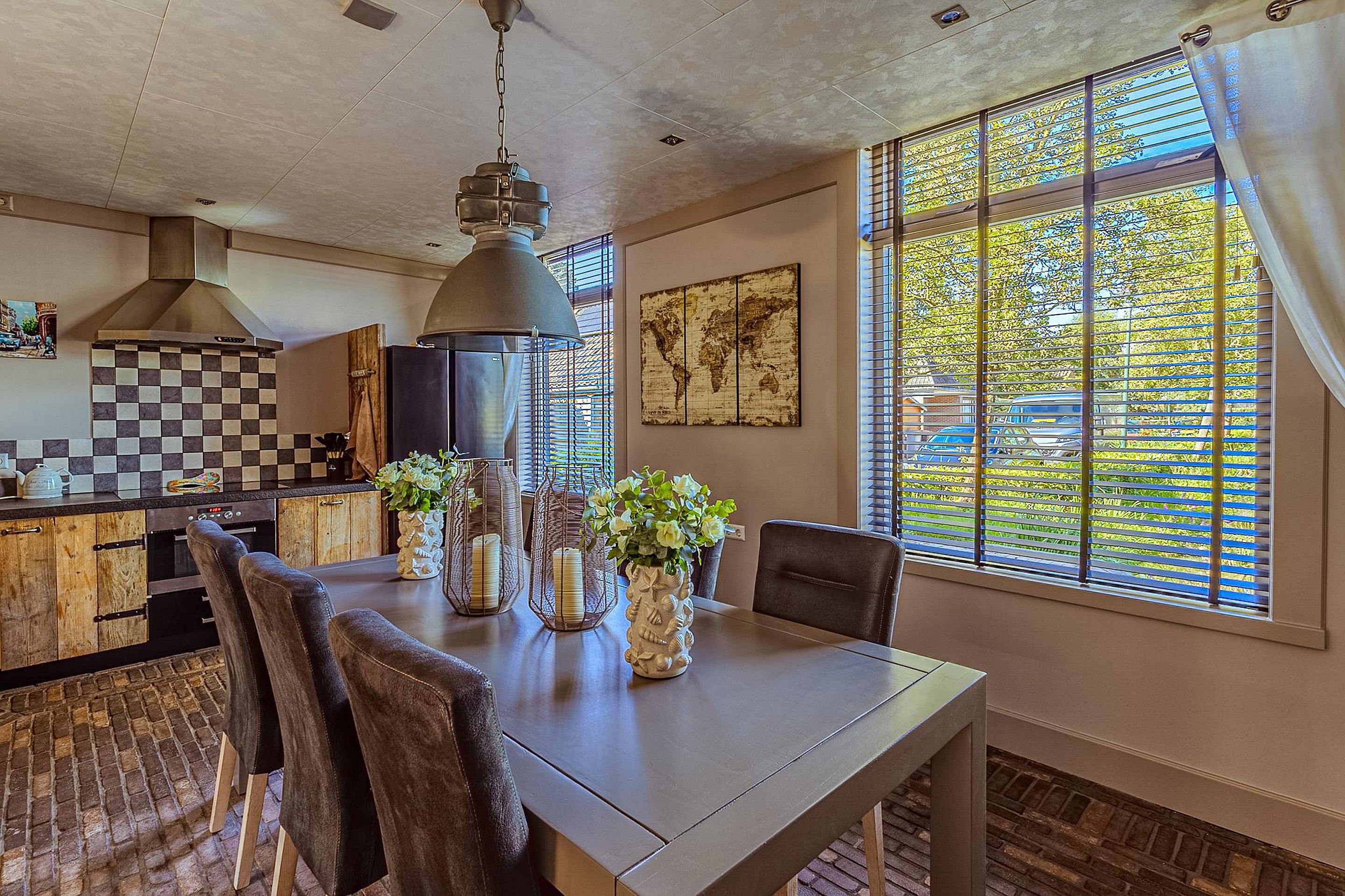 De huidige hoofdentree vindt plaats via de serre in de woonkamer, vandaar toegang tot de hal voorzien van de berg-/meterkast, de garderoberuimte, de nette toiletruimte voorzien van een zwevend toilet en de trapopgang. De ruime woonkamer (ca. 44 m2) is net als de etage voorzien van climate control en is bijzonder sfeervol aangekleed en afgewerkt met onder meer een originele bakstenen vloer. Het zitgedeelte is naar de serre / tuin gericht, terwijl het eetgedeelte nabij de keuken is gesitueerd. Deze handgemaakte open keuken in L-opstelling is voorzien van een hardstenen aanrechtblad en diverse opbergmogelijkheden. Hiernaast is de keuken uitgerust met diverse inbouwapparatuur als een inductiekookplaat, een vaatwasser en een combi-oven/magnetron. De grote raampartijen in dit gedeelte zijn voorzien van rolluiken.