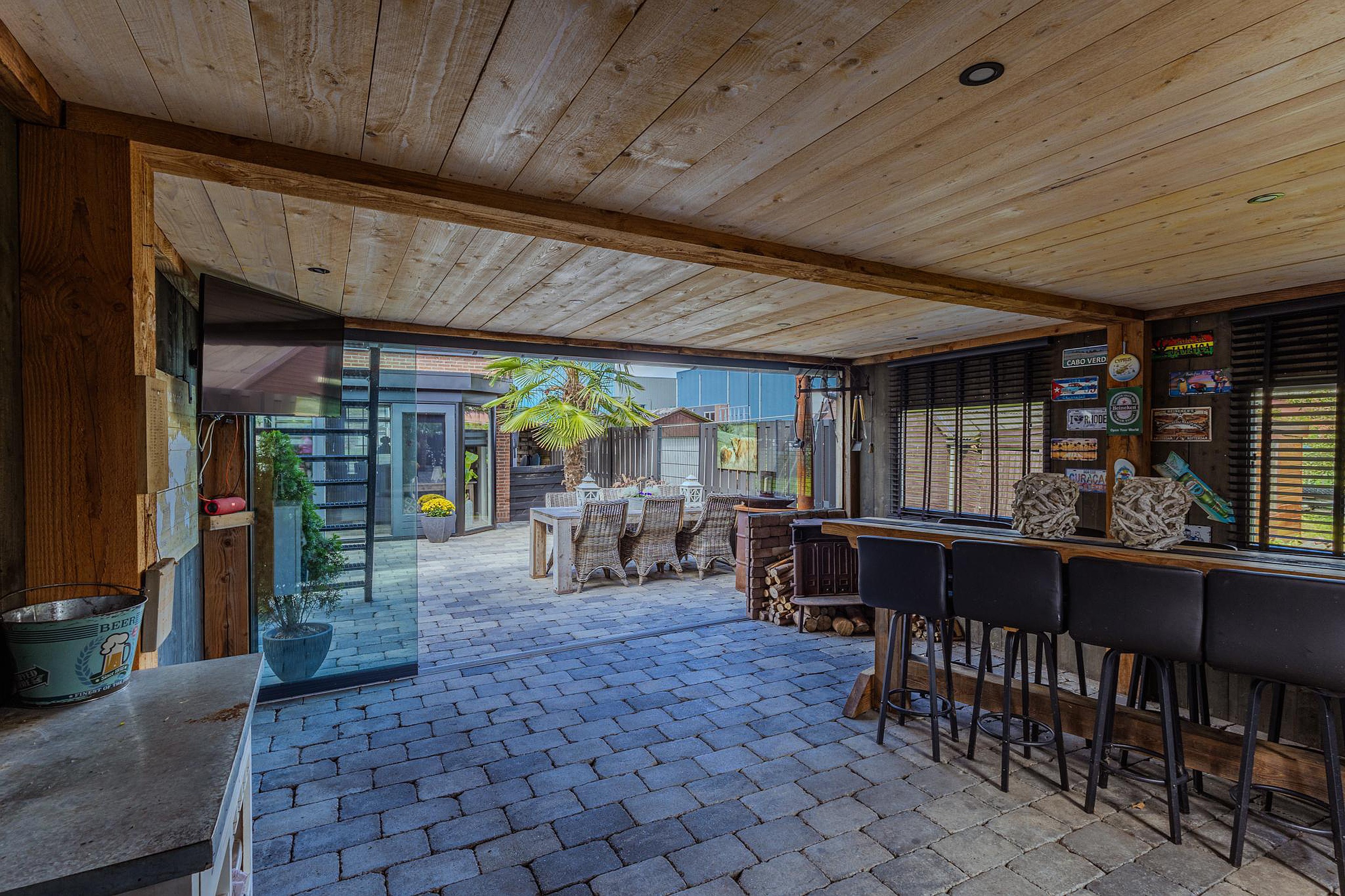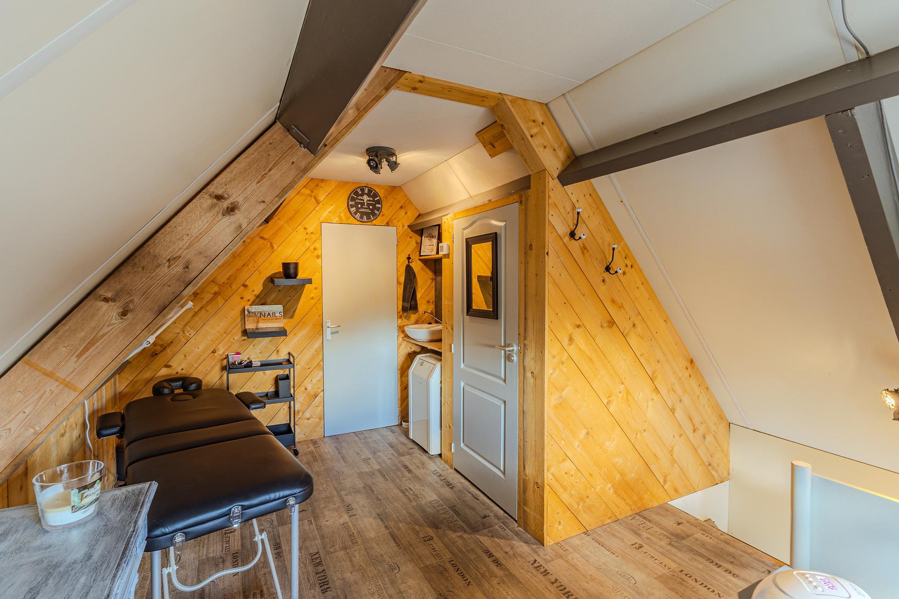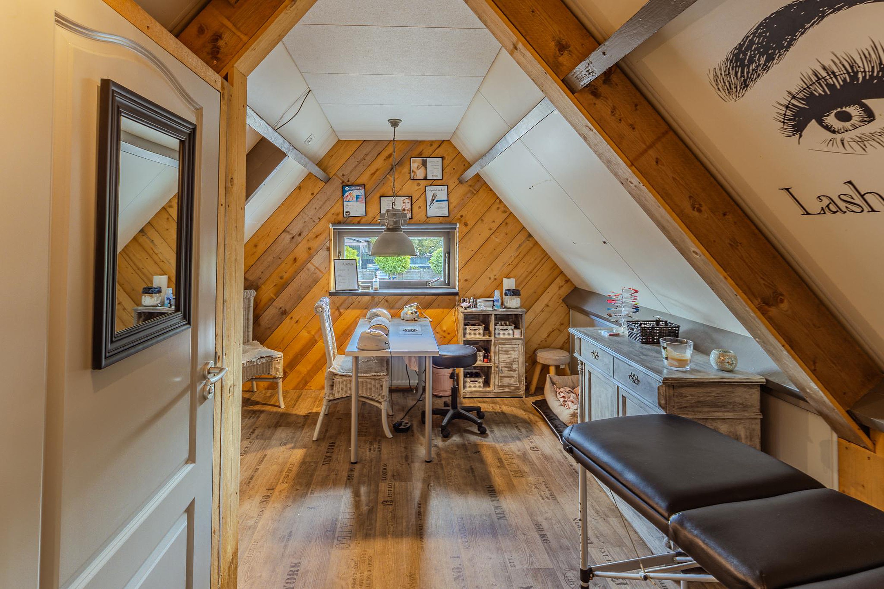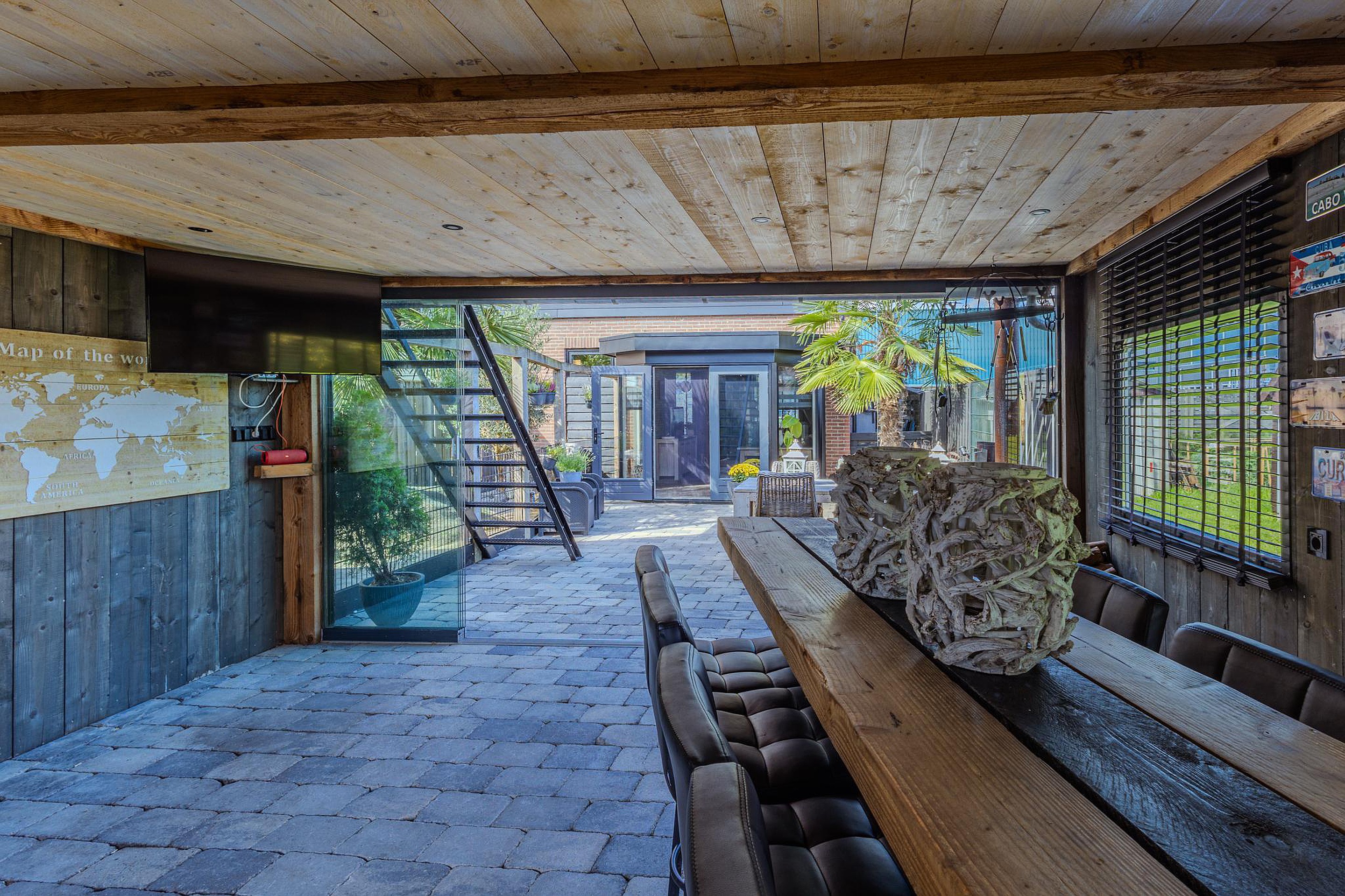 Grenzend aan de garage / werkplaats is een oergezellige en d.m.v. een glazen schuifwand geheel afsluitbare loungeruimte van ca. 25m2 gecreëerd. Deze ruimte is voorzien van elektra en een wateraansluiting. Door middel van een barndeur eveneens toegang tot de zijtuin.