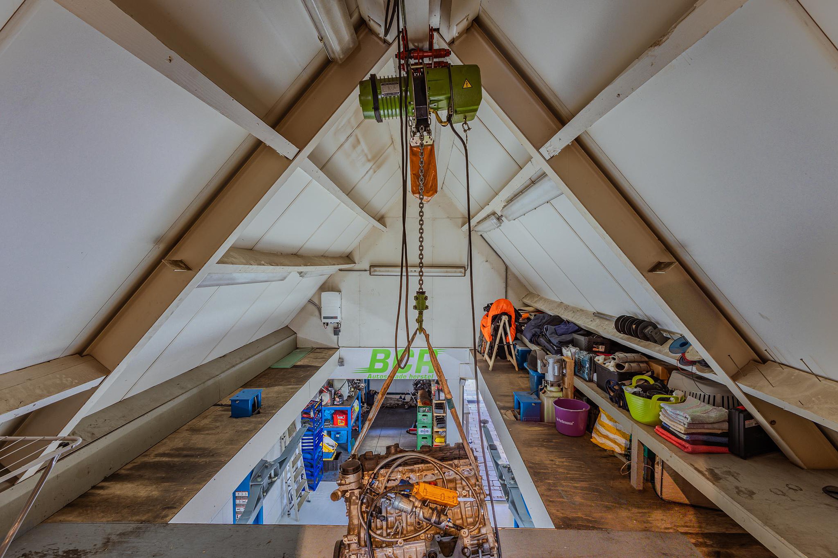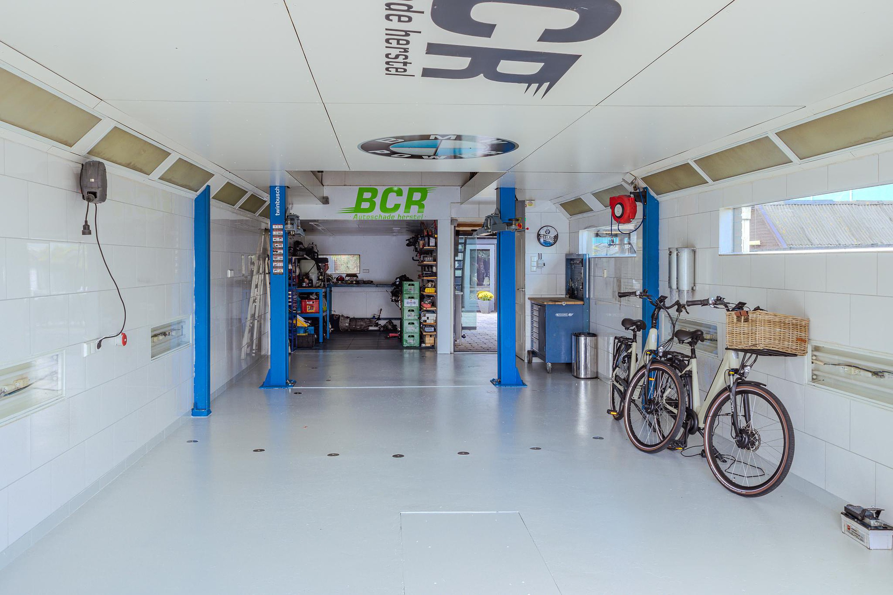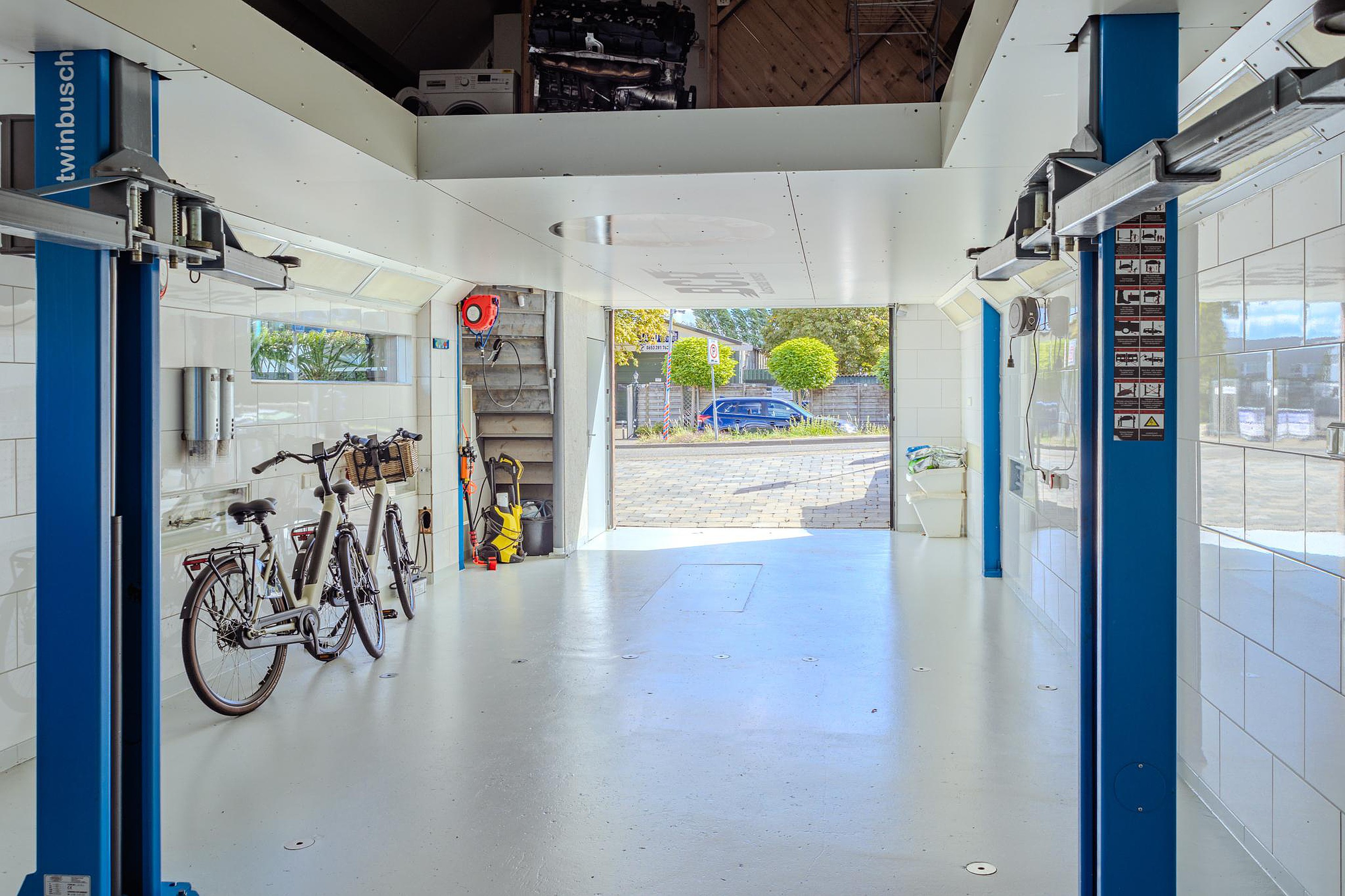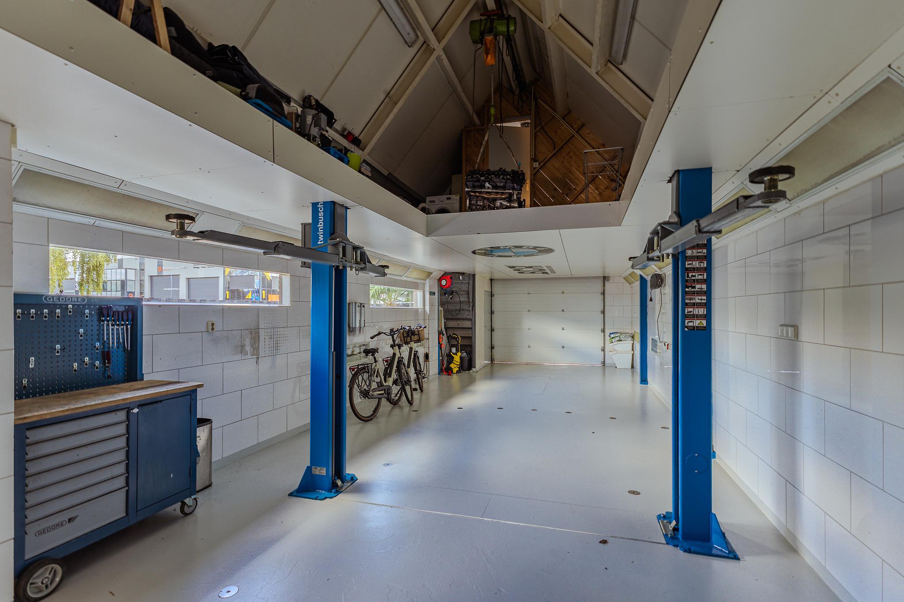 In 2010 is het perceel uitgebreid met een multifunctionele, ruime en geheel onderheide en volledig geïsoleerde garage / werkplaats met een oppervlak van ca. 70 m2 en een nokhoogte van ca. 5.30 m. De ruimte is uitgerust met 2 autobruggen en een kraanbaan welke 1.500 kg kan tillen. Op het dak zijn verder 21 zuidgerichte zonnepanelen geplaatst. De begane grond van deze ruimte is voorzien van vloerverwarming en is vanuit de Helling toegankelijk via een elektrische overheaddeur en/of via de eigen opgang welke uitkomt in de hal met trapopgang. De achterzijde van deze ruimte biedt toegang tot de loungeruimte. De grotendeels halfopen etage is aan de Hellingzijde ingericht als salon cq. praktijkruimte met op de begane grond een eigen opgang. In deze ruimte vind je een keurige toiletruimte, een wasmeubel en berging achter de schotten. Via een tussendeur bereik je de halfopen zolder met witgoedaansluitingen, een 2de CV-installatie en de omvormer voor de zonnepanelen.