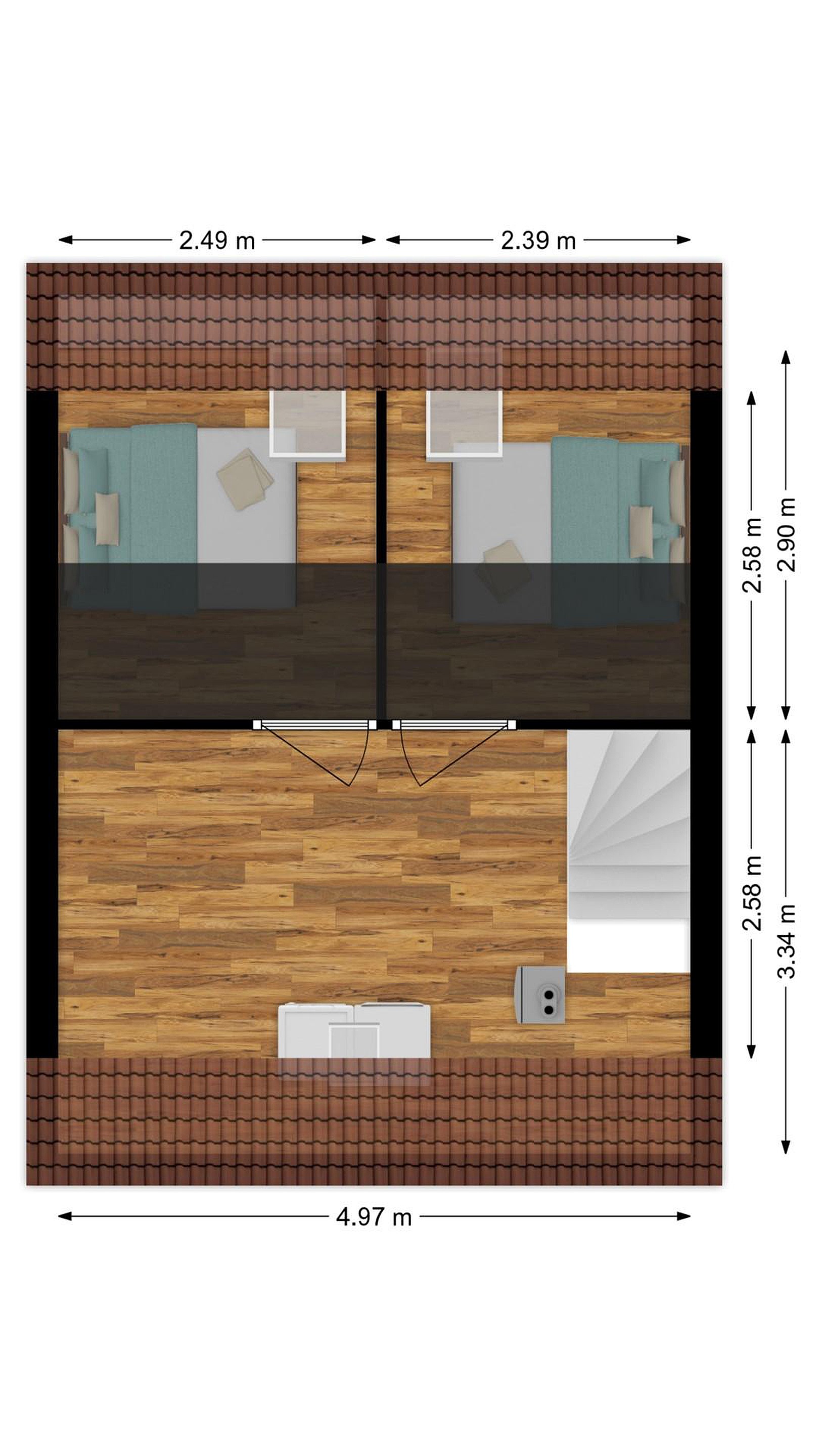 De ruime voorzolder is uitgerust met de CV-installatie (2021) en de witgoedaansluitingen. Boven de slaapkamers is een bergingsvliering gecreëerd. Deze beide slaapkamers hebben, naast de gezamenlijke doorgang, een aparte opgang en zijn uitgerust met een dakraam v.v. verduisterend screen en berging achter de schotten.