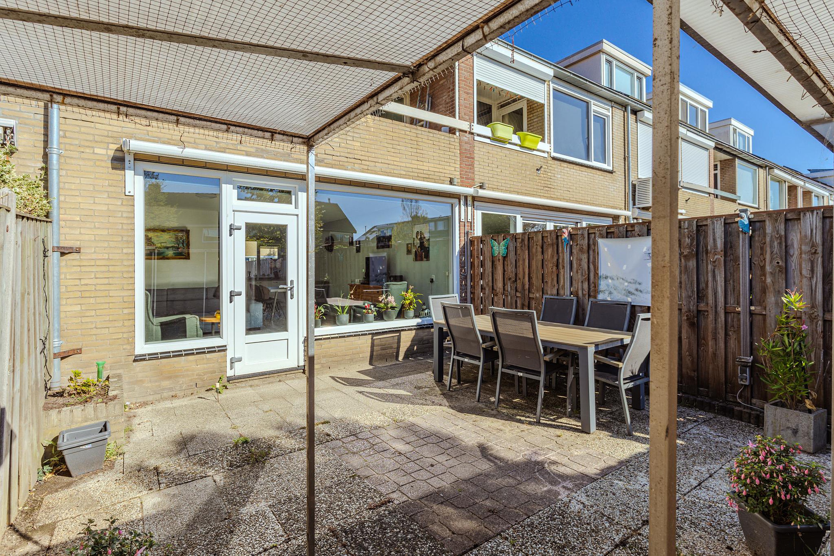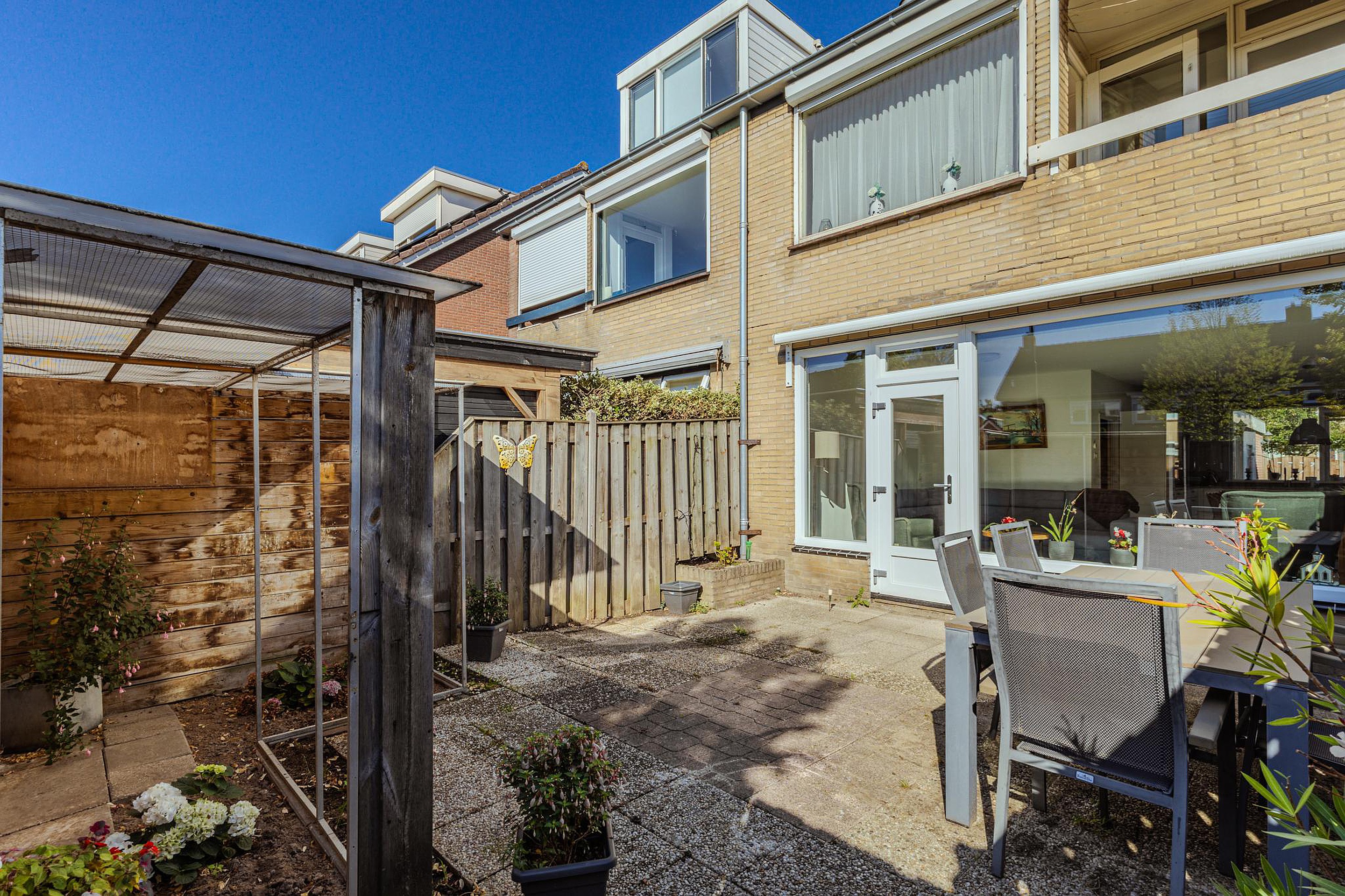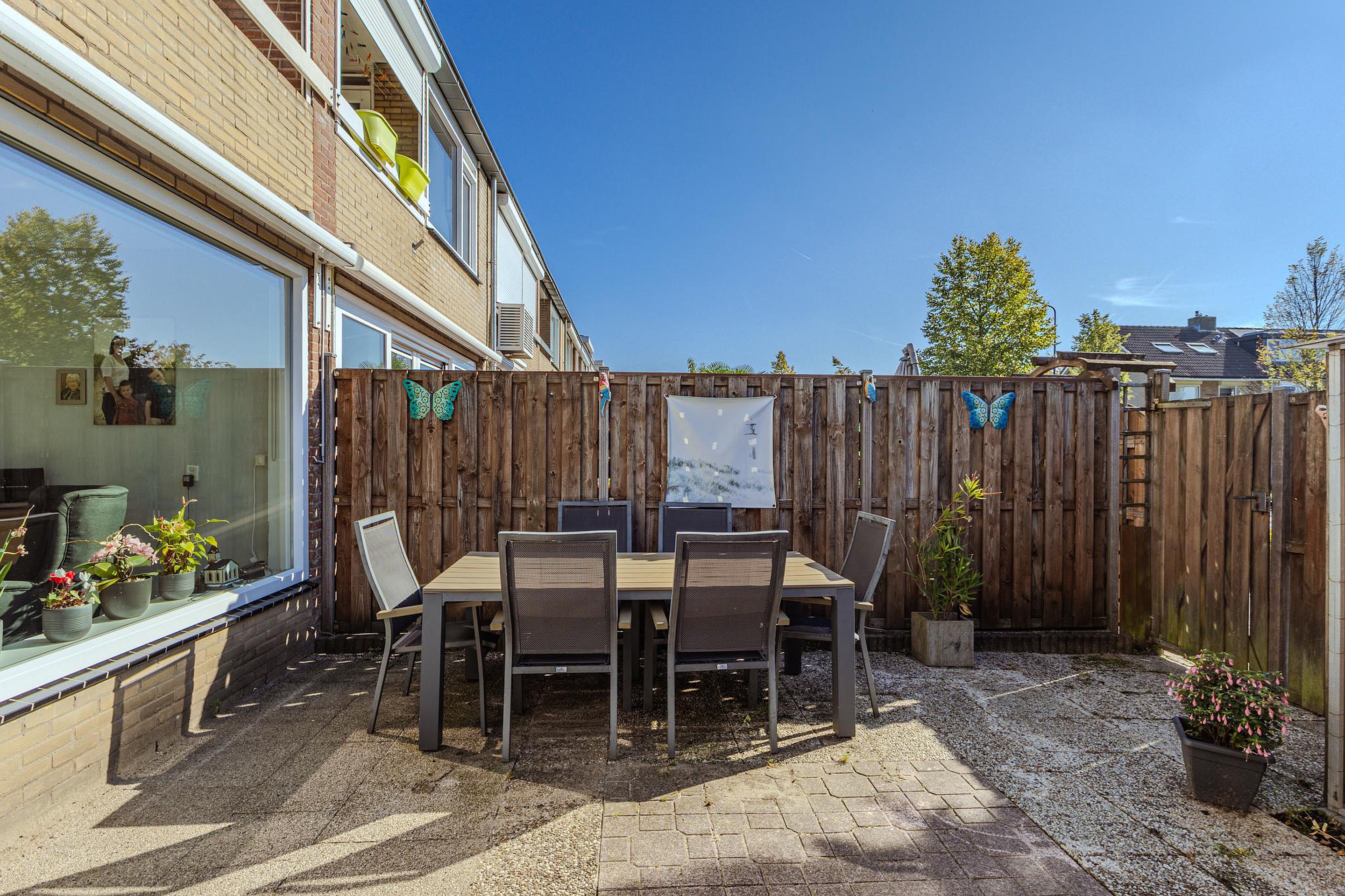 De zonnige achtertuin ligt op het zuiden en is voorzien van een zonnescherm dat aan de gevel is bevestigd. Het geheel is omheind met een schutting en heeft een achterom. Daarnaast is er een kleine overkapping aanwezig, compleet met een plantenborder.