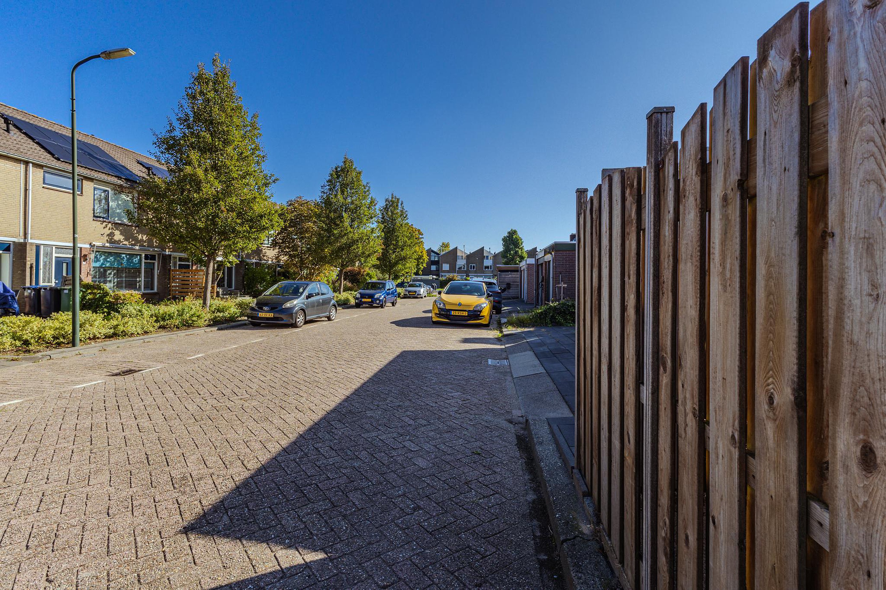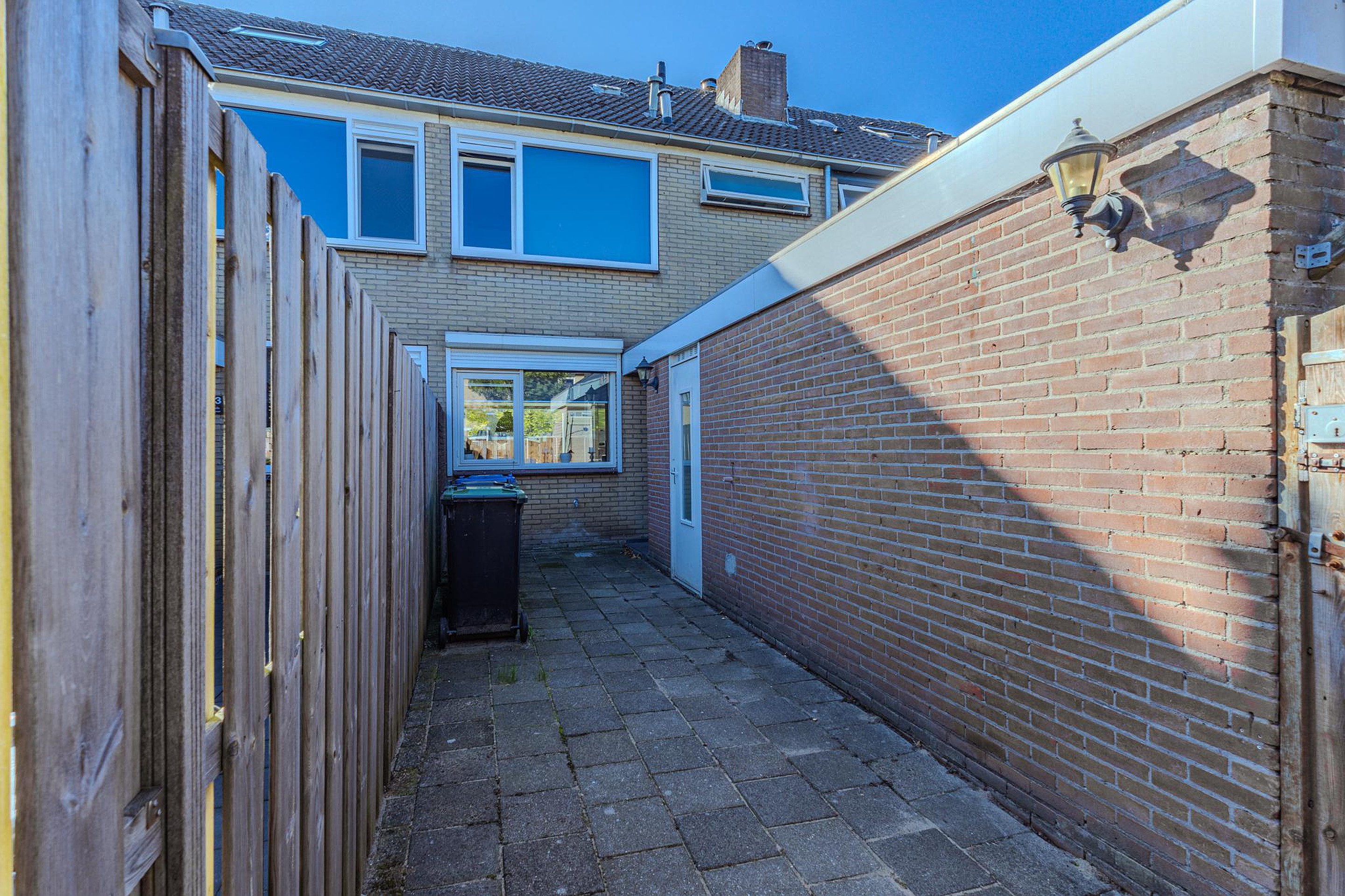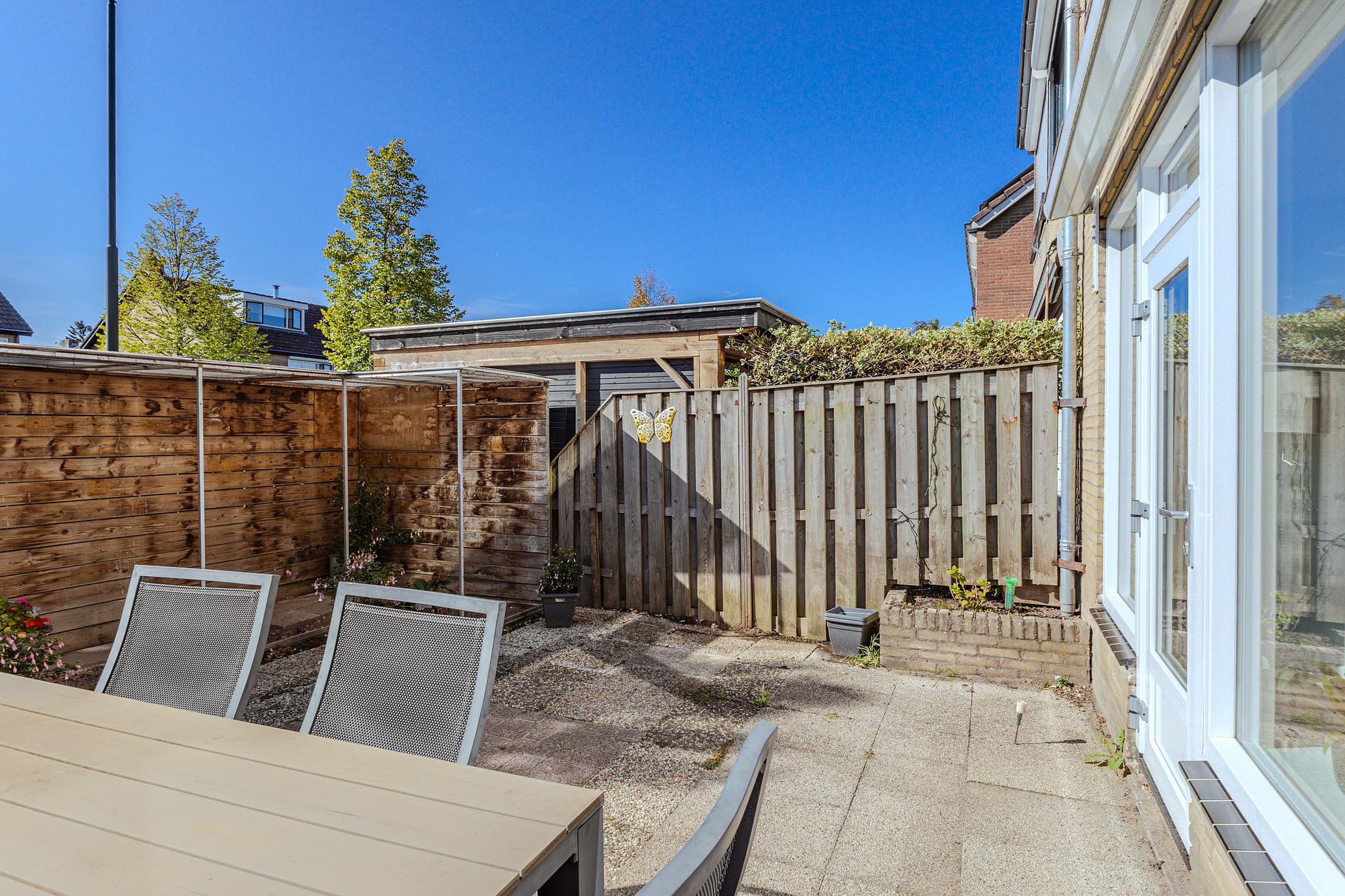 De zonnige achtertuin ligt op het zuiden en is voorzien van een zonnescherm dat aan de gevel is bevestigd. Het geheel is omheind met een schutting en heeft een achterom. Daarnaast is er een kleine overkapping aanwezig, compleet met een plantenborder.