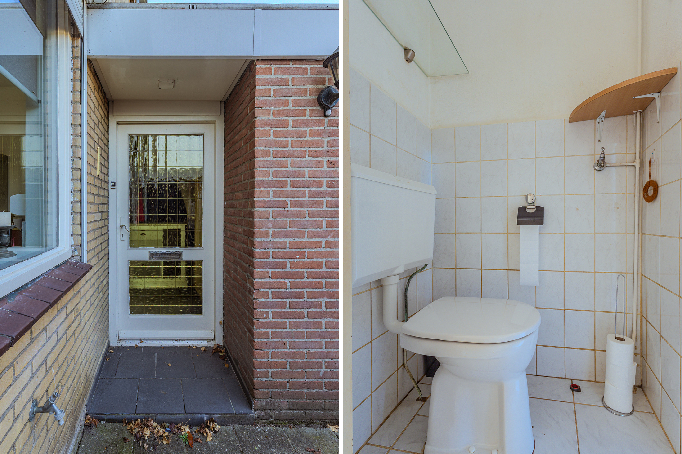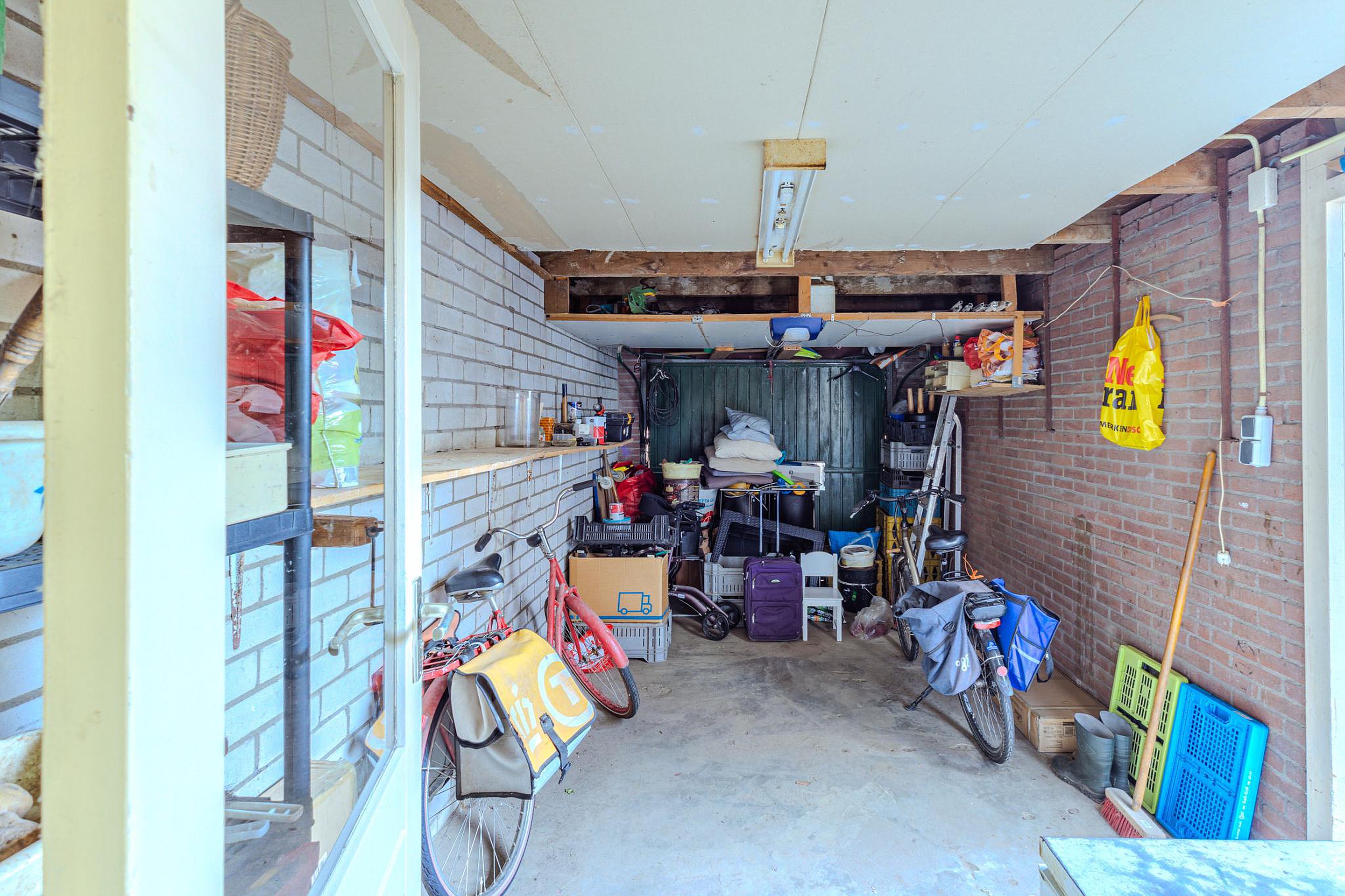 De geheel omheinde en betegelde voortuin biedt toegang tot de berging cq. garage middels een loopdeur en de hal middels de overdekte entree.