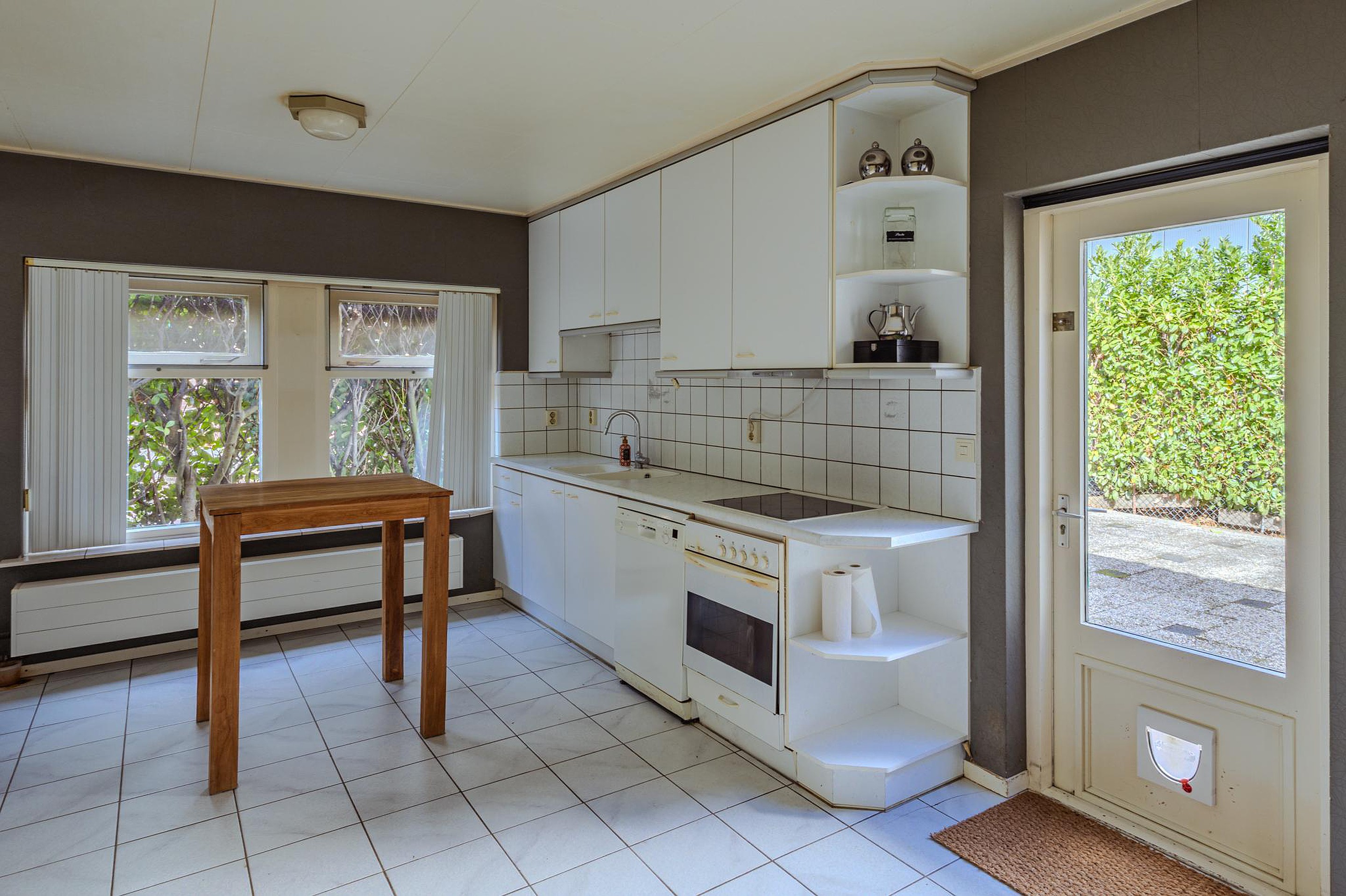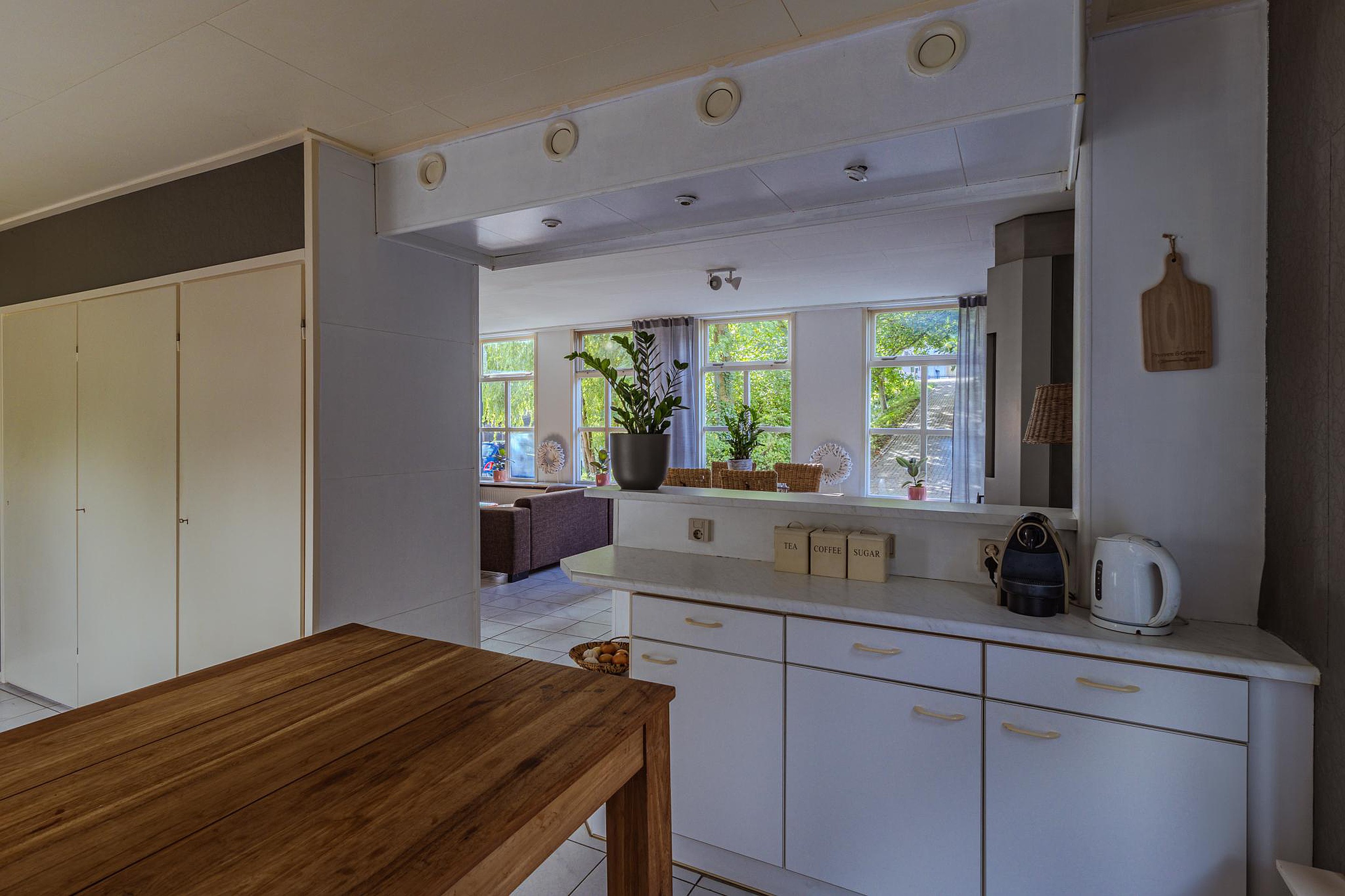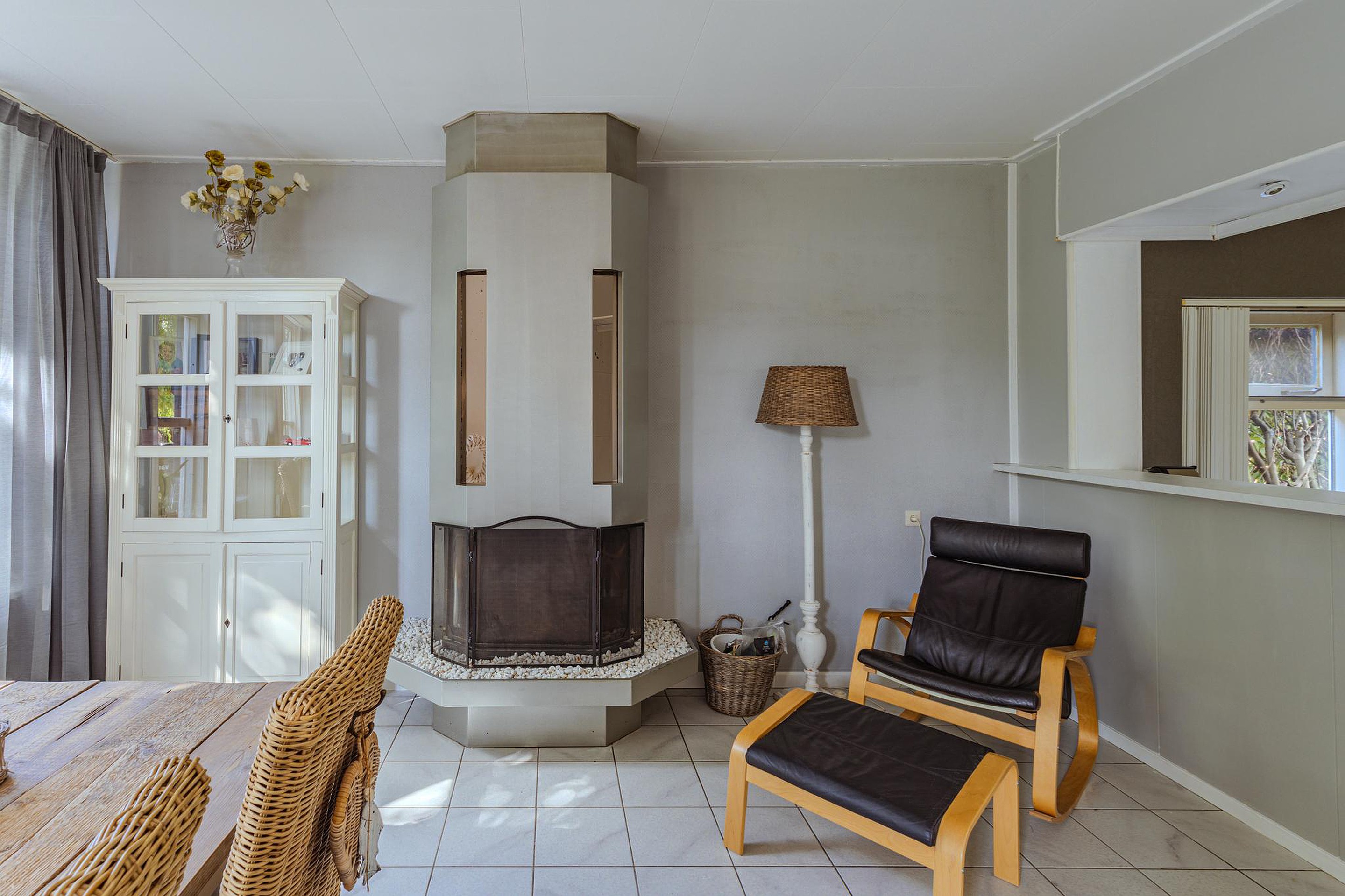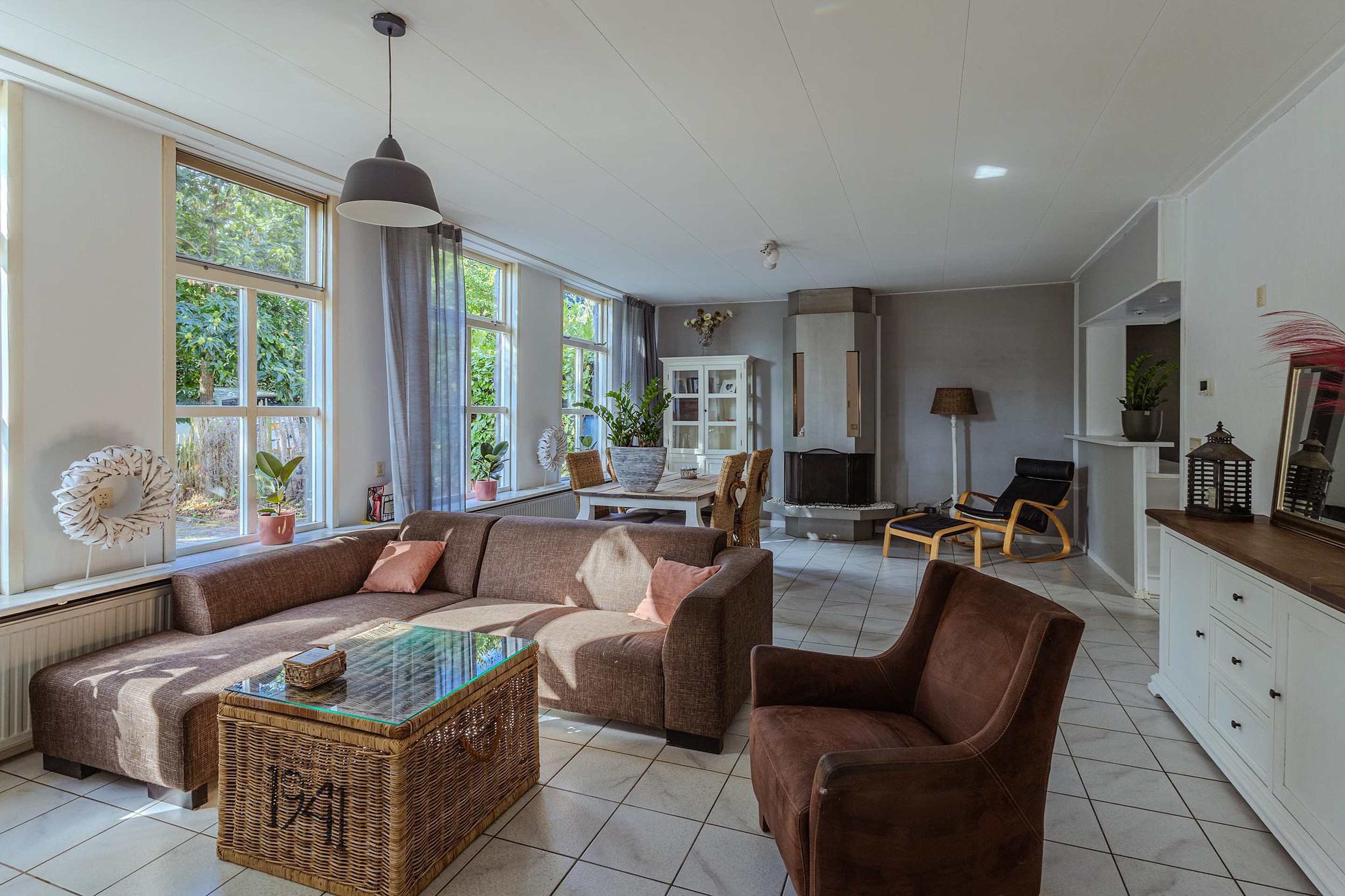 Begane grond De entree vindt plaats in de ruime hal voorzien van meterkast, garderobe, trapkast, trapopgang en de toiletruimte voorzien van een staand toilet en een fonteintje. De gehele begane grond is voorzien van vloerverwarming. De sfeervolle, licht overgoten woonkamer is ingedeeld in een zitgedeelte en een eetgedeelte nabij de halfopen keuken en de open haard/allesbrander. Vanuit de woonkamer is er een directe doorgang naar de keuken, waardoor beide ruimtes mooi met elkaar in verbinding staan. Deze halfopen keuken is voorzien van een dubbele spoelbak, een vaatwasser, diverse bergkasten en vaste kasten. Vanuit de keuken is er directe toegang tot de tuin. De badkamer op de begane grond is uitgerust met een ligbad, een inloopdouche, een wasmeubel en een designradiator. De separate wasruimte biedt plek aan de CV-ketel, de witgoedaansluitingen, de zonneboiler en de verdeler van de vloerverwarming.