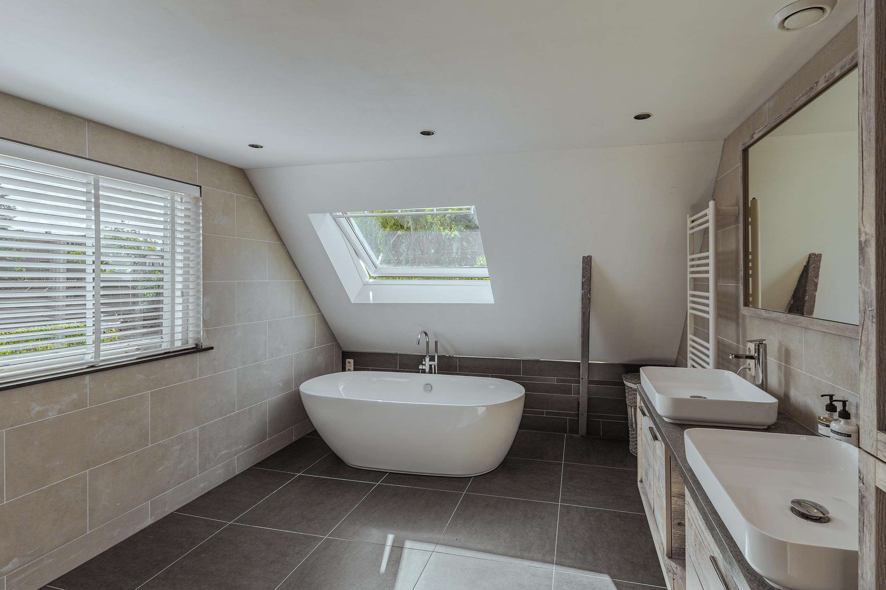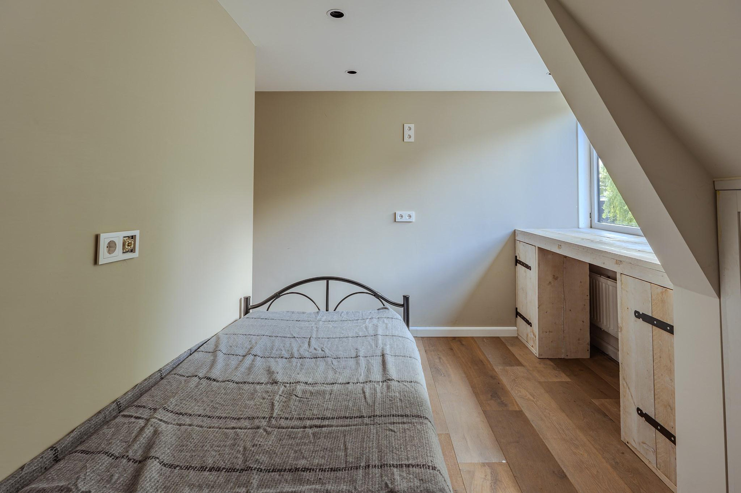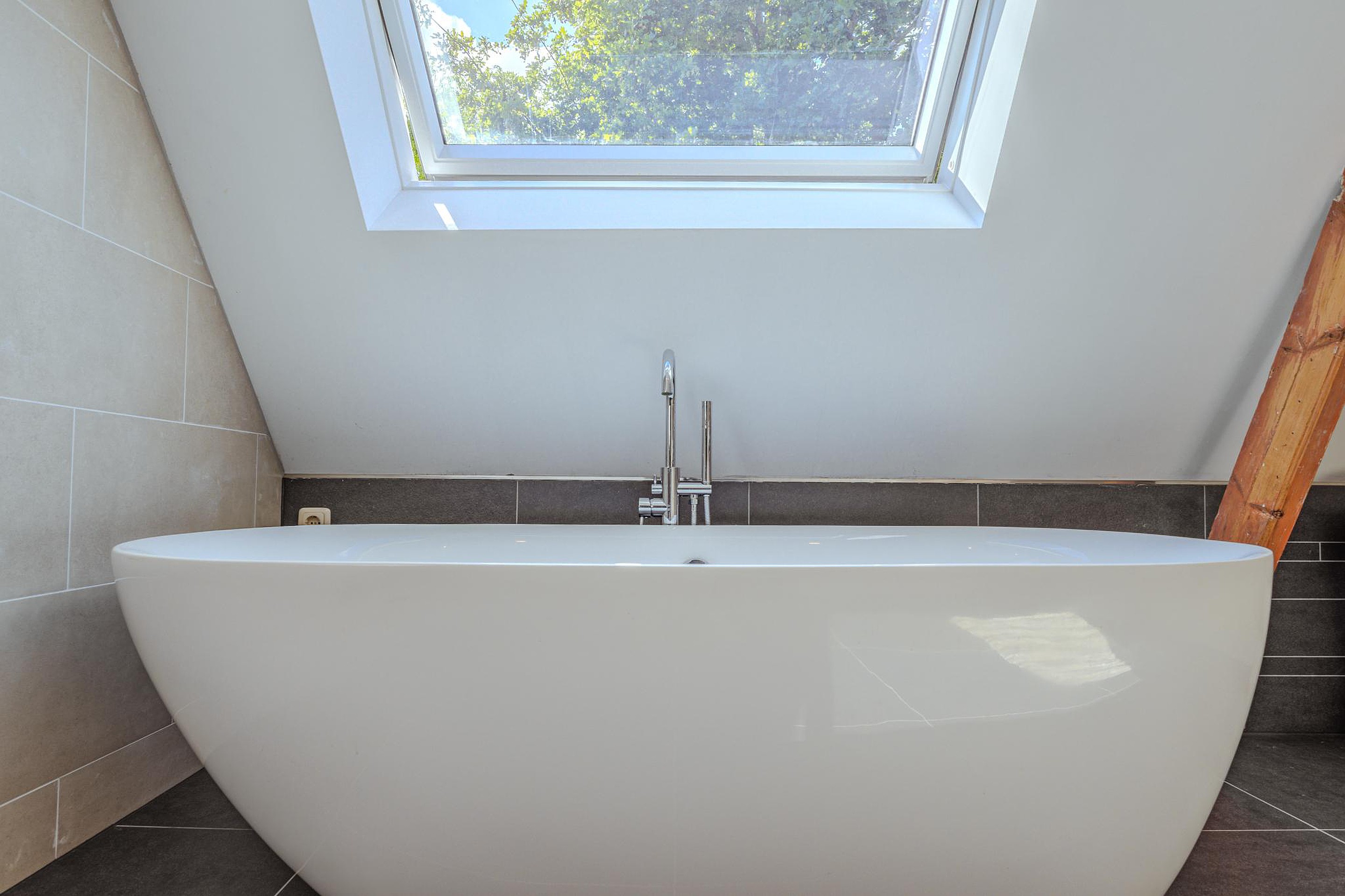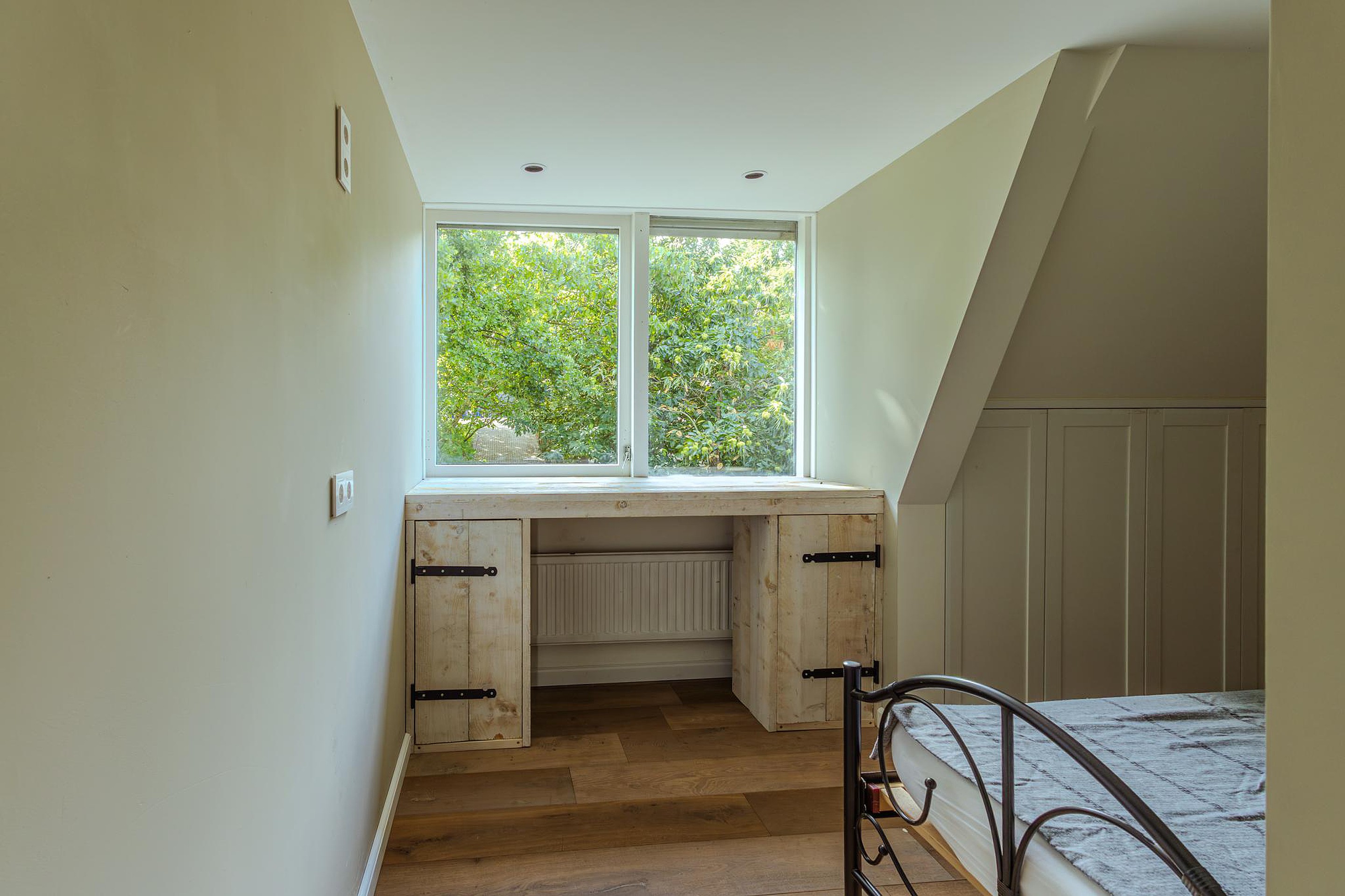 Eerste verdieping Via de trapopgang bereikt u de gerenoveerde etage op de overloop met toegang tot de badkamer en de vier slaapkamers. De in 2020 vernieuwde badkamer is luxe uitgevoerd en voorzien van een vrijstaand ligbad, een royale inloopdouche, een dubbele wastafel met stijlvol meubel en een designradiator. Dankzij het Velux dakraam boven het bad geniet je bovendien van veel daglicht. De hoofdslaapkamer is vergroot door middel van een dakkapel, voorzien van vaste kledingkasten en een praktische inbouwkast achter de akoestische panelen wand. De 2de slaapkamer bevindt zich aan het einde van de gang en is de kleinste van de vier slaapkamers. Derde slaapkamer met dakkapel en toegang tot de bergzolder. Ook de laatste slaapkamer is uitgerust met een dakkapel en beschikt hiernaast over vaste berging en een vast bureau.