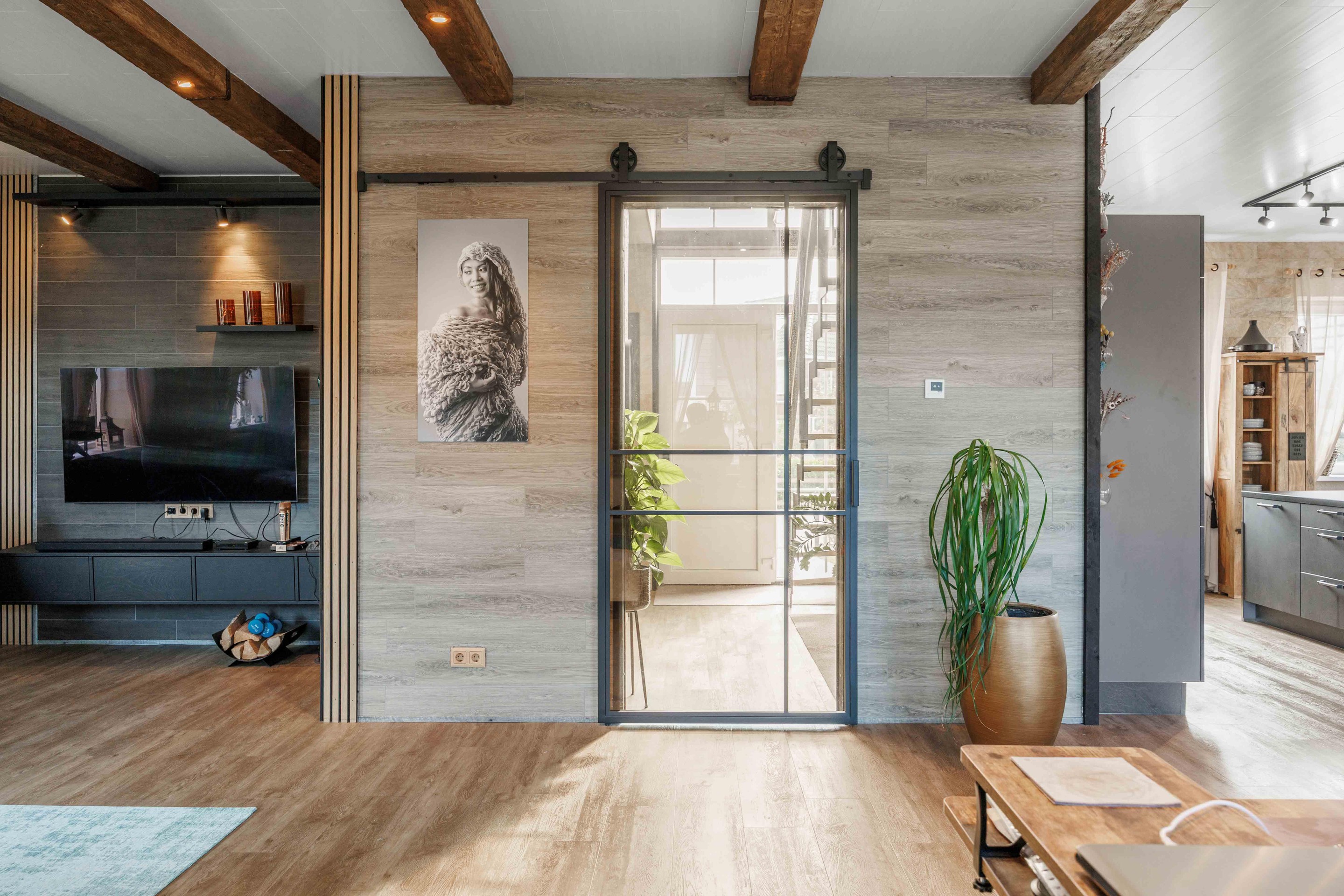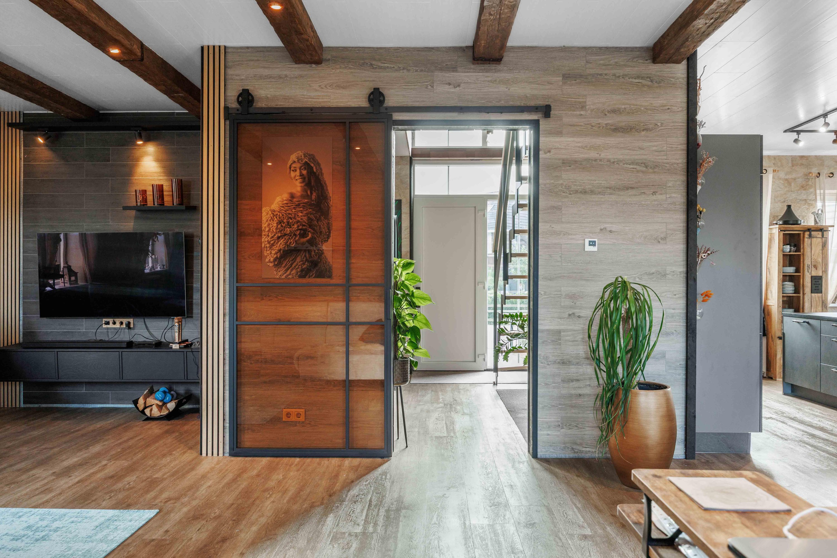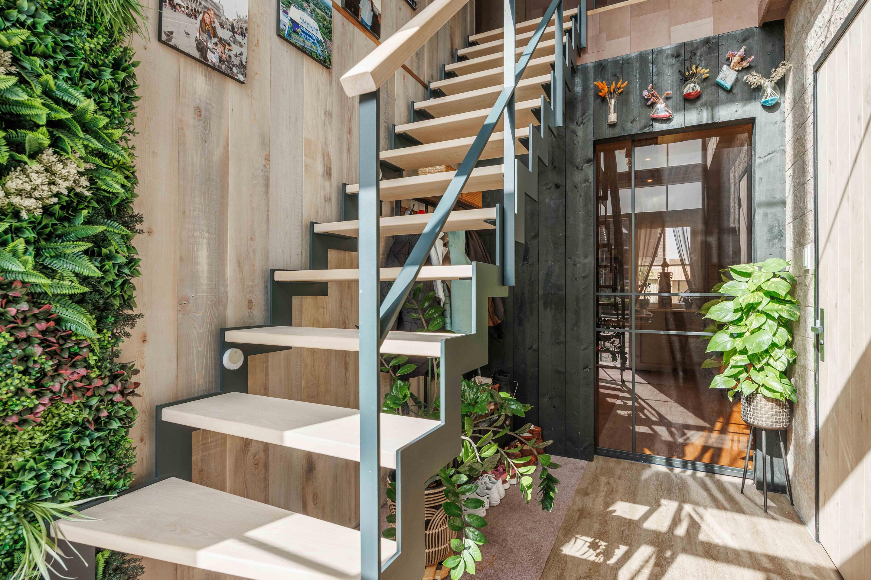 Bij binnenkomst word je direct verrast door de indrukwekkende hal met vide en een royale raampartij die zorgt voor een zee aan licht. De moderne open trap met strak stalen frame en houten treden vormt een echte eyecatcher. Het groenaccent met een prachtige verticale plantenwand geeft de hal een levendige en natuurlijke uitstraling. De houten wandafwerking, persoonlijke fotogalerij en stijlvolle verlichting maken dit tot een warme en unieke entree. Hier voel je meteen dat je een bijzonder huis binnenstapt! In de hal bevinden zich een toilet, meterkast en garderobe. Rechts aan de zijkant bevindt zich een praktische bijkeuken, ideaal voor extra opslag en plek voor de witgoedopstelling. Vanuit de hal geeft de eigentijdse stalen deur toegang tot de woonkamer. Hoewel de ruimtes hier naadloos in elkaar overlopen, heeft elk deel van de leefruimte een eigen karakter.