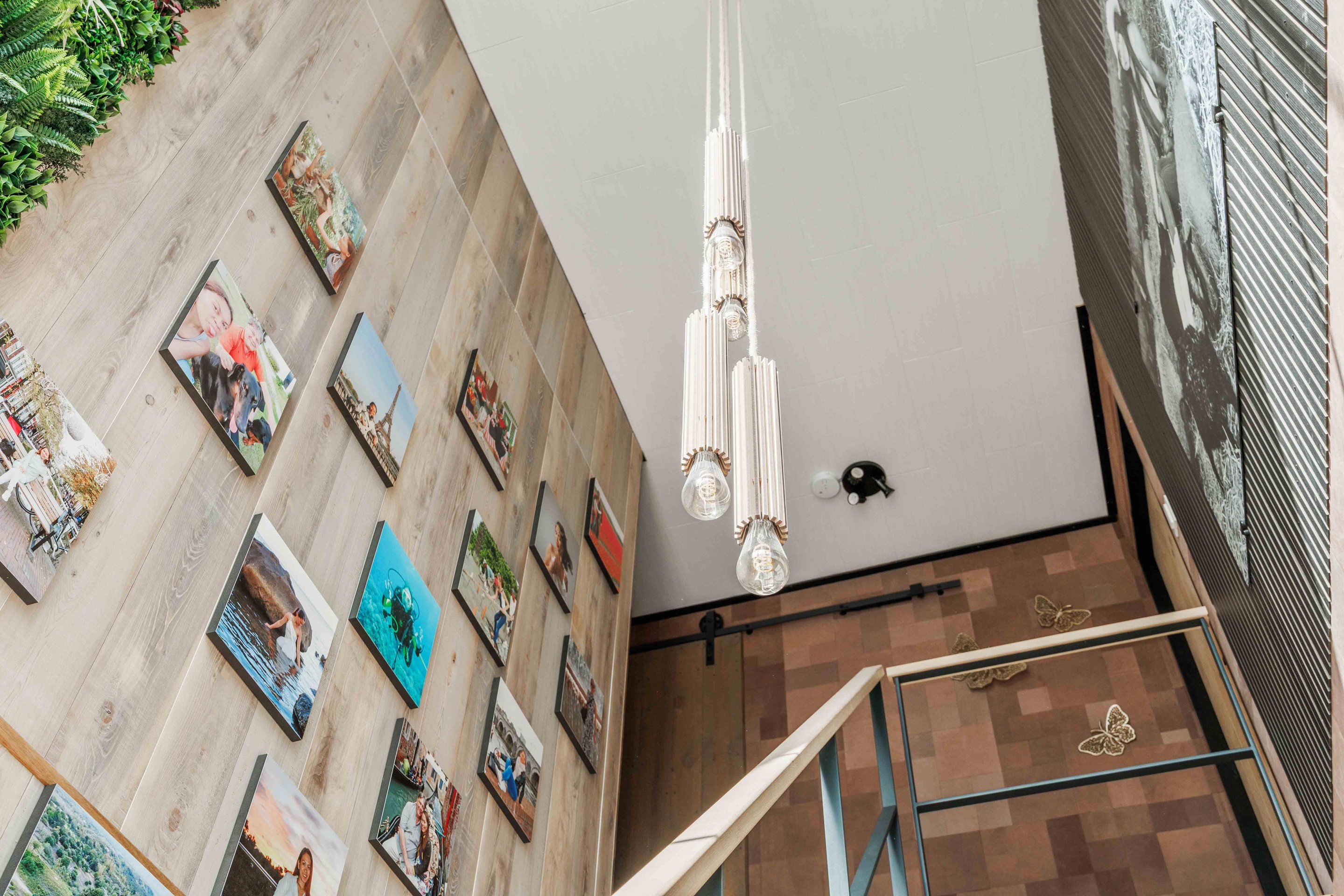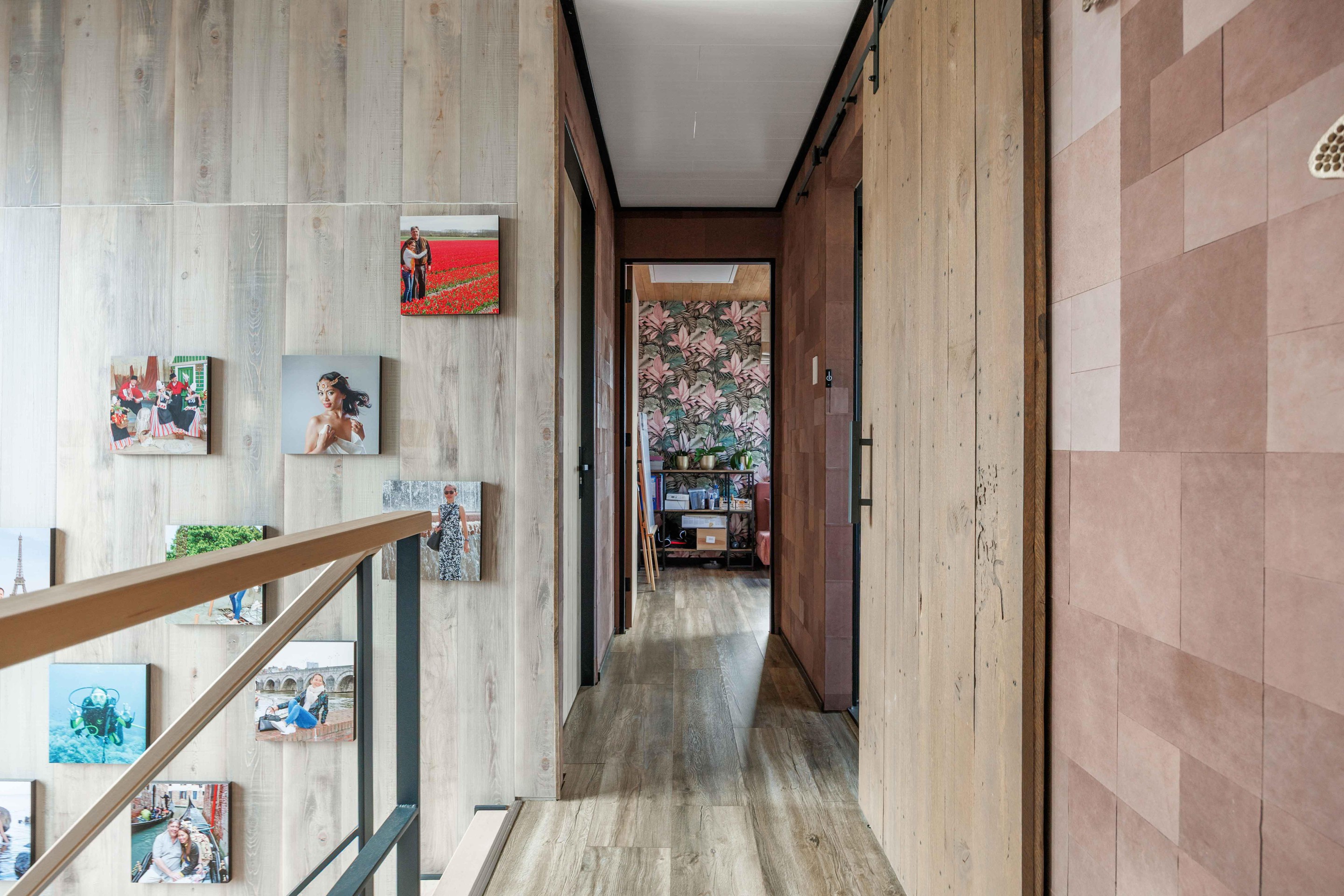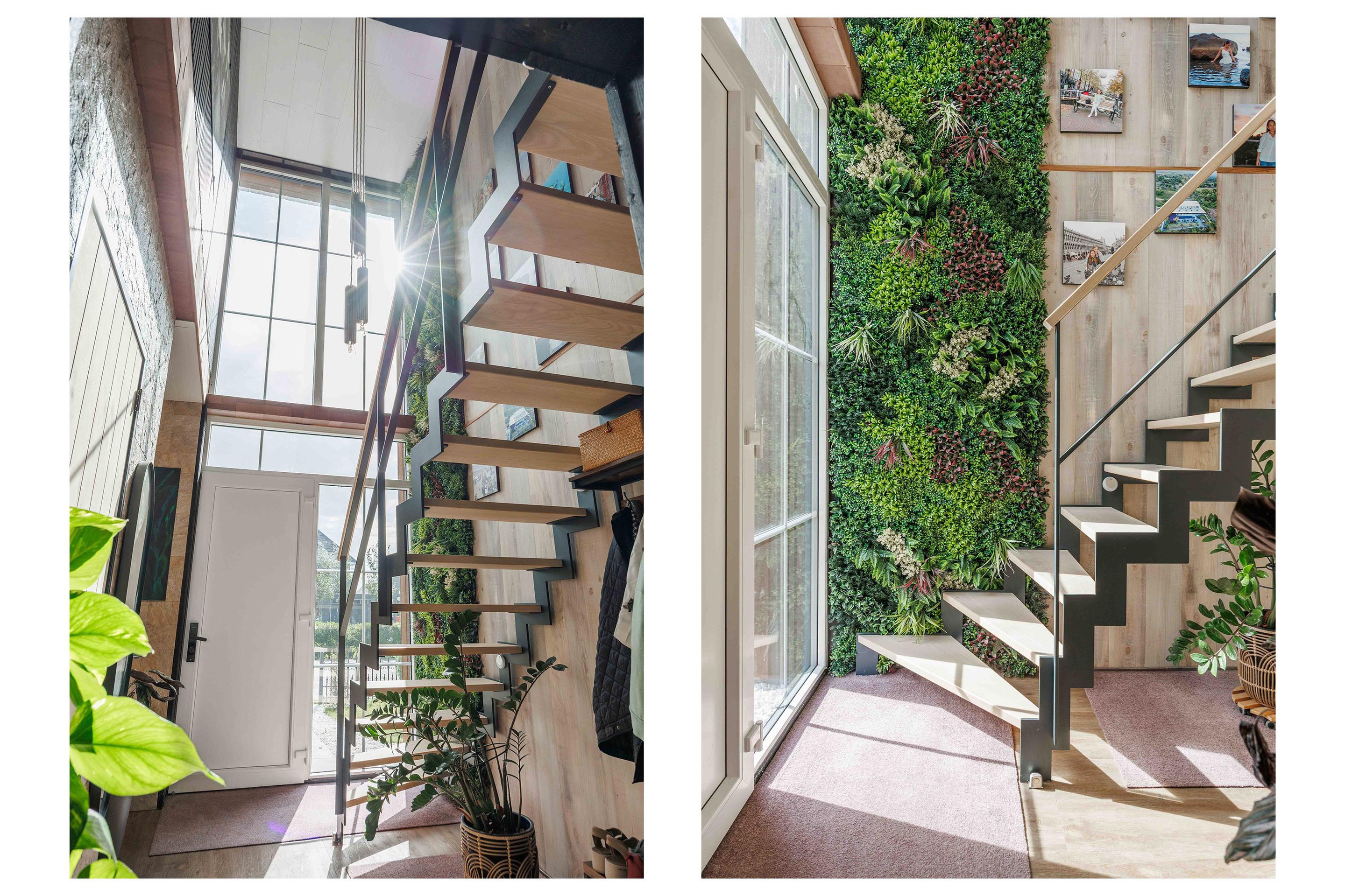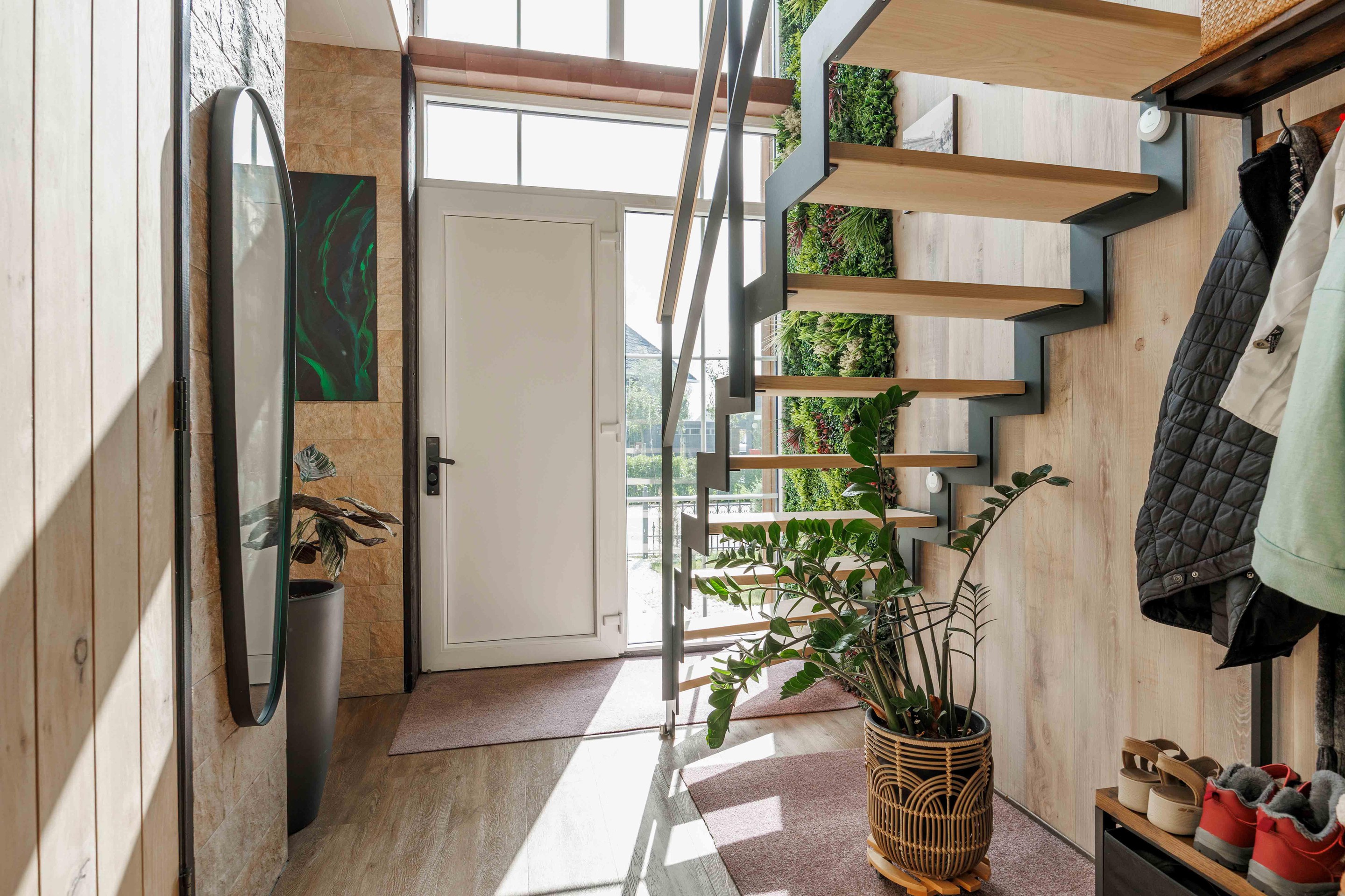 Bij binnenkomst word je direct verrast door de indrukwekkende hal met vide en een royale raampartij die zorgt voor een zee aan licht. De moderne open trap met strak stalen frame en houten treden vormt een echte eyecatcher. Het groenaccent met een prachtige verticale plantenwand geeft de hal een levendige en natuurlijke uitstraling. De houten wandafwerking, persoonlijke fotogalerij en stijlvolle verlichting maken dit tot een warme en unieke entree. Hier voel je meteen dat je een bijzonder huis binnenstapt! In de hal bevinden zich een toilet, meterkast en garderobe. Rechts aan de zijkant bevindt zich een praktische bijkeuken, ideaal voor extra opslag en plek voor de witgoedopstelling. Vanuit de hal geeft de eigentijdse stalen deur toegang tot de woonkamer. Hoewel de ruimtes hier naadloos in elkaar overlopen, heeft elk deel van de leefruimte een eigen karakter.