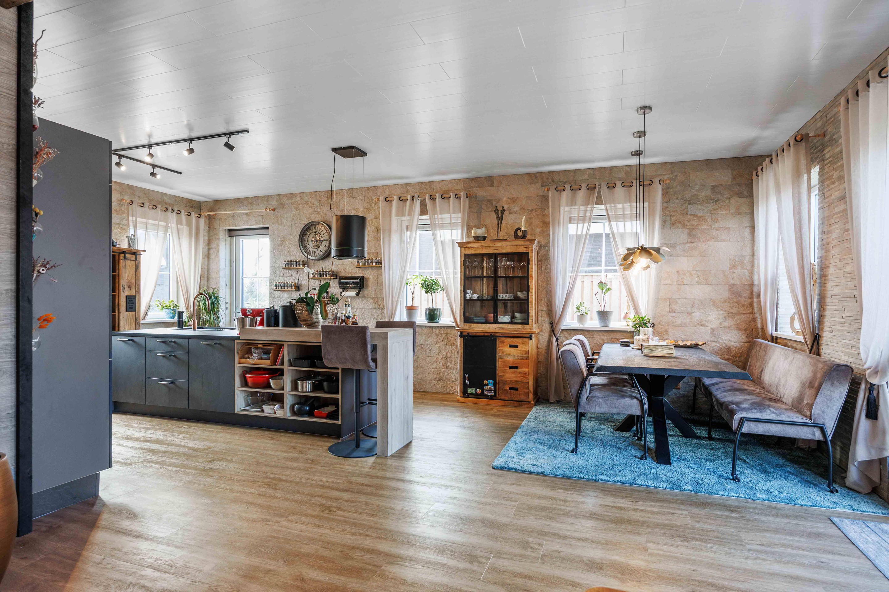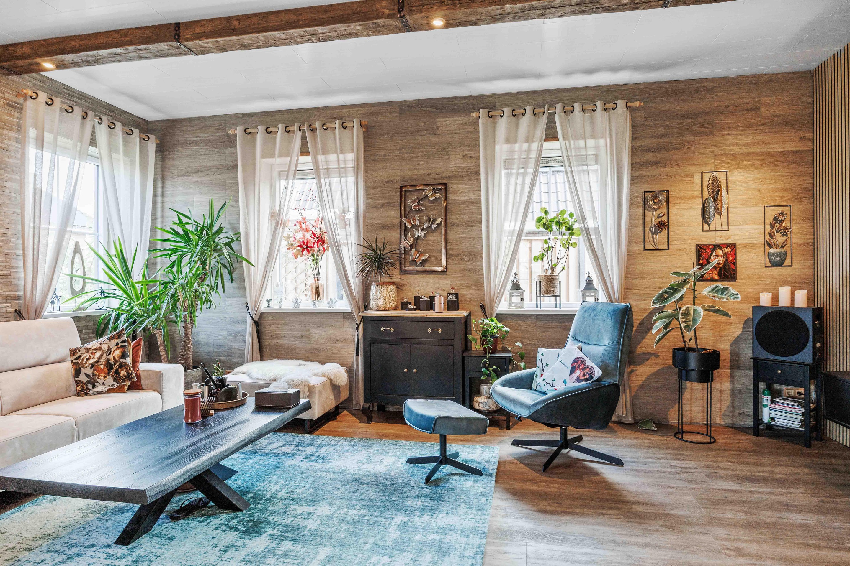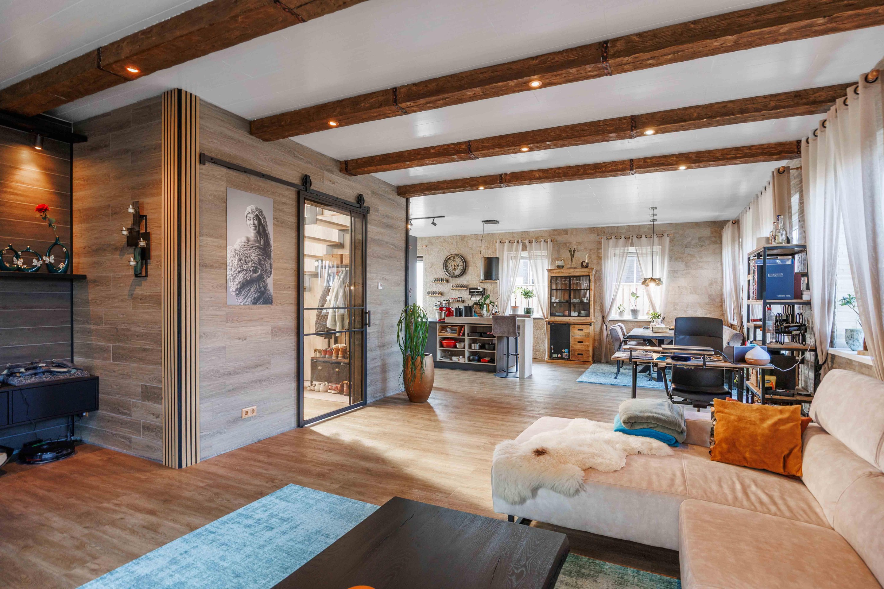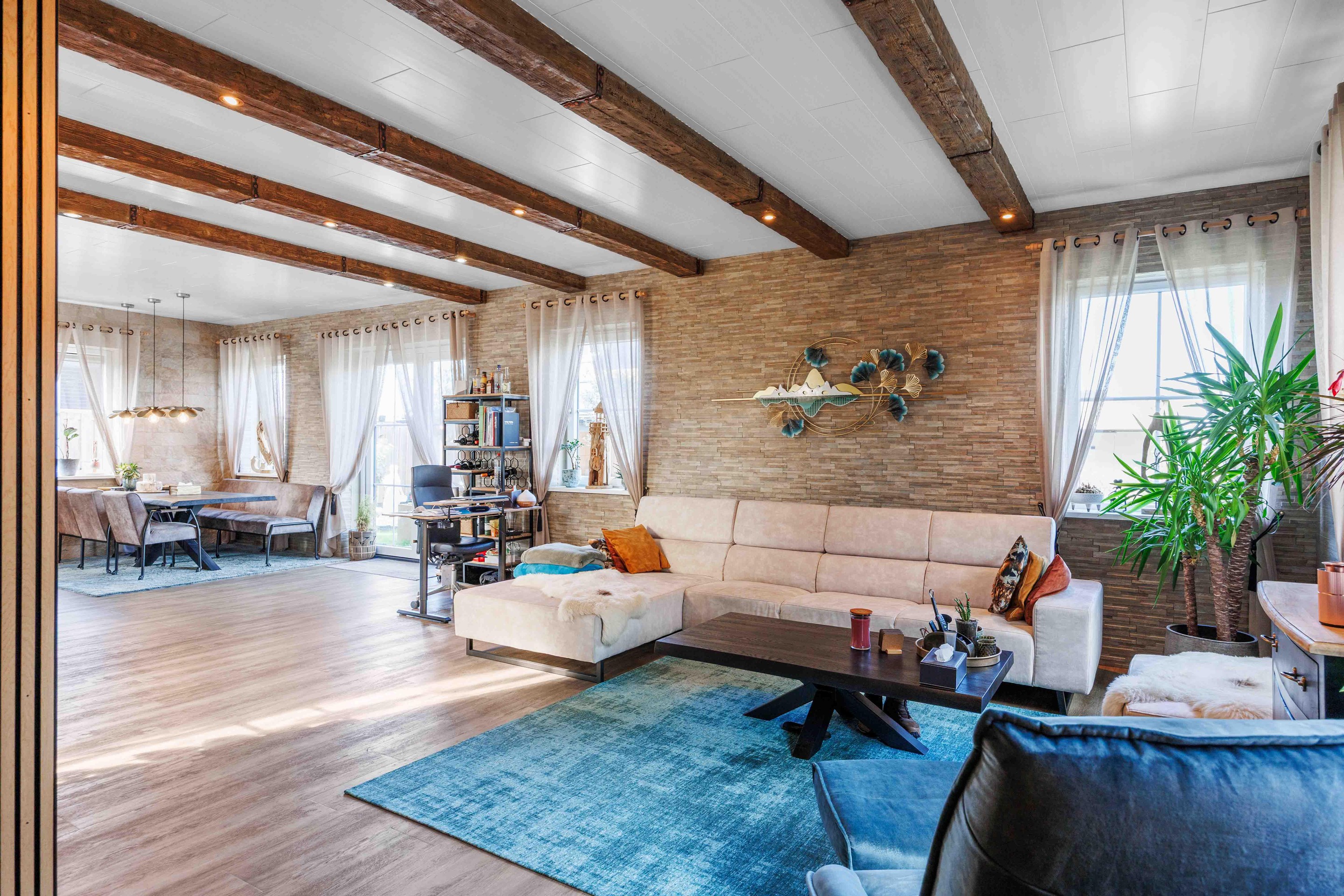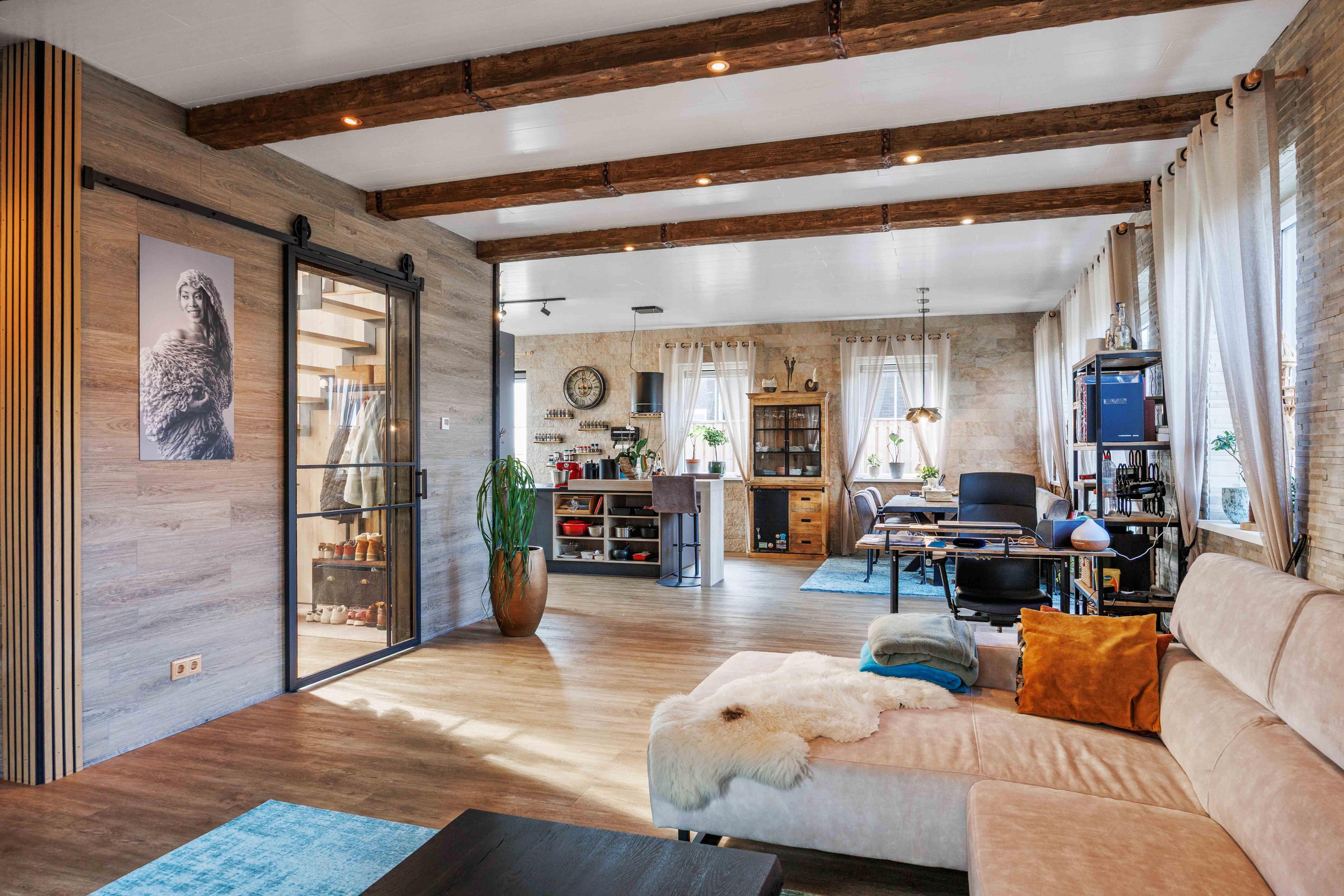 De indrukwekkende living straalt warmte en karakter uit dankzij een robuuste houten balkenplafond met stijlvolle inbouwspots die voor een prettige verlichting zorgen. Het plafond is strak en licht afgewerkt, waardoor de ruimte een mooie balans heeft tussen modern en rustiek. De wanden zijn deels voorzien van een natuursteenlook en PVC bekleding, wat een speelse en natuurlijke uitstraling geeft. Met de ruime indeling is er volop plek voor een knusse zithoek of een plek om te lezen of tv te kijken.