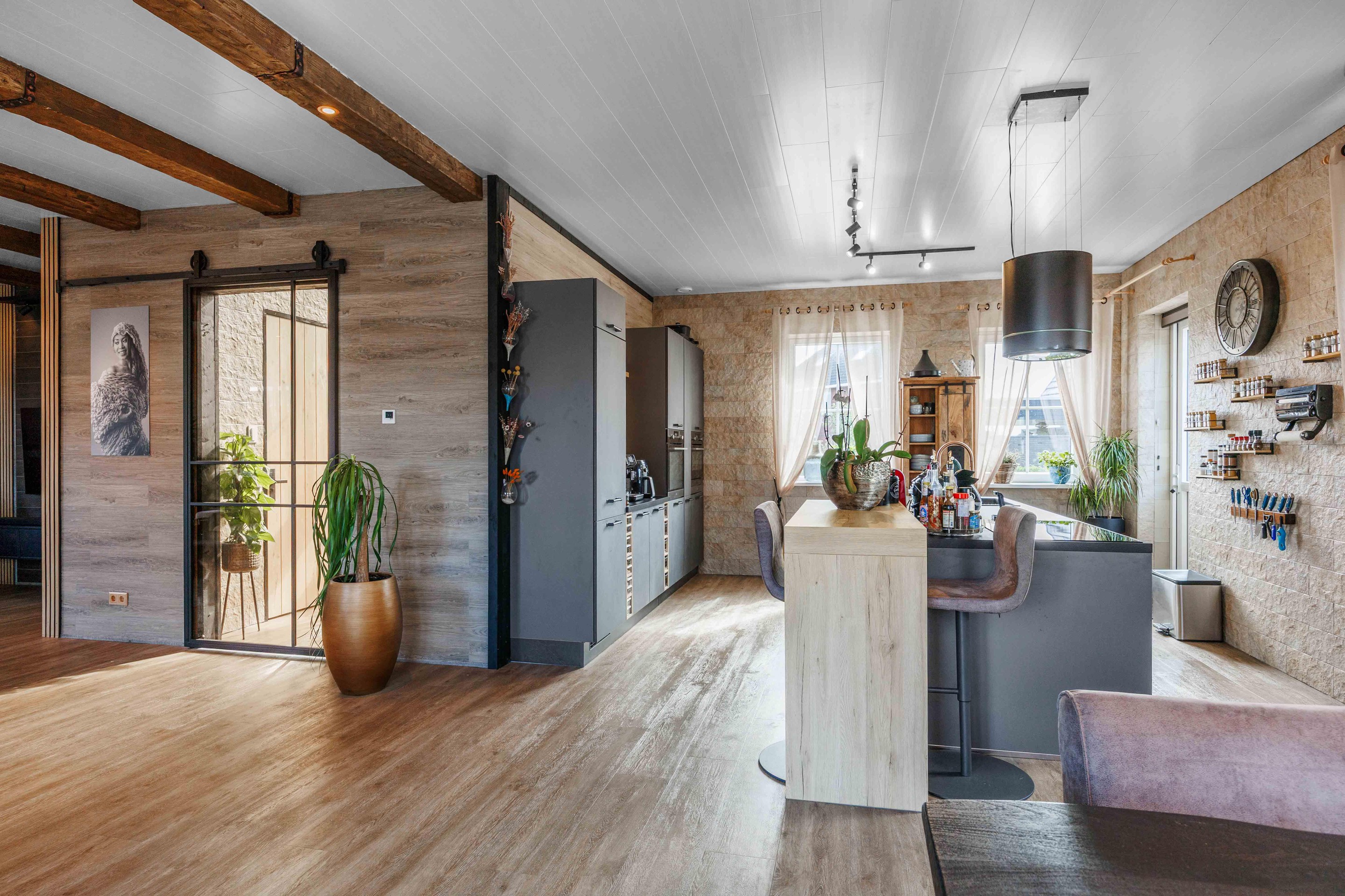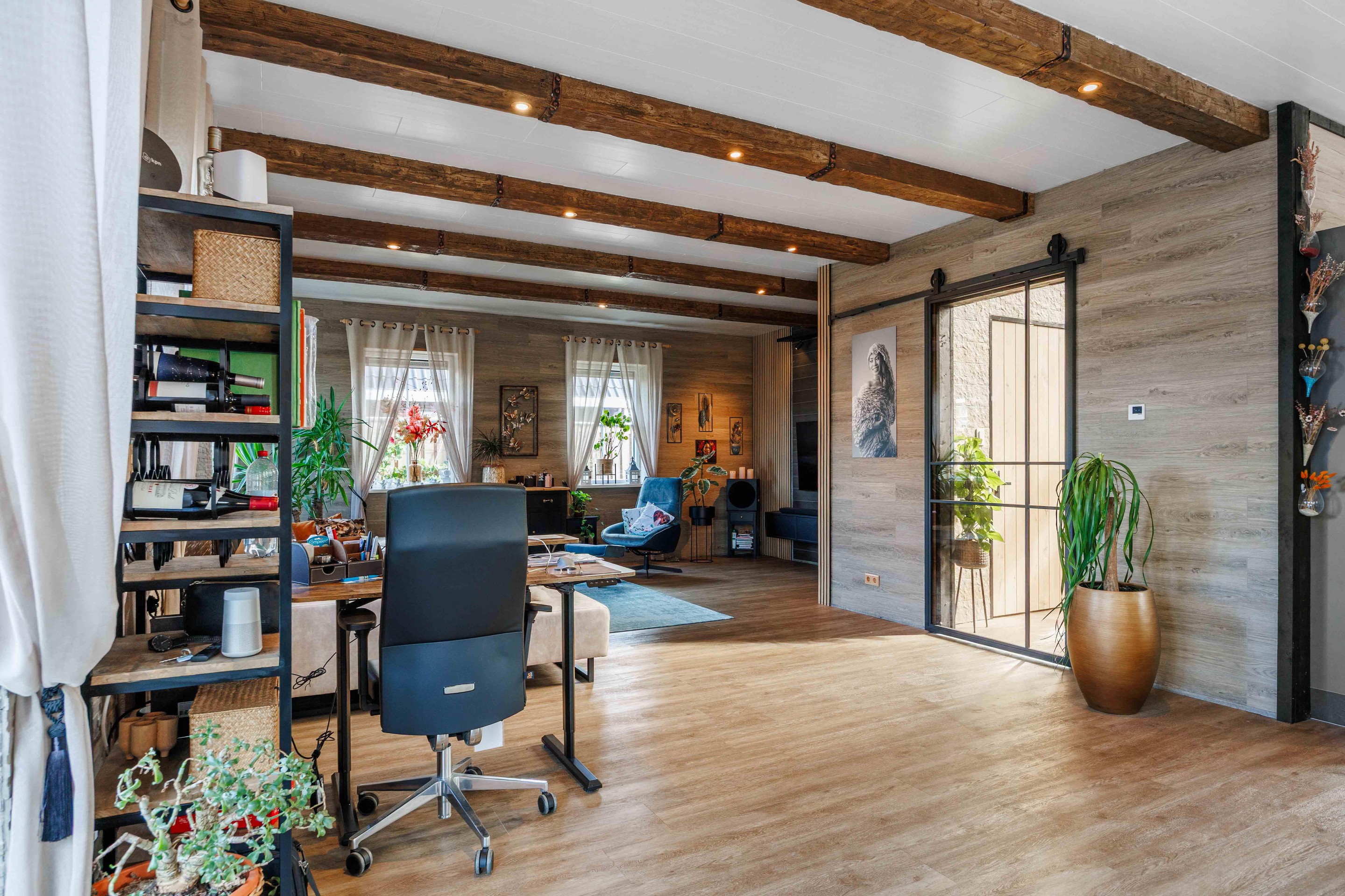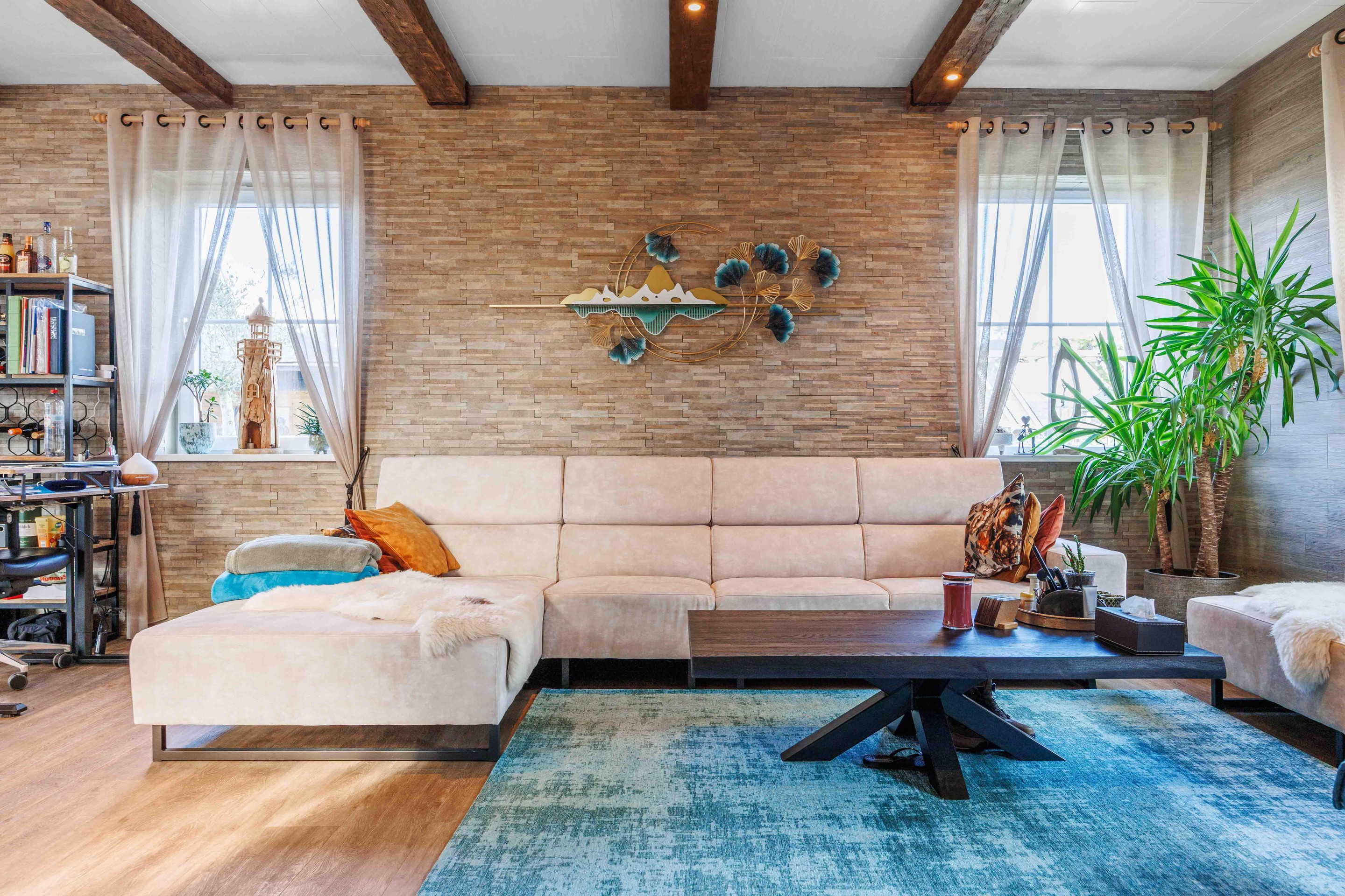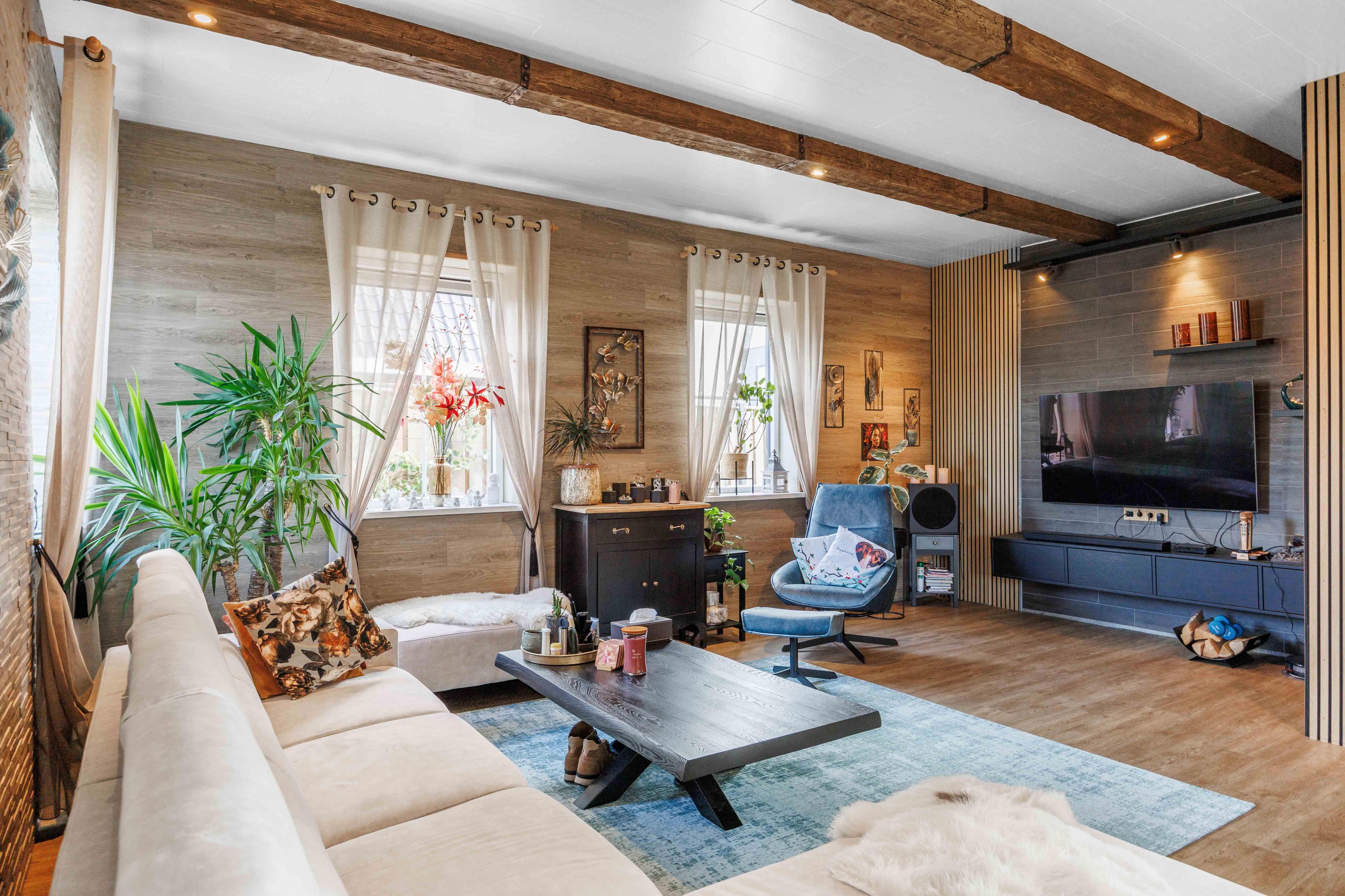 De indrukwekkende living straalt warmte en karakter uit dankzij een robuuste houten balkenplafond met stijlvolle inbouwspots die voor een prettige verlichting zorgen. Het plafond is strak en licht afgewerkt, waardoor de ruimte een mooie balans heeft tussen modern en rustiek. De wanden zijn deels voorzien van een natuursteenlook en PVC bekleding, wat een speelse en natuurlijke uitstraling geeft. Met de ruime indeling is er volop plek voor een knusse zithoek of een plek om te lezen of tv te kijken.