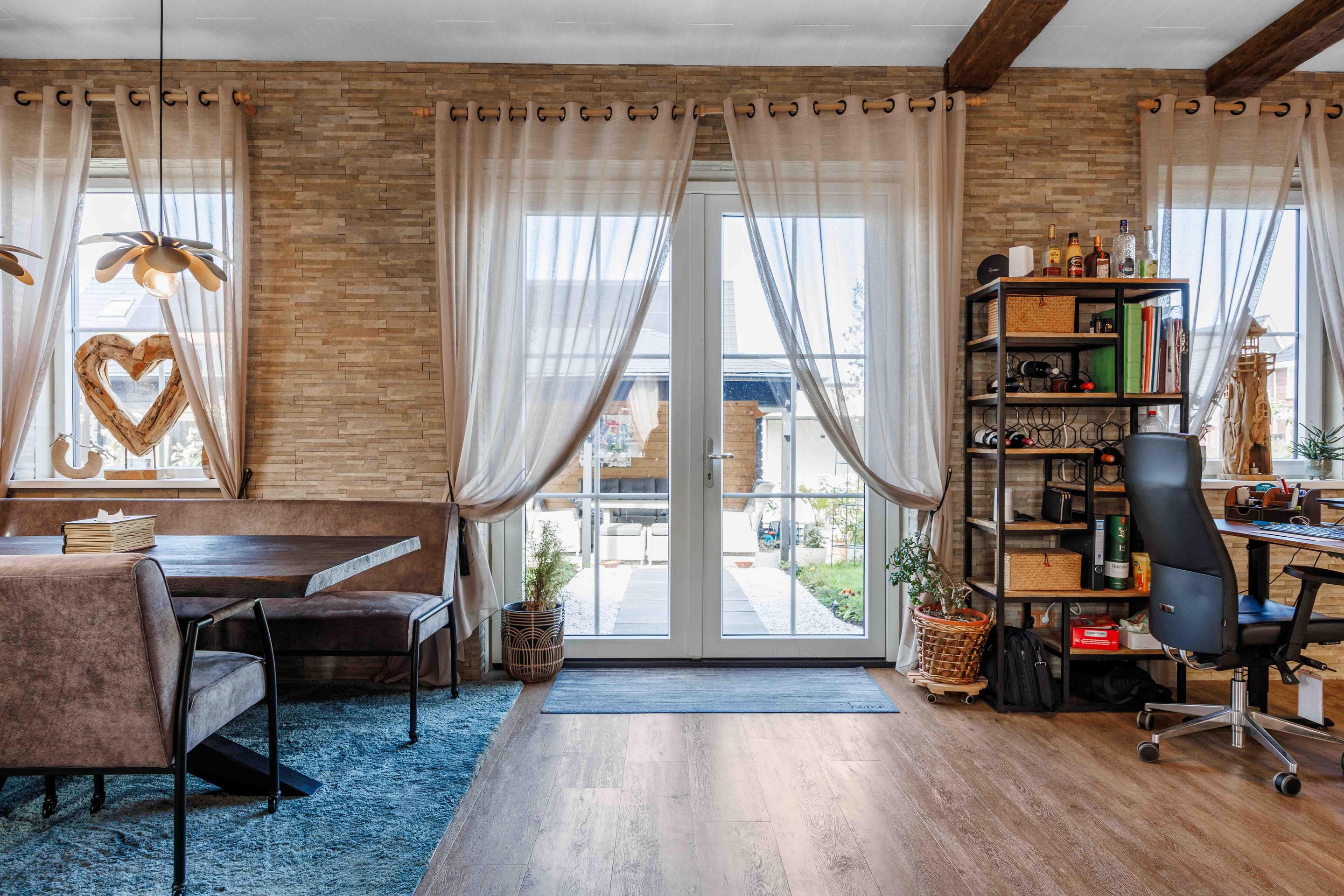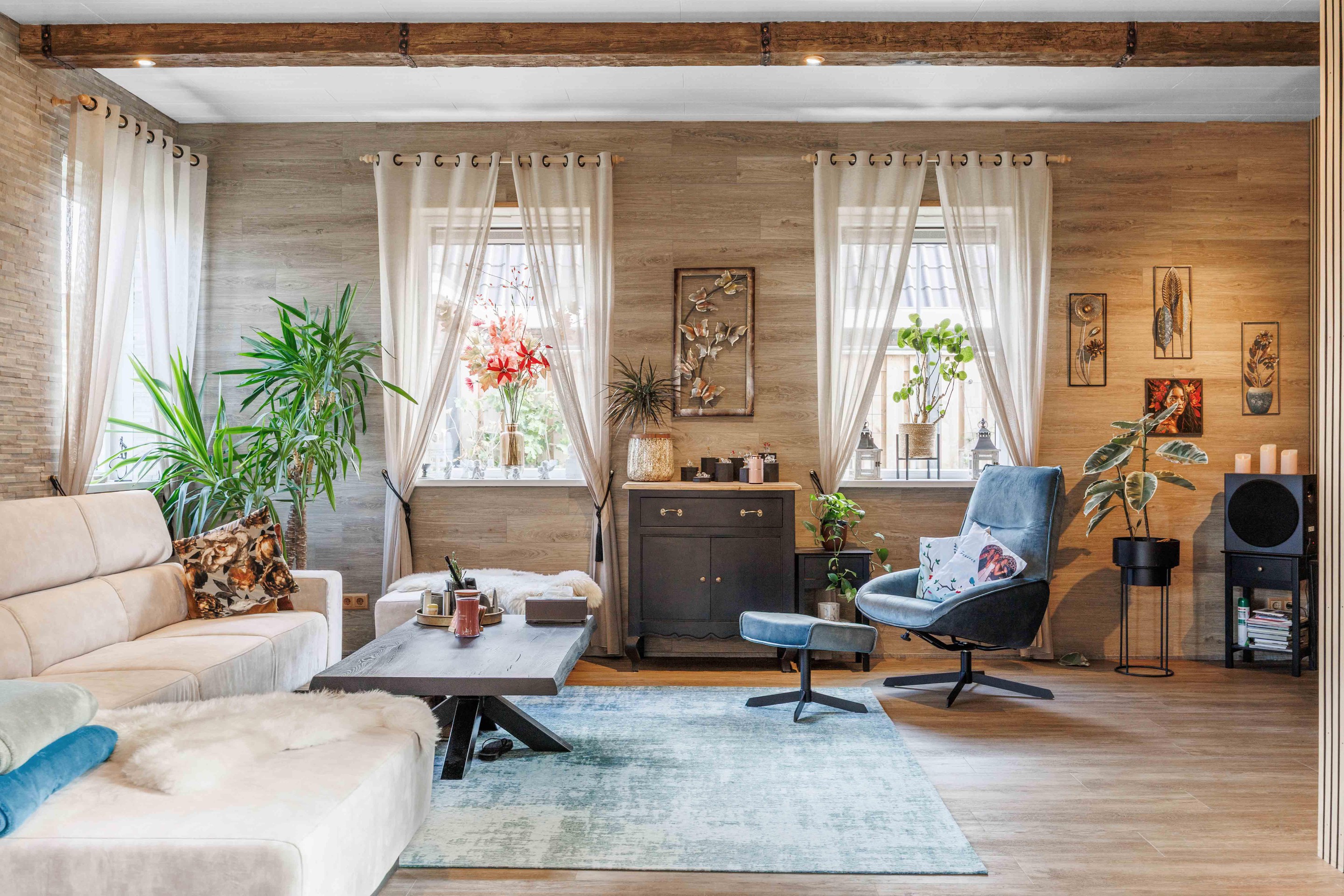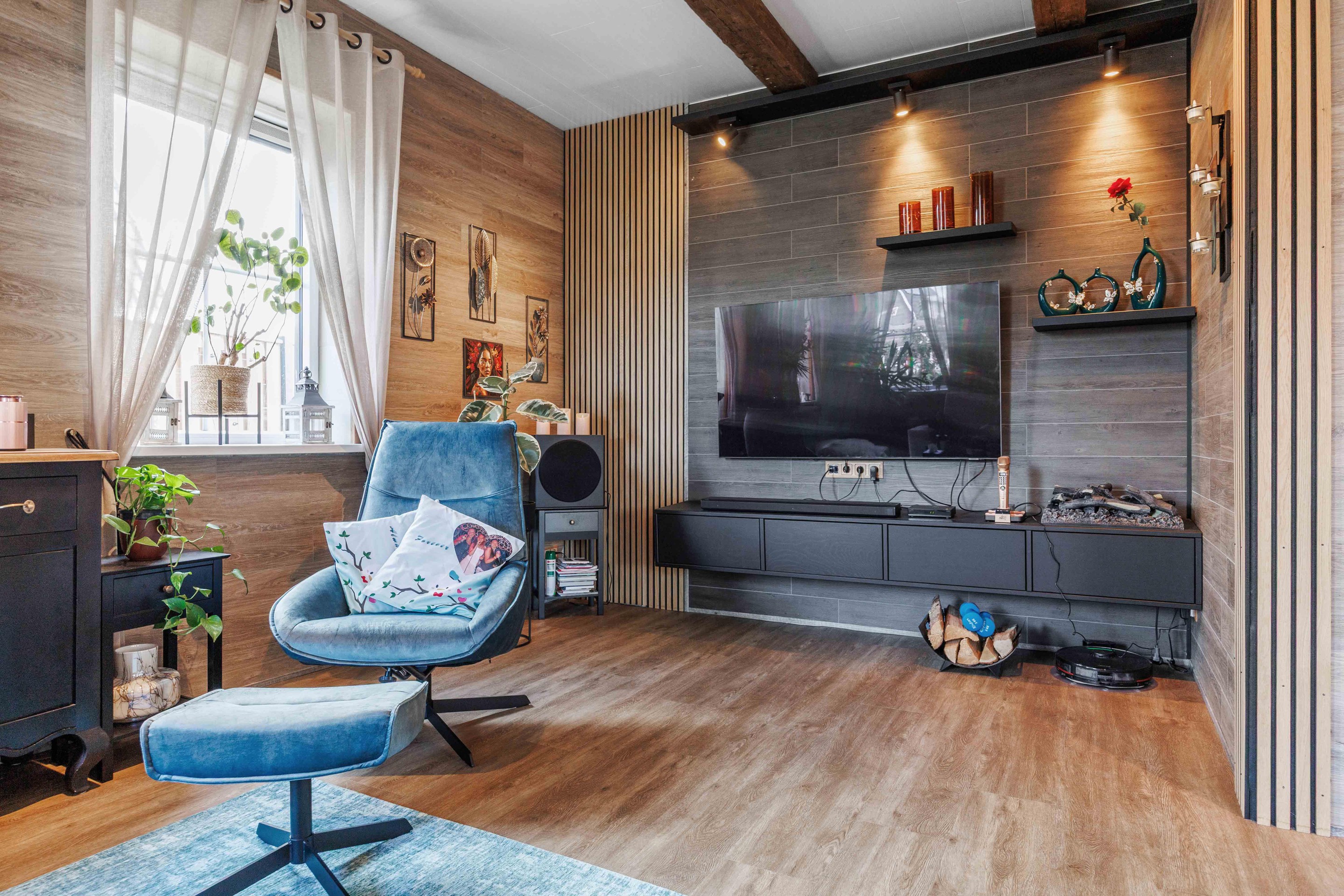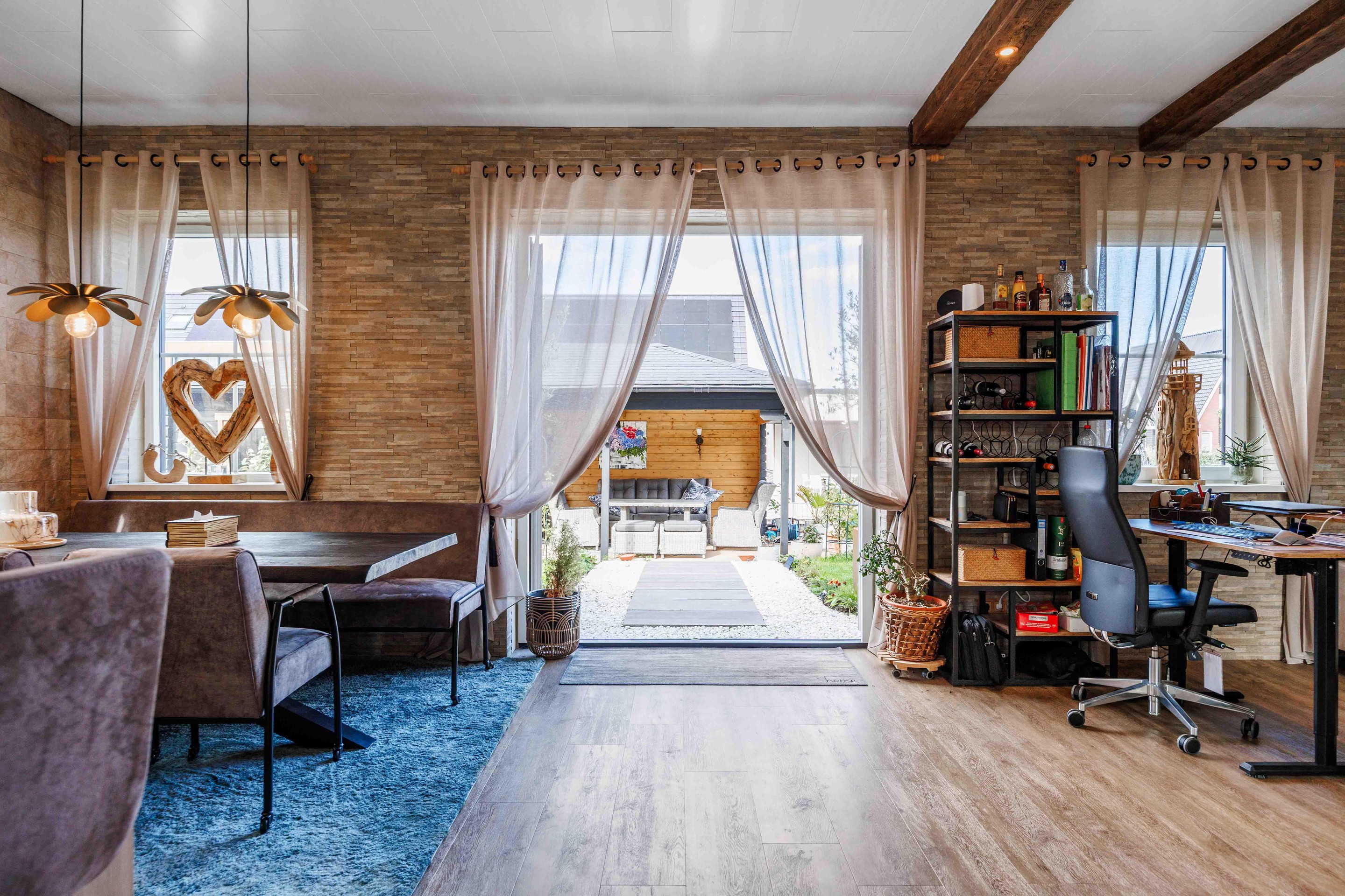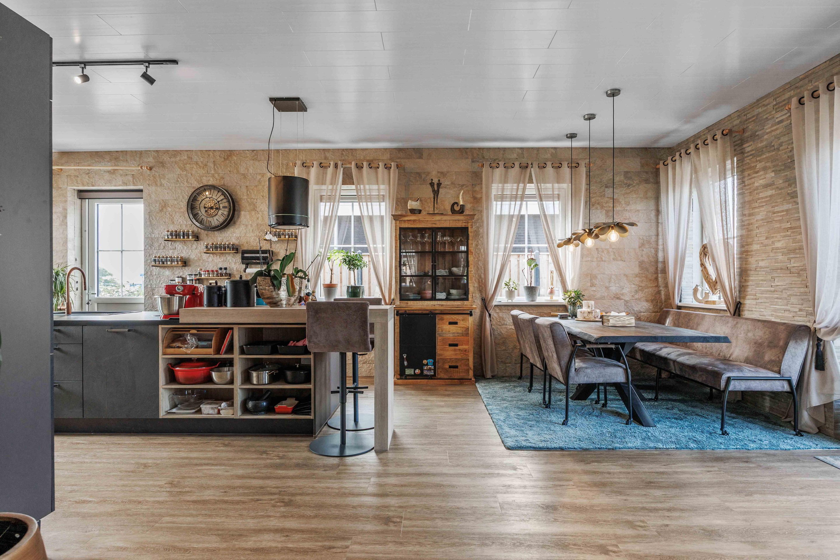 De indrukwekkende living straalt warmte en karakter uit dankzij een robuuste houten balkenplafond met stijlvolle inbouwspots die voor een prettige verlichting zorgen. Het plafond is strak en licht afgewerkt, waardoor de ruimte een mooie balans heeft tussen modern en rustiek. De wanden zijn deels voorzien van een natuursteenlook en PVC bekleding, wat een speelse en natuurlijke uitstraling geeft. Met de ruime indeling is er volop plek voor een knusse zithoek of een plek om te lezen of tv te kijken.