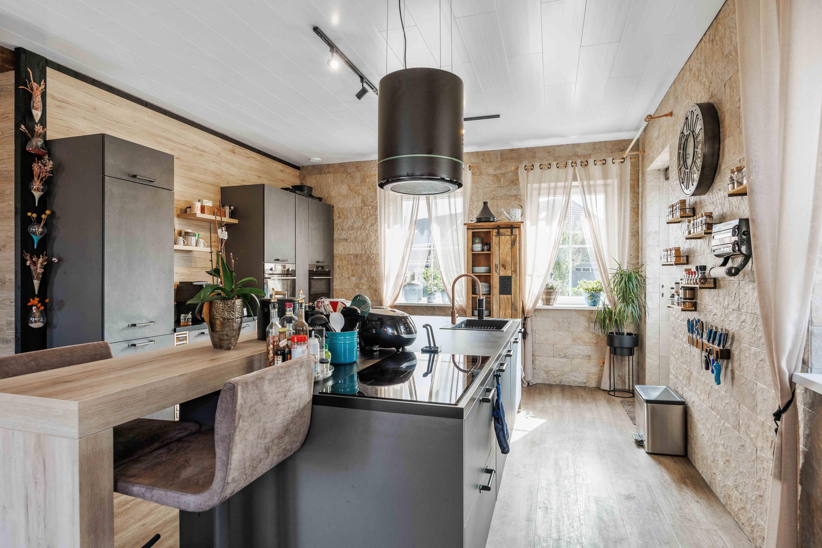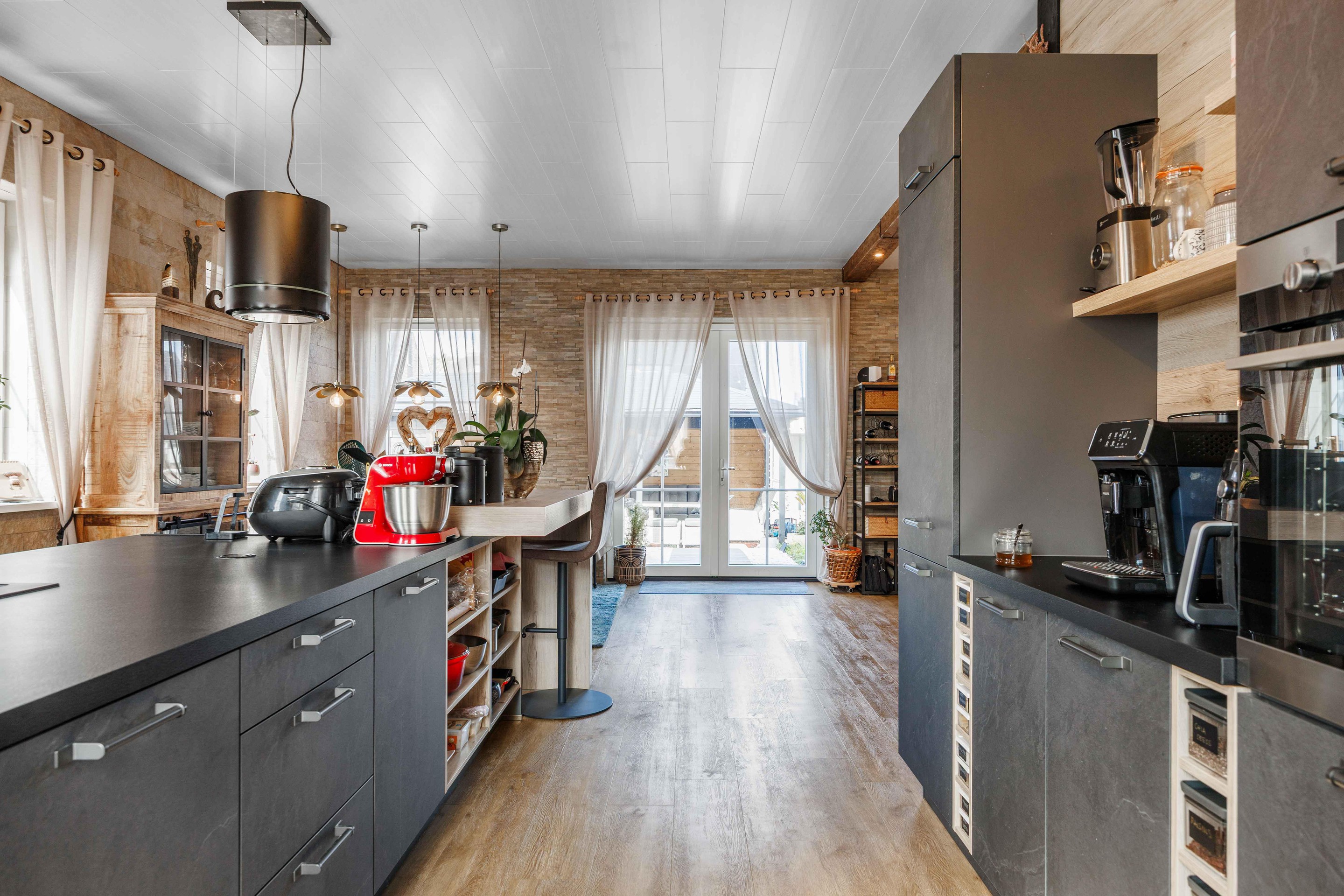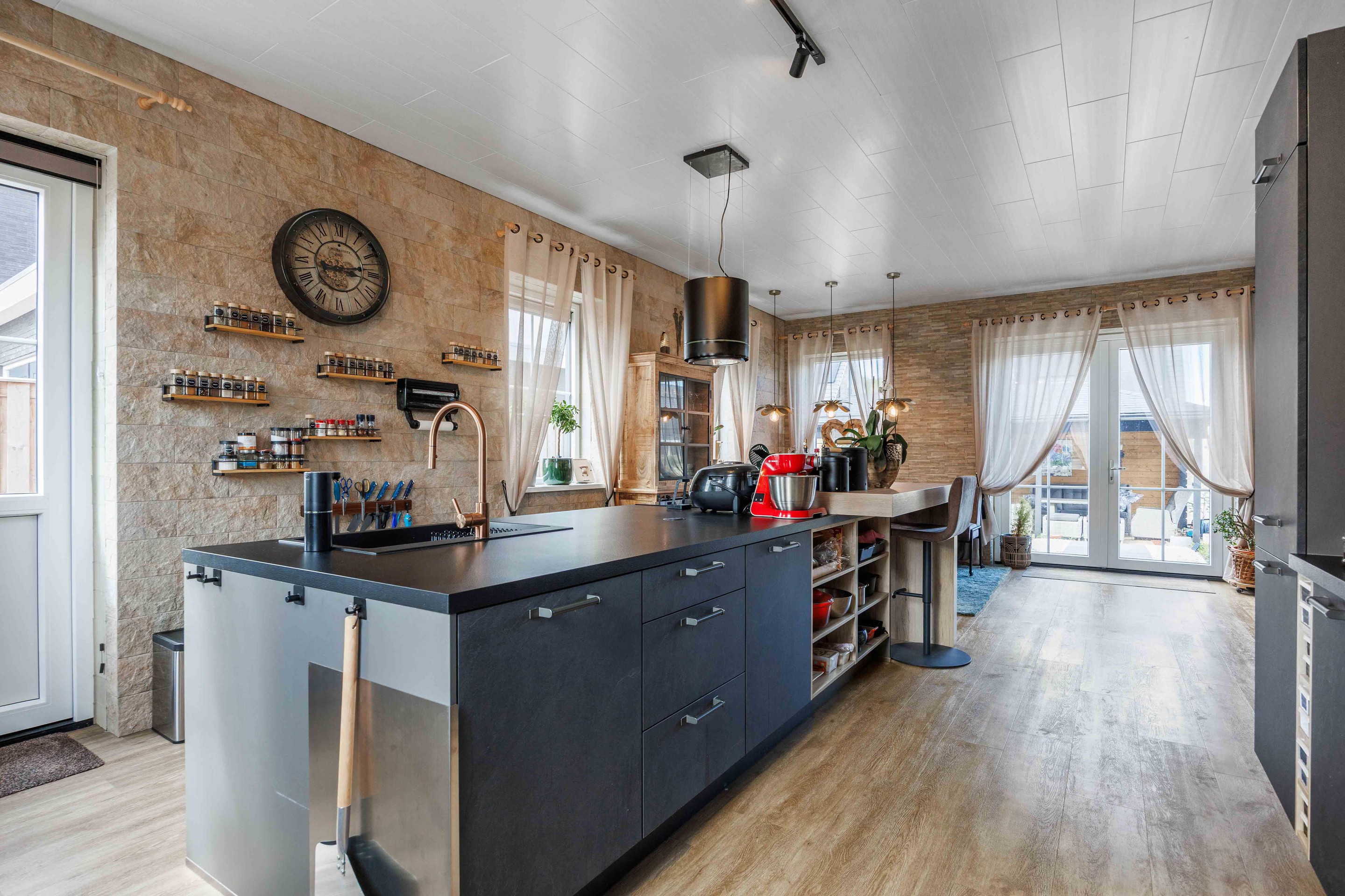 De luxe open keuken is het hart van de woning en is uitgevoerd met een stijlvol kookeiland, hoogwaardige inbouwapparatuur en veel opbergruimte. Het geheel vormt een eigentijdse leefruimte waar koken, gezelligheid en modern design samenkomen. Via de openslaande tuindeuren bereik je eenvoudig de achtertuin, waardoor binnen en buiten op een natuurlijke manier met elkaar verbonden zijn.