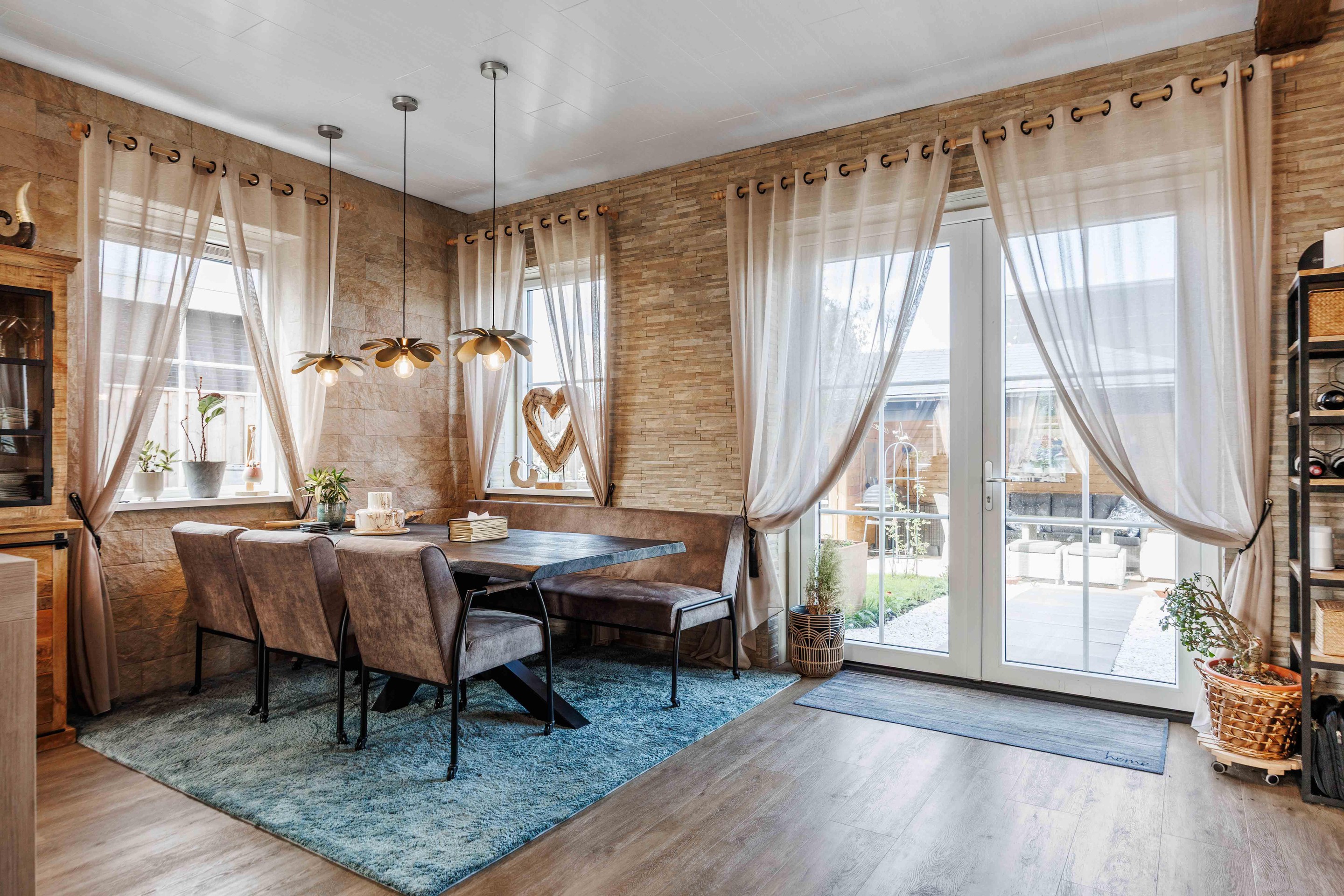 Aansluitend bevindt zich het eetgedeelte, waar ruimte is voor een royale eetopstelling. Dankzij de grote ramen met sierlijke raambekleding geniet je hier van veel natuurlijk licht. De open verbinding met de keuken zorgt voor een gezellige sfeer en maakt dit een ideale plek om uitgebreid te tafelen of gasten te ontvangen.