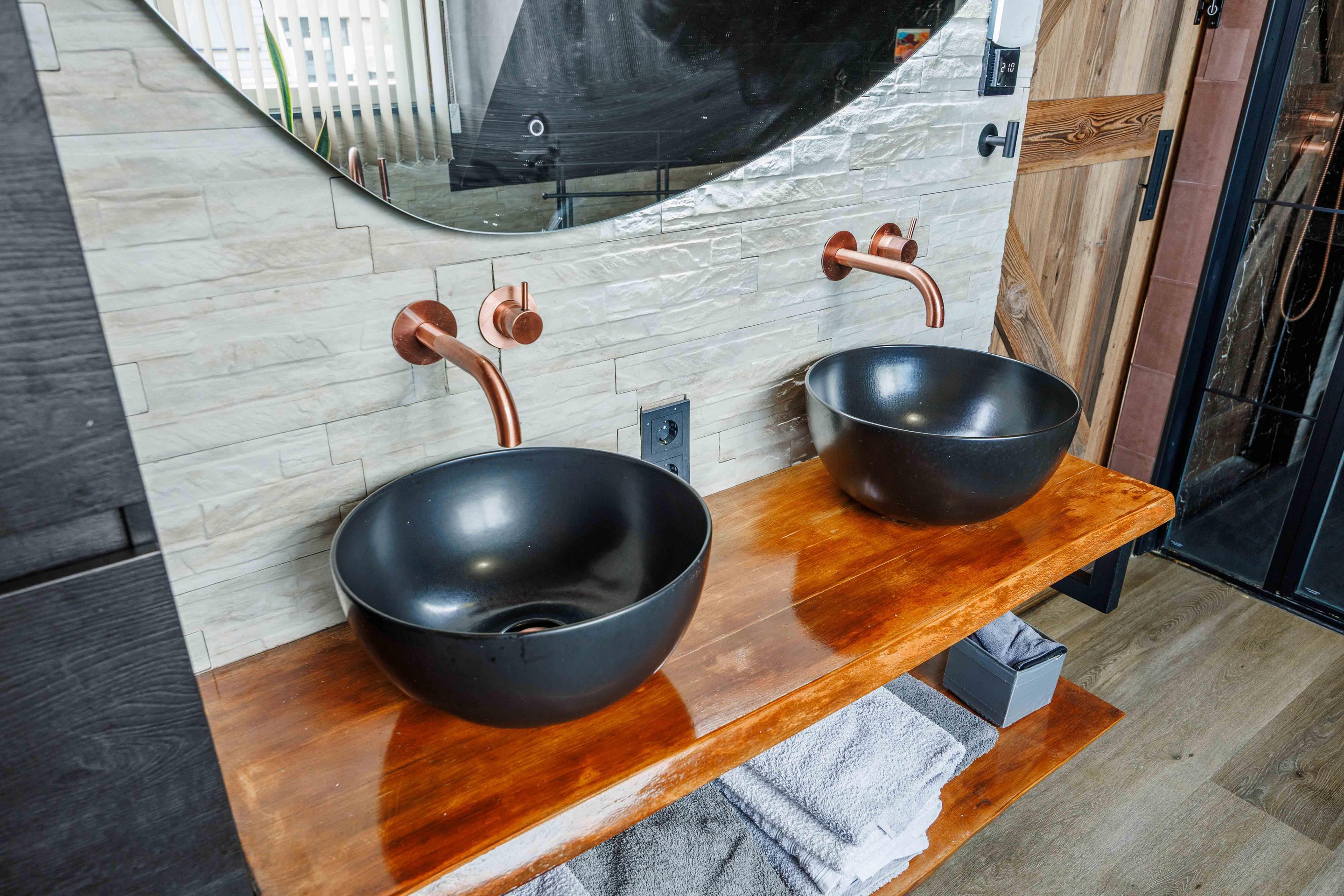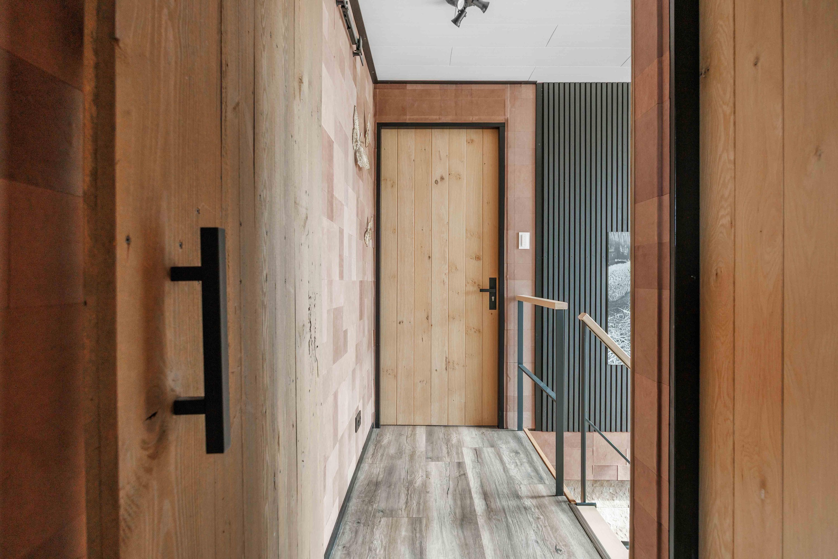 De luxe badkamer combineert moderne elegantie met stoere materialen. Direct in het oog springt de fraaie massieve houten schuifdeur, die perfect past bij de stijl van de woning. De ruimte is voorzien van een stijlvol vrijstaand ligbad, uitgevoerd in matzwart met een koperkleurige staande kraan, ideaal voor een ontspannen avond. Het dubbele wastafelmeubel met natuurstenen waskommen en bijpassende koperkleurige kranen zorgt niet alleen voor luxe, maar ook voor praktisch gemak. Daarnaast vind je hier een toilet en een ruime inloopdouche met regendouche, glazen deur en donkere marmerlook wandpanelen die de ruimte een chique uitstraling geven.