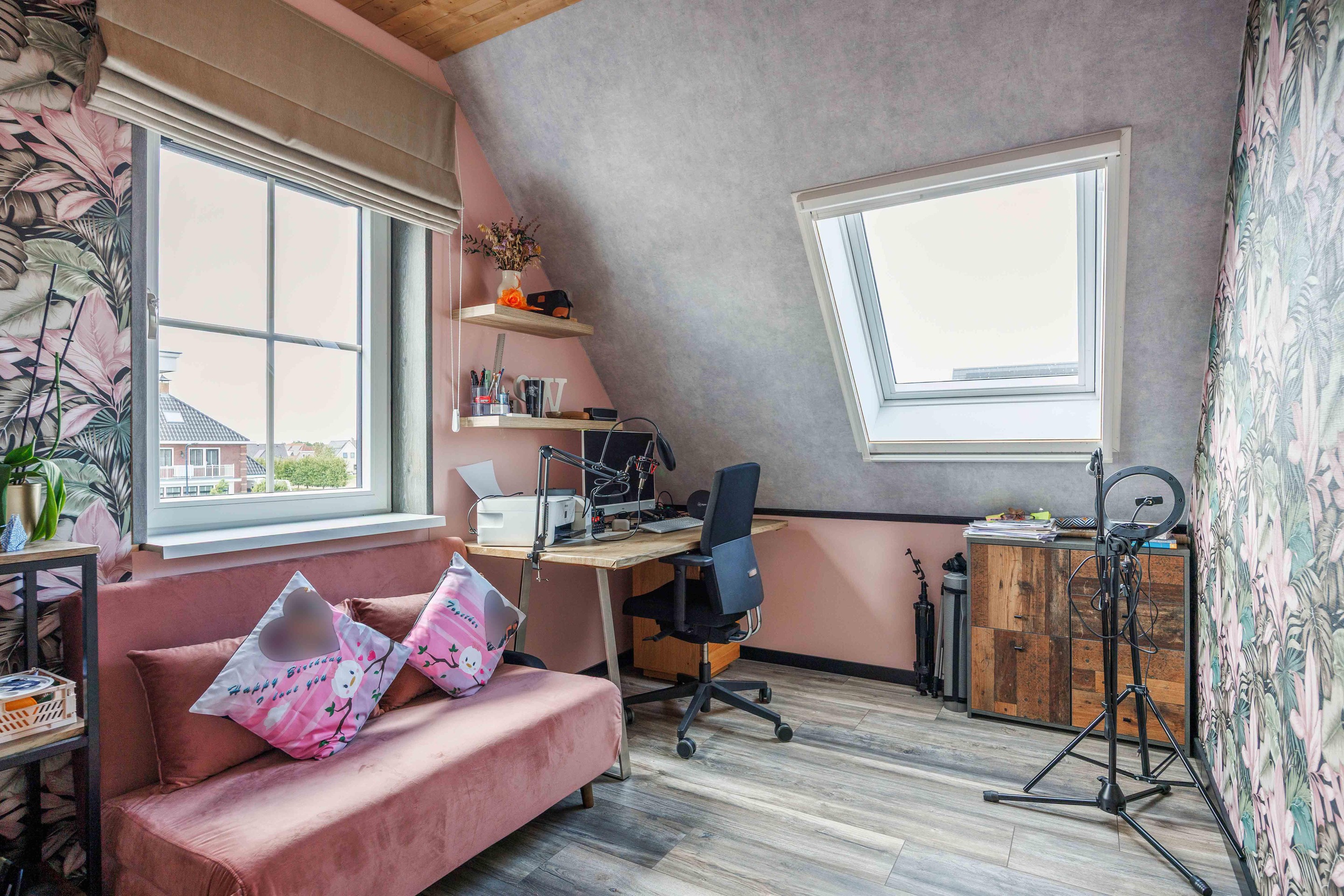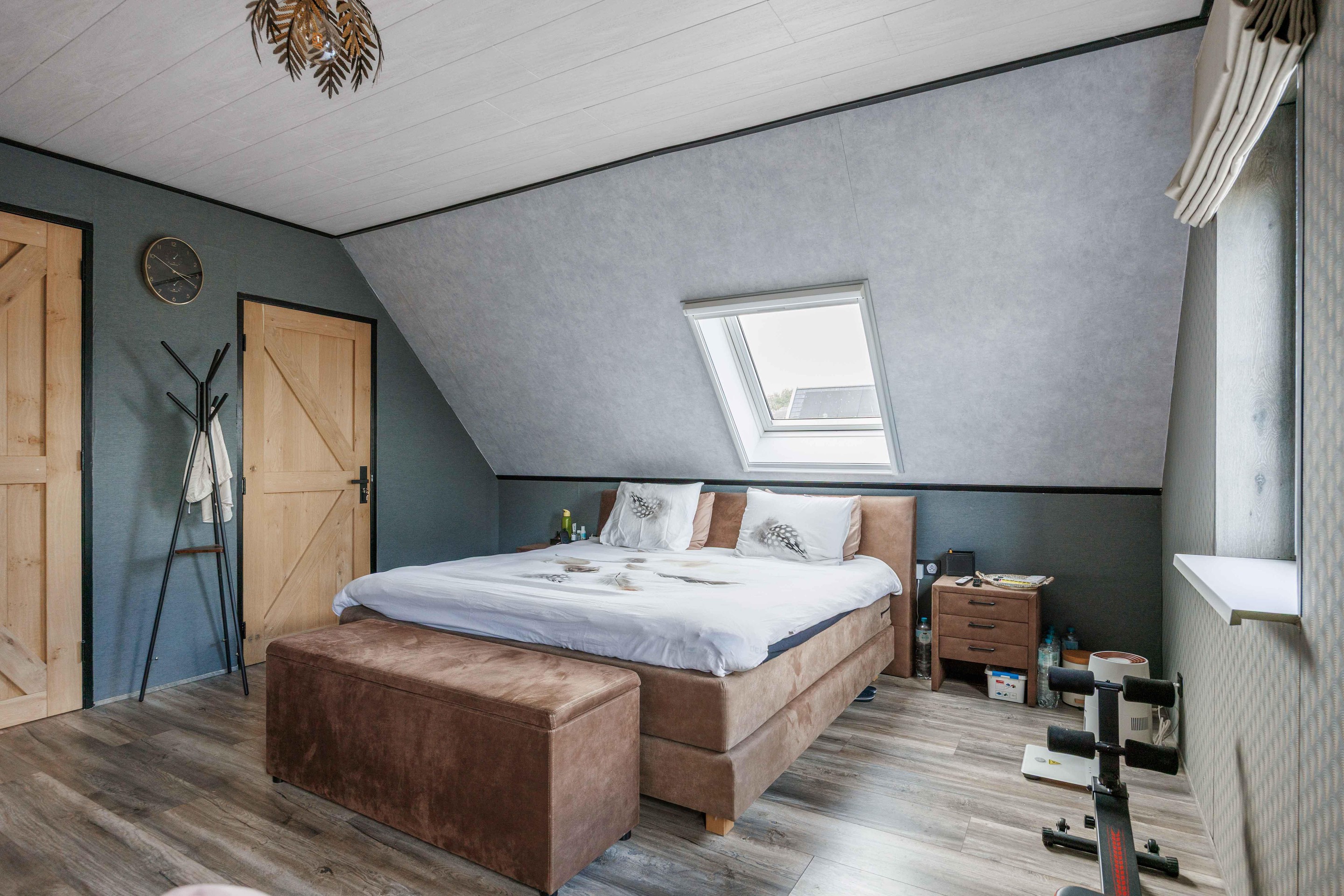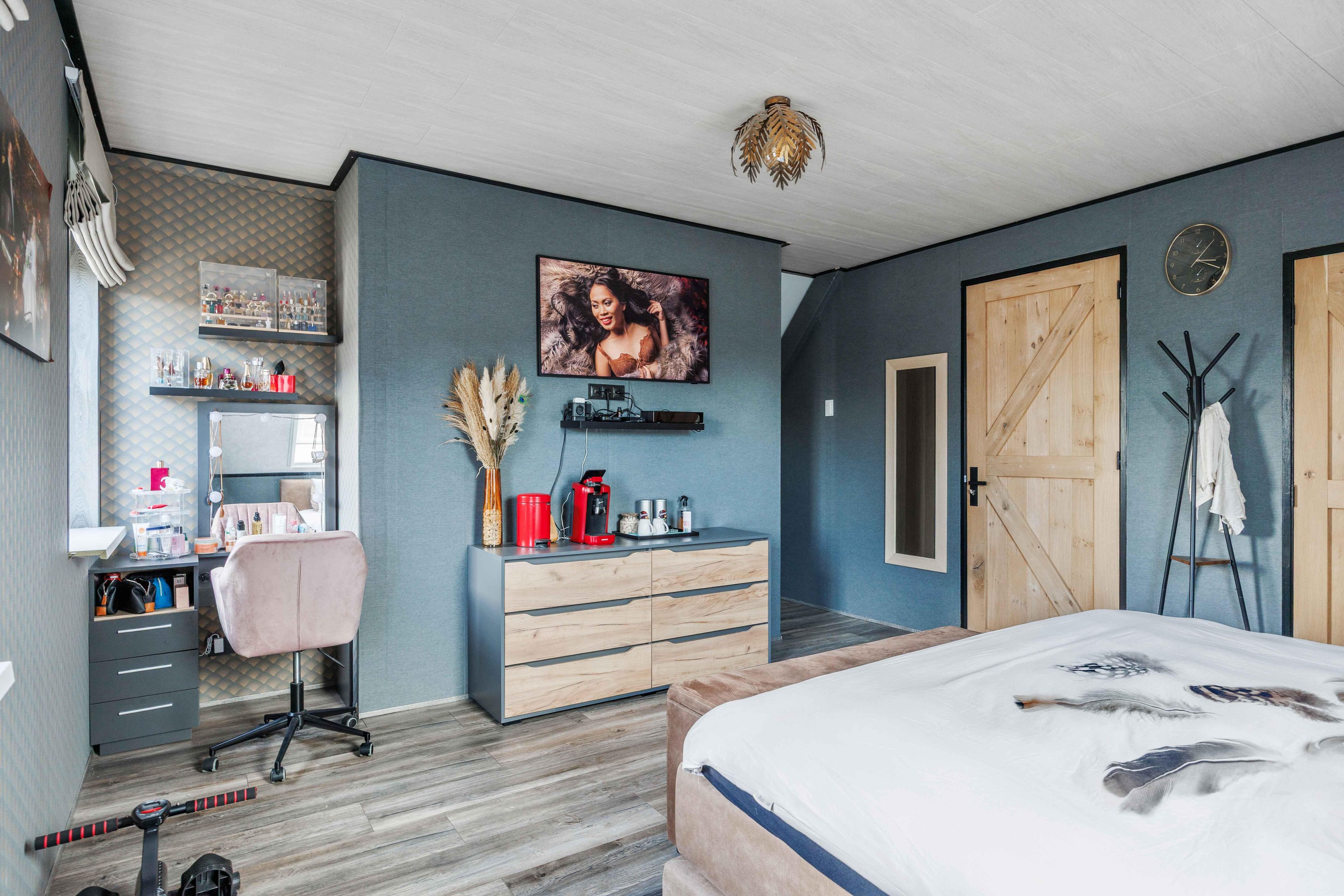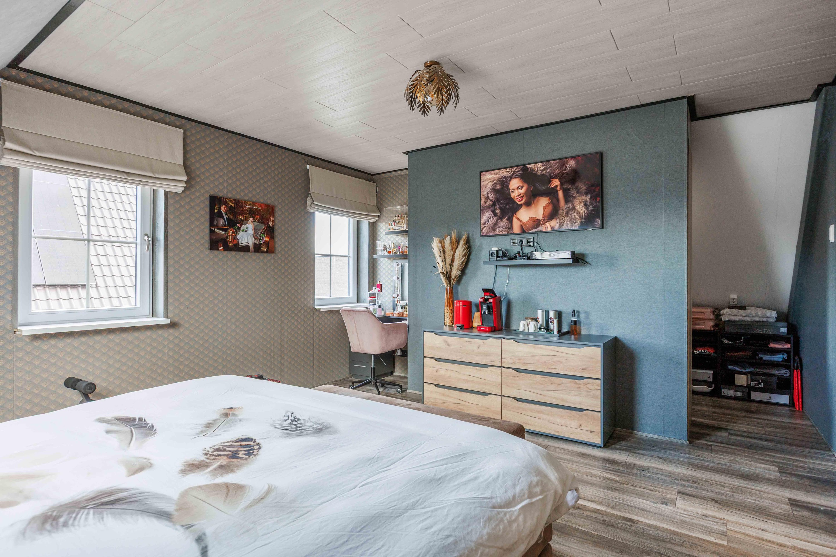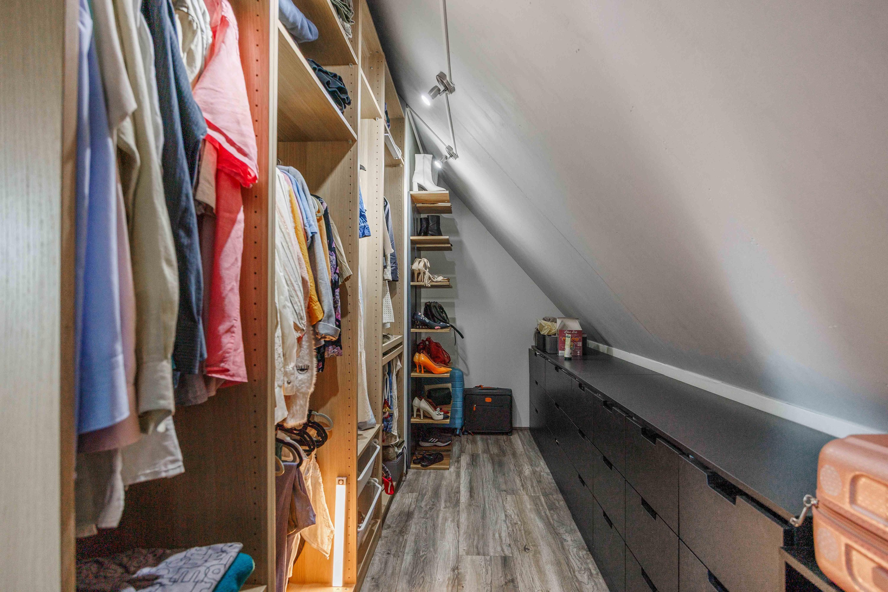 Op de eerste verdieping bevinden zich drie ruime slaapkamers, waaronder een indrukwekkende master bedroom van maar liefst ca. 26 m2. Deze is stijlvol afgewerkt met moderne wandbekleding in rustige tinten en een strak licht plafond. Dankzij de twee dakramen valt er veel daglicht binnen, wat de kamer een frisse en uitnodigende sfeer geeft. Er is volop ruimte voor een groot tweepersoonsbed en extra meubels, zoals een dressoir of een zitje. Vanuit de slaapkamer is direct toegang tot de luxe badkamer. Een absolute luxe is de aangrenzende inloopkast. Deze praktische ruimte is volledig ingericht met kasten en open schappen, waardoor er meer dan voldoende opbergmogelijkheden zijn voor kleding, schoenen en accessoires. Hier heb je alles netjes binnen handbereik. De andere kamers (ca. 8 en 10 m2) zijn ideaal als slaapkamer, gastenkamer of thuiswerkkantoor. Via een vlizotrap is de vliering te bereiken die als bergzolder gebruikt kan worden voor de niet-alledaagse spullen.